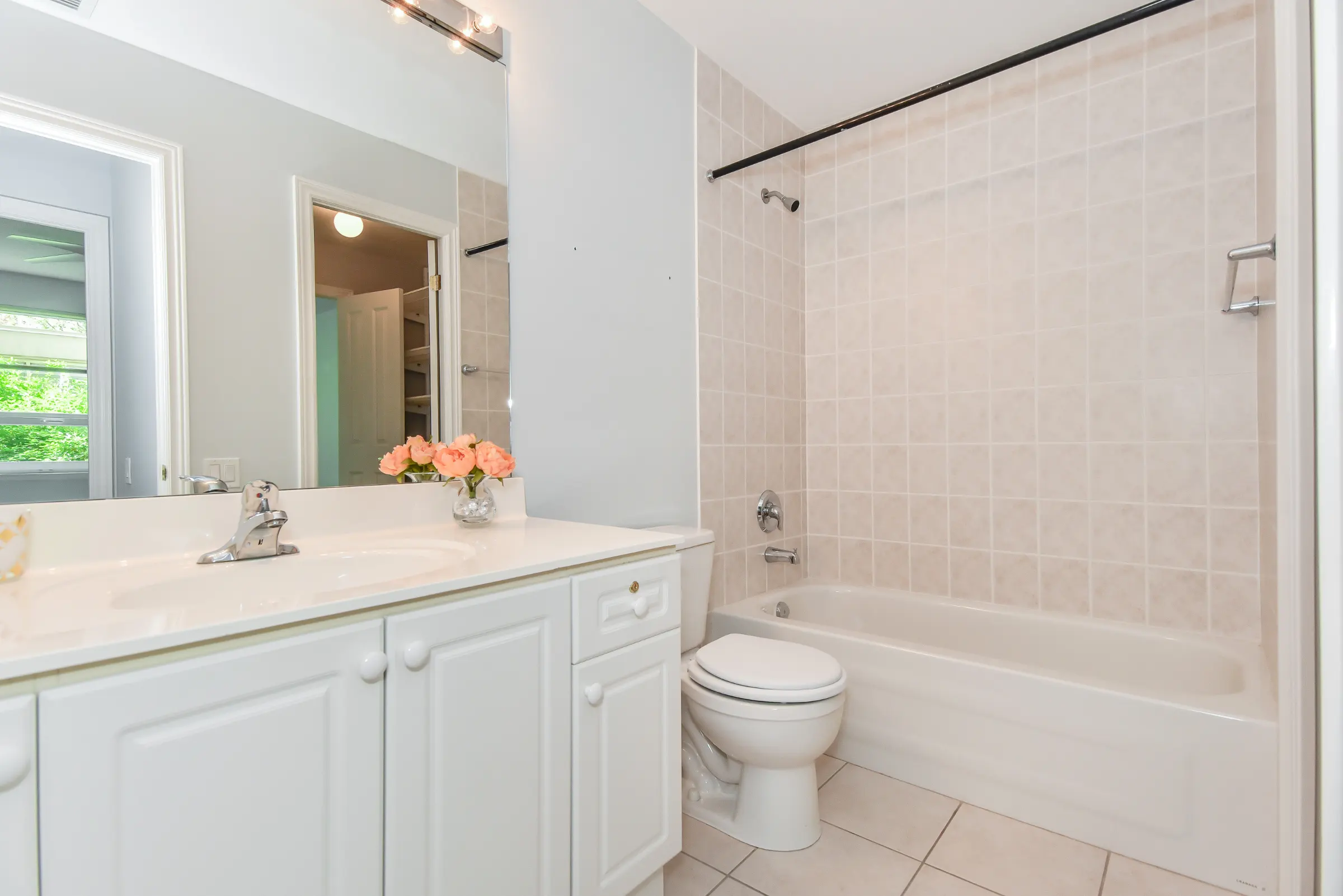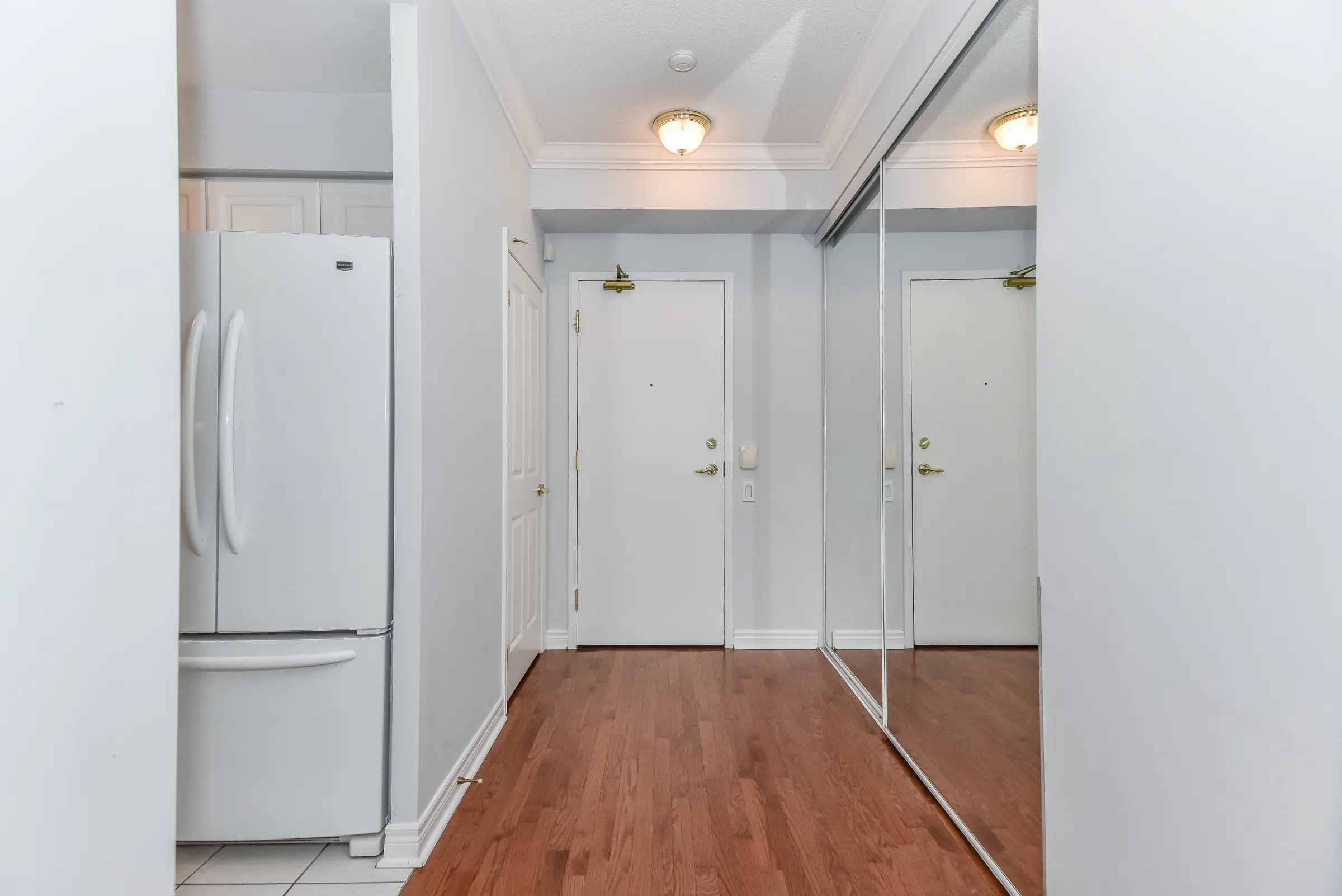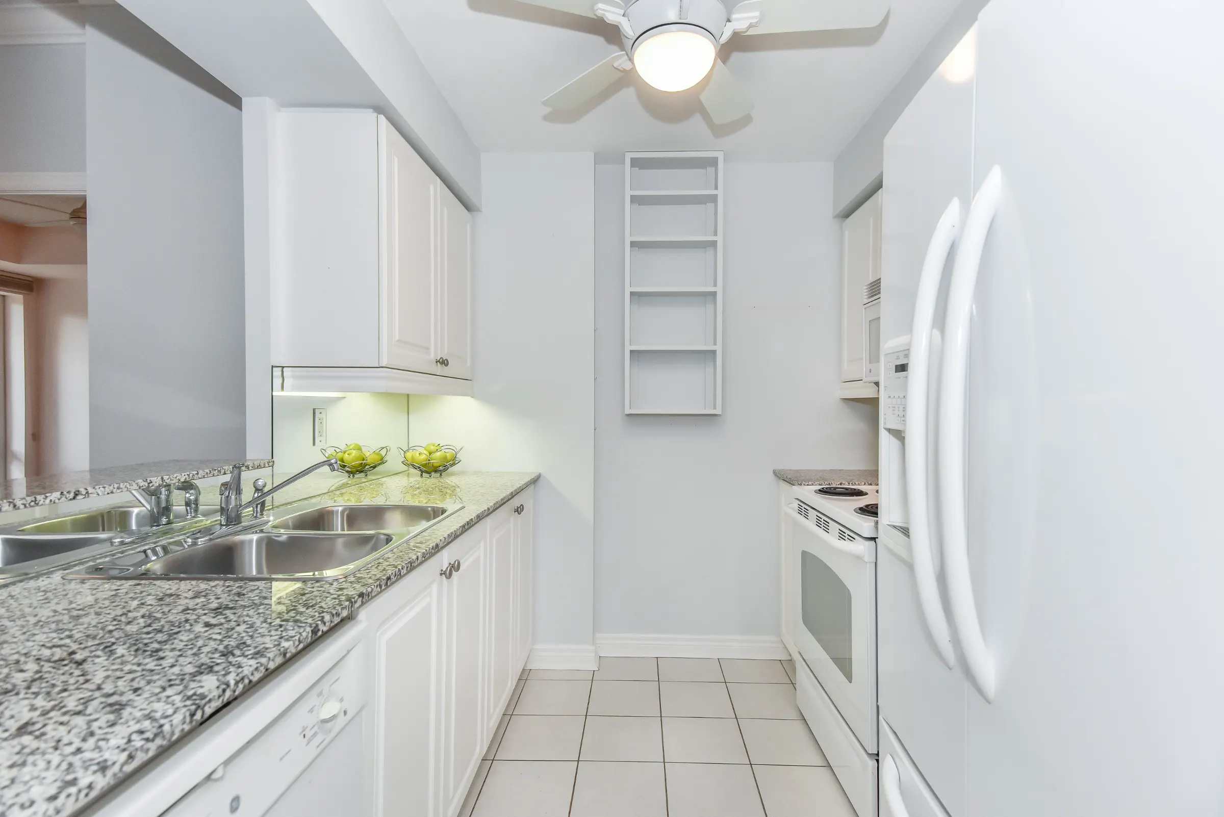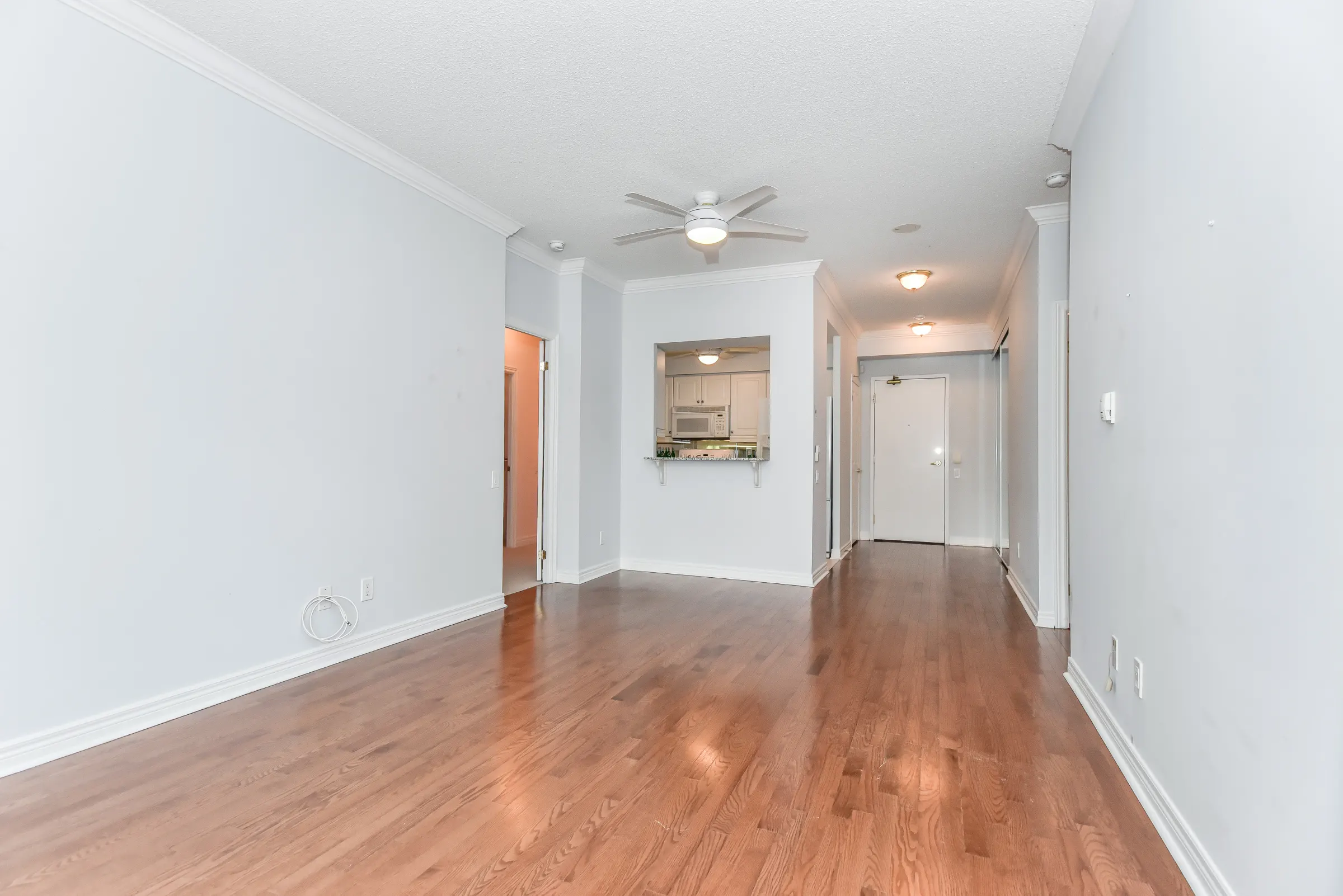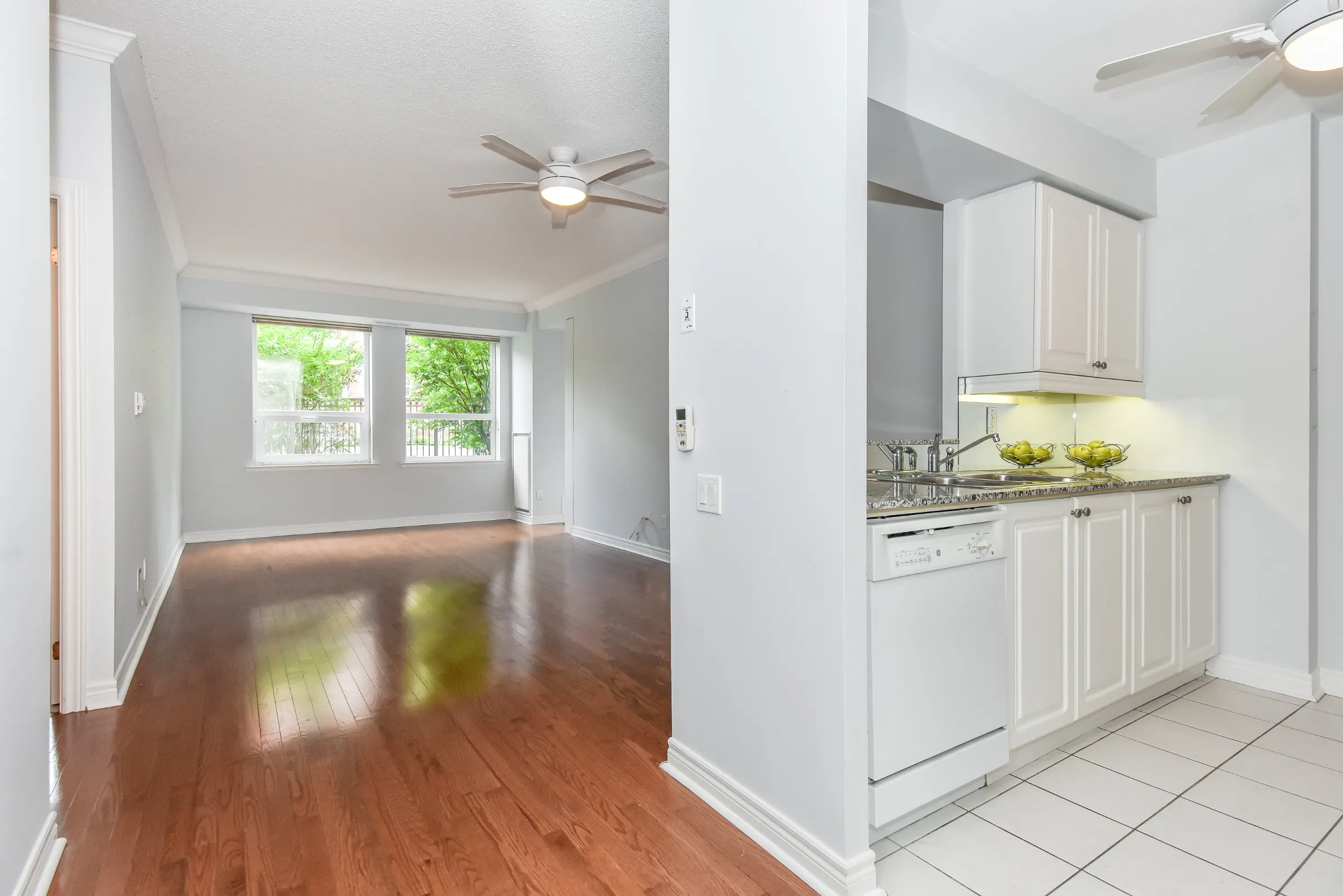 Inviting foyer with lustrous hardwood floor and double mirrored sliding closet doors with lots of shelving leads into the open concept layout with generous sized rooms. Kitchen features white cabinetry with ample cabinets & pullouts, granite counters and ceiling fan. Living/dining room combination with hardwood floor, crown moulding and ceiling fan with two large windows and walk out to the terrace and gorgeous lush gardens.