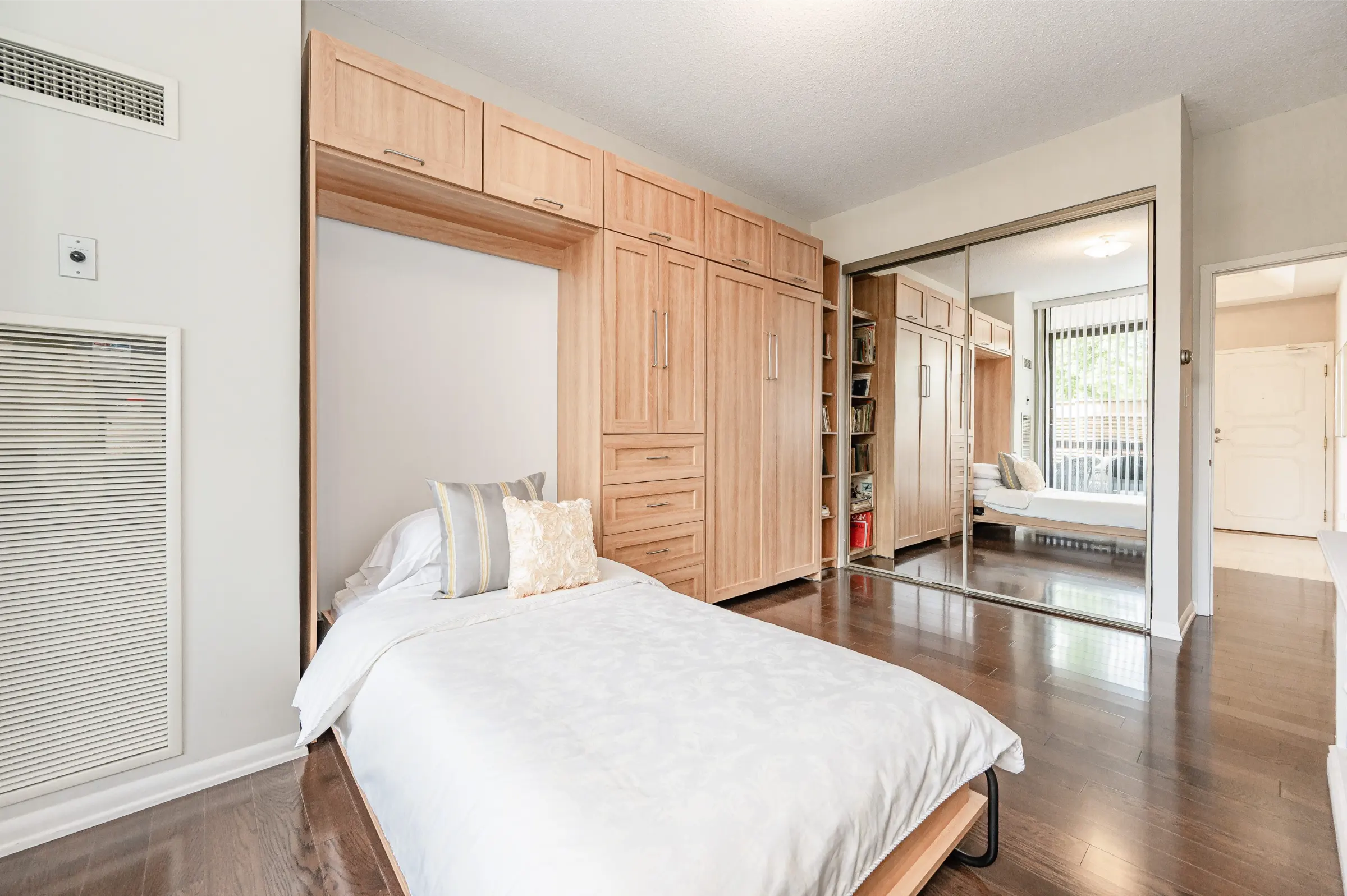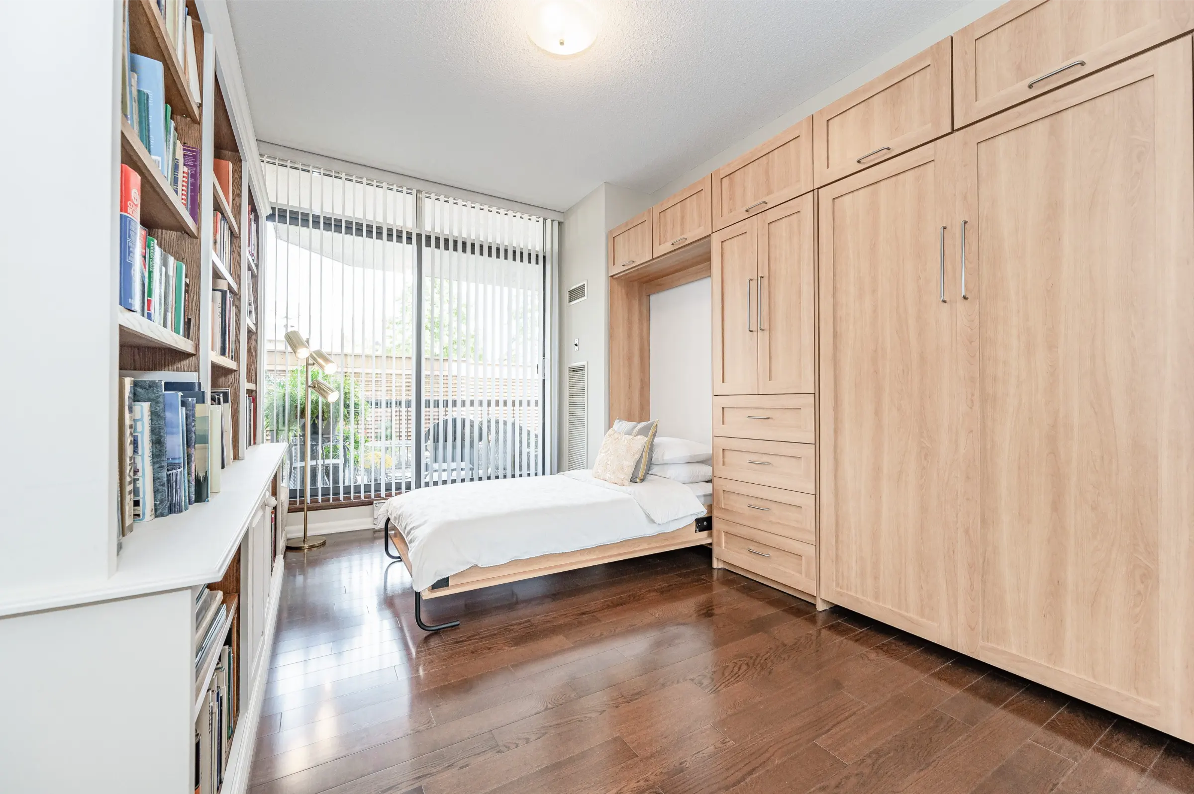 Grand primary bedroom retreat boasting a lavish 5-piece ensuite with a natural stone double vanity, makeup area, soaker bathtub, glass walk-in shower & 2 large mirrored sliding door closets. Second bedroom offering a custom built-in wall unit housing 2 single murphy beds. A 4-piece main bathroom, laundry room with cabinetry, & large storage room complete this amazing home. One owned underground parking space plus exclusive use locker.