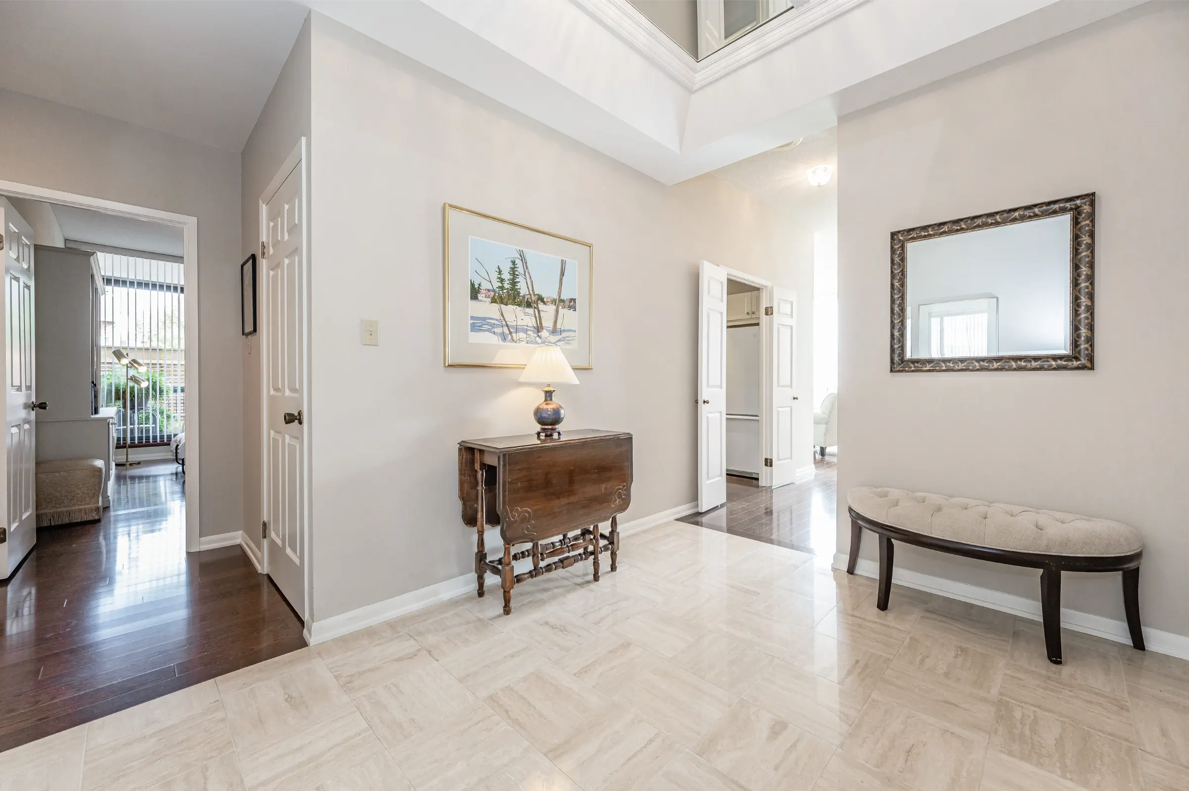 Rarely offered, beautiful, elegant suite boasting unobstructed south facing views of Lake Ontario & spectacular gardens. The sought after ‘Ennisclare’ model offering 1969 square feet & 9’ ceilings, with no step down. Updated unit featuring generous sized rooms filled with an abundance of natural day light, neutral décor, hardwood & marble floors, floor to ceiling windows, crown moulding, wainscotting, pot lights, ample storage & much more.