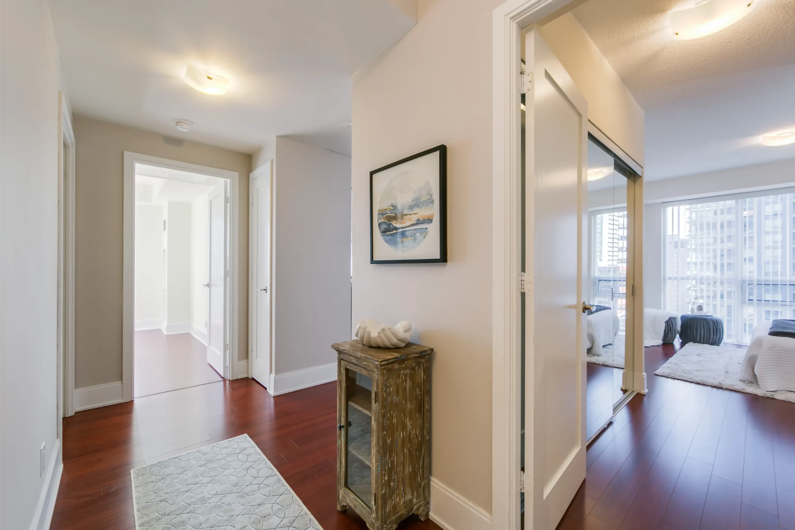 Impressive inviting large foyer leads into the stunning bright open concept unit with beautiful hardwood floors, floor to ceiling windows & freshly painted neutral decor. Updated kitchen boasting granite counters, stainless steel appliances, ample drawers, cabinets, pantry & breakfast bar. Entertainment size dining room overlooking the spacious living room with floor to ceiling windows & glass sliding door with walkout to the private balcony.