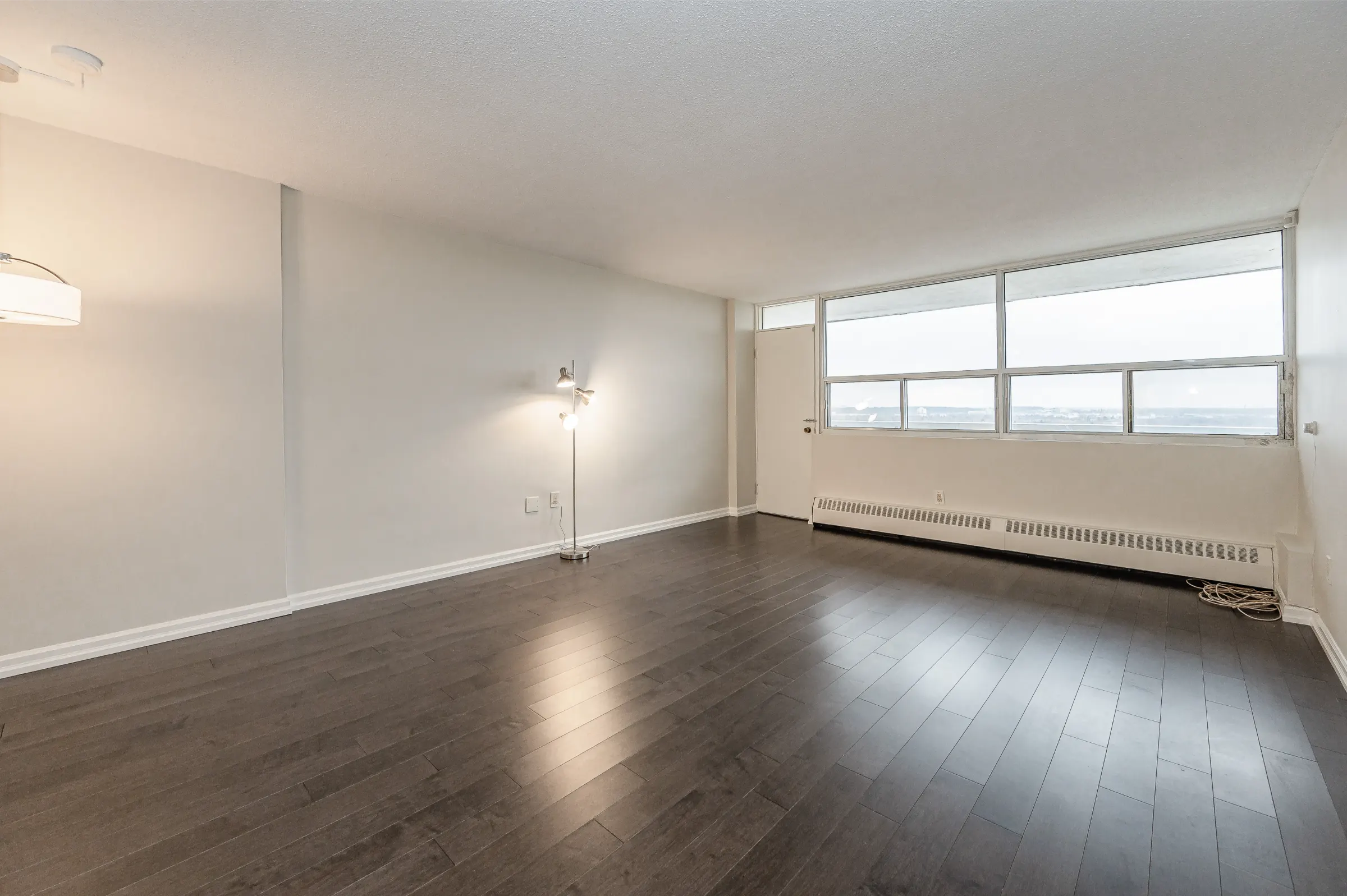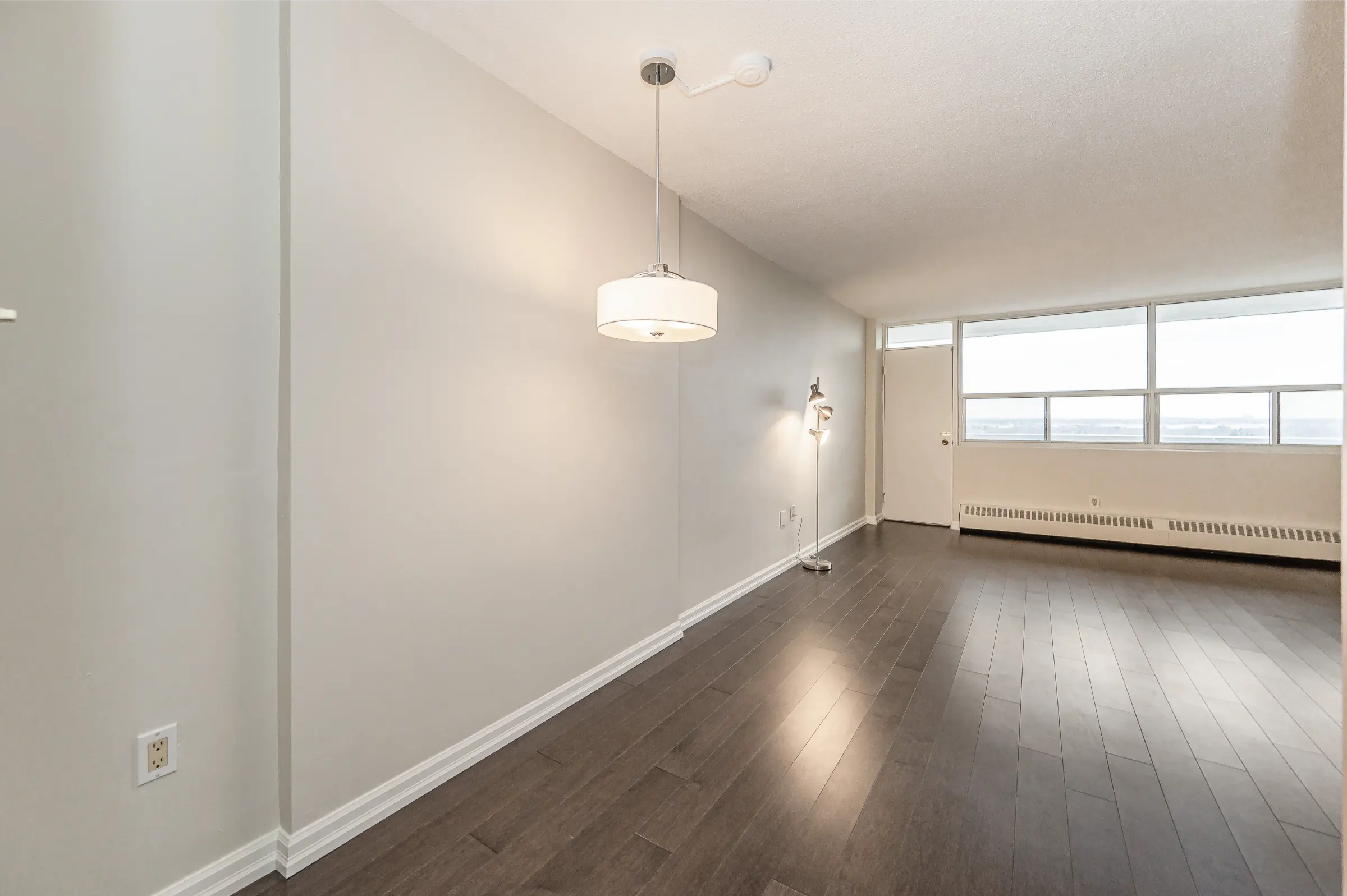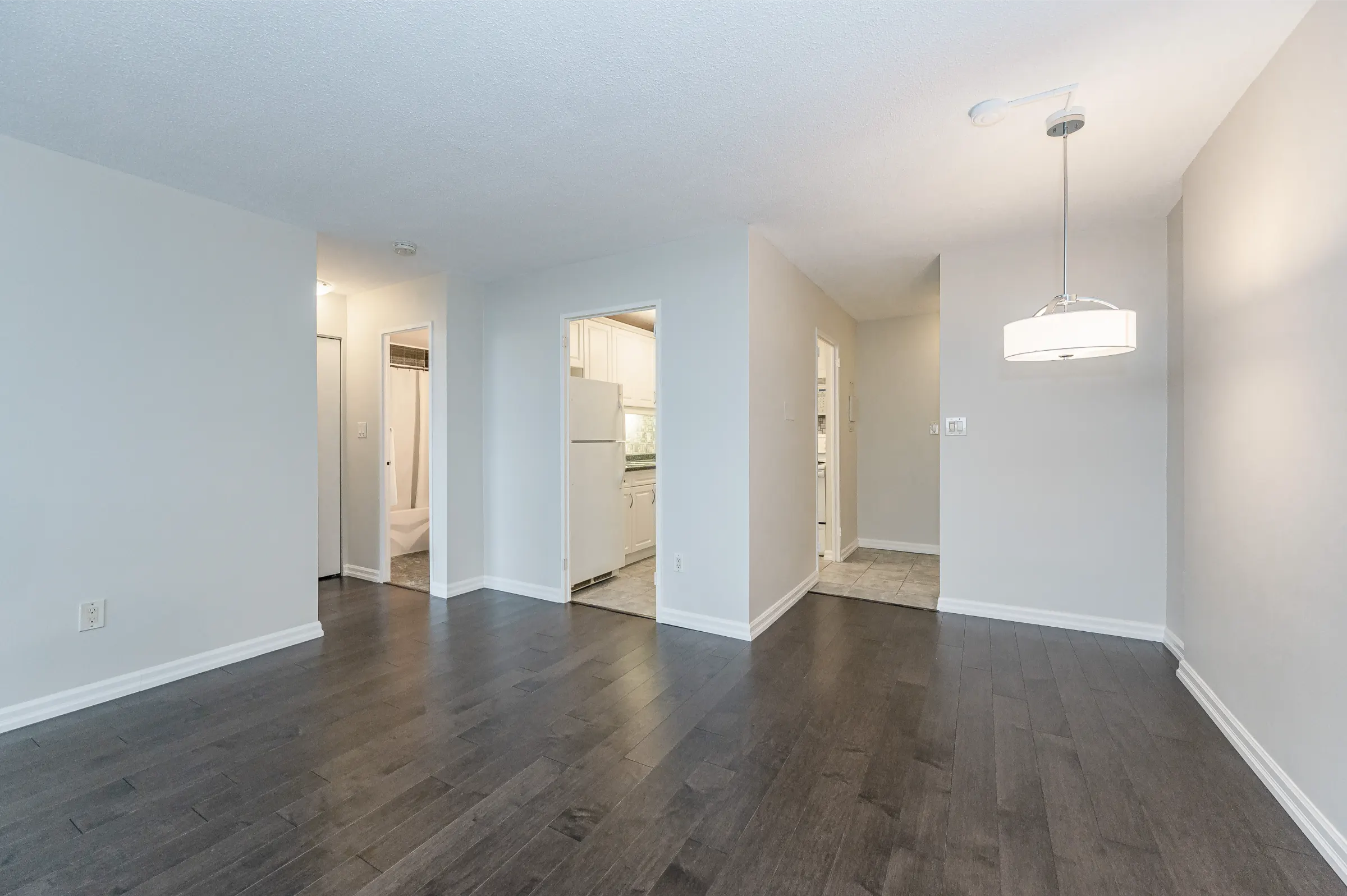 Updated kitchen with white cabinetry including ample cupboards, pullout drawers, pantry, backsplash and plenty of counter space. Open concept dining room with new modern light fixture overlooks the spacious living room with new lustrous hardwood floors, large windows and walk out to balcony with magnificent tranquil views. Master bedroom retreat featuring new hardwood floor, ceiling fan, sliding closet doors and large window. Updated 4-piece main bathroom with sink/vanity, medicine cabinet & tub/shower combination. Fresh neutral décor paint throughout.