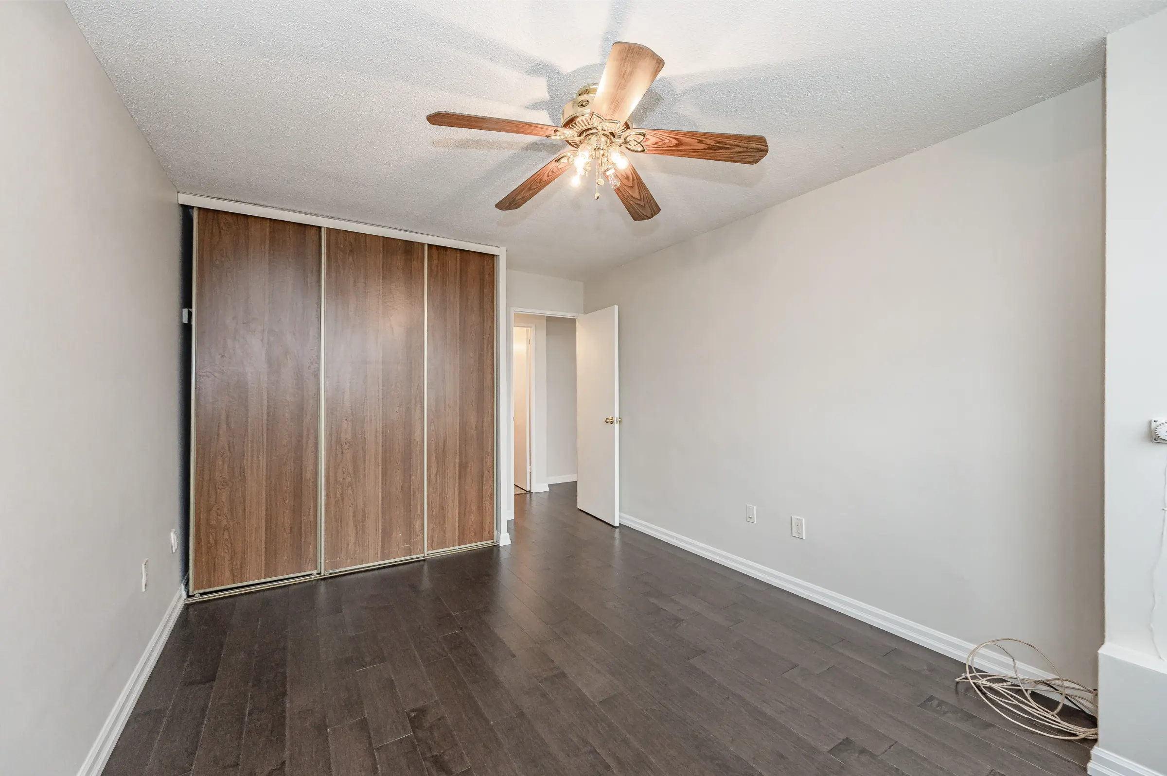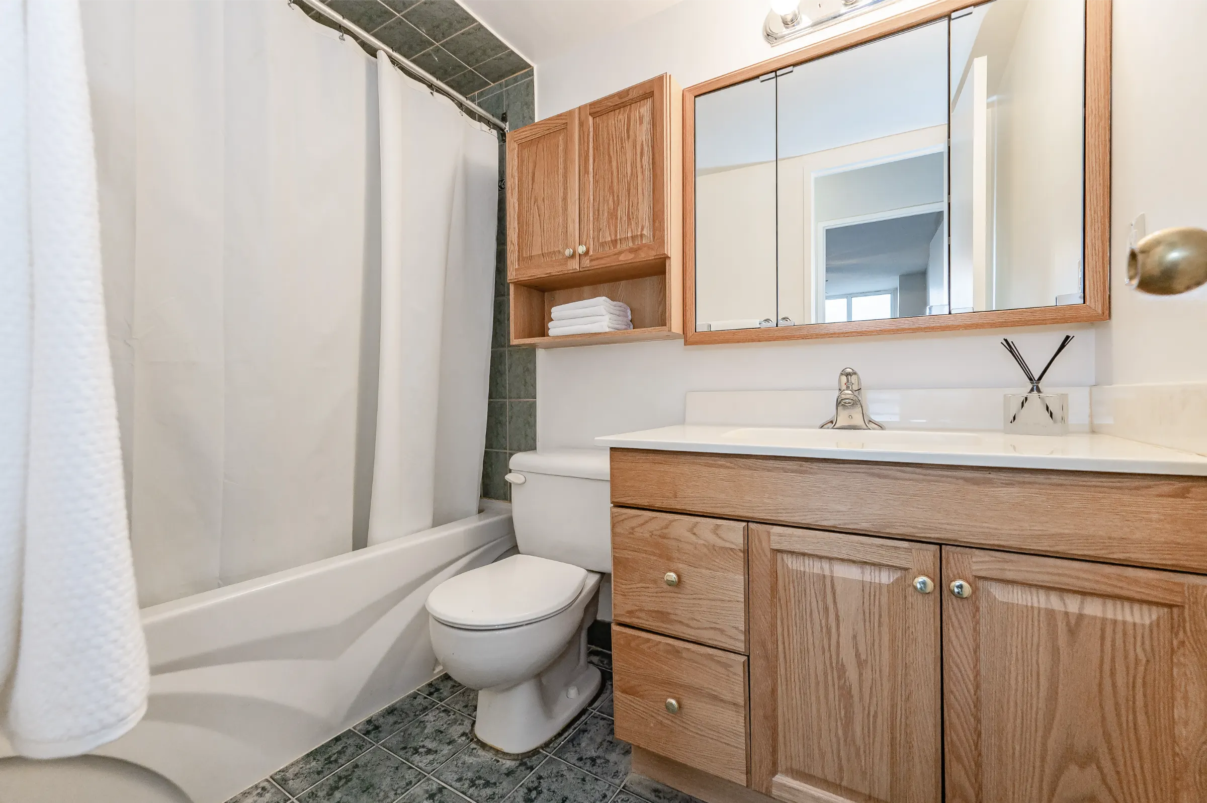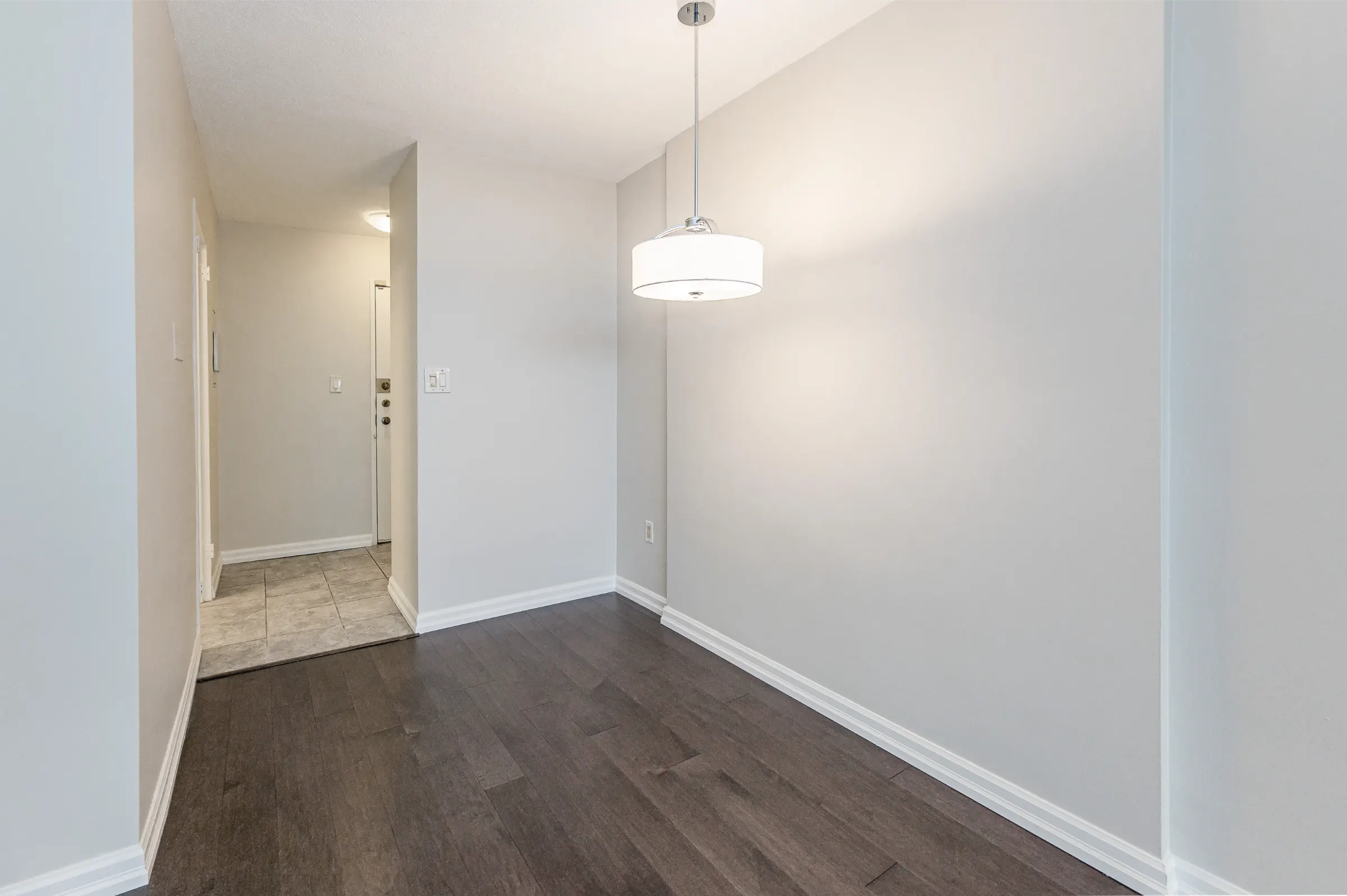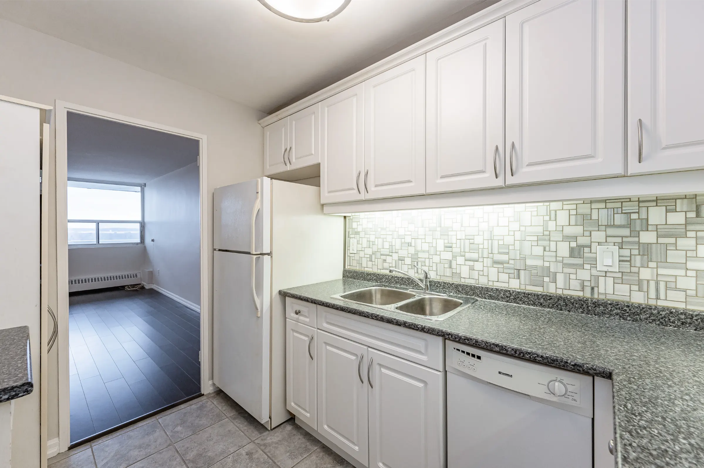 Updated kitchen with white cabinetry including ample cupboards, pullout drawers, pantry, backsplash and plenty of counter space. Open concept dining room with new modern light fixture overlooks the spacious living room with new lustrous hardwood floors, large windows and walk out to balcony with magnificent tranquil views. Master bedroom retreat featuring new hardwood floor, ceiling fan, sliding closet doors and large window. Updated 4-piece main bathroom with sink/vanity, medicine cabinet & tub/shower combination. Fresh neutral décor paint throughout.