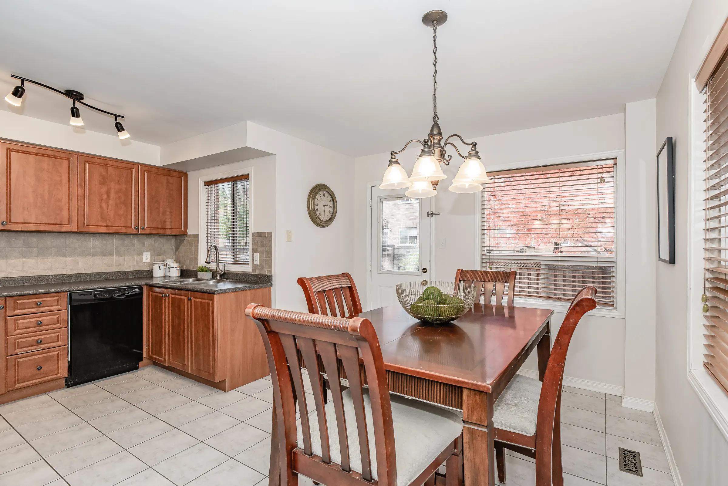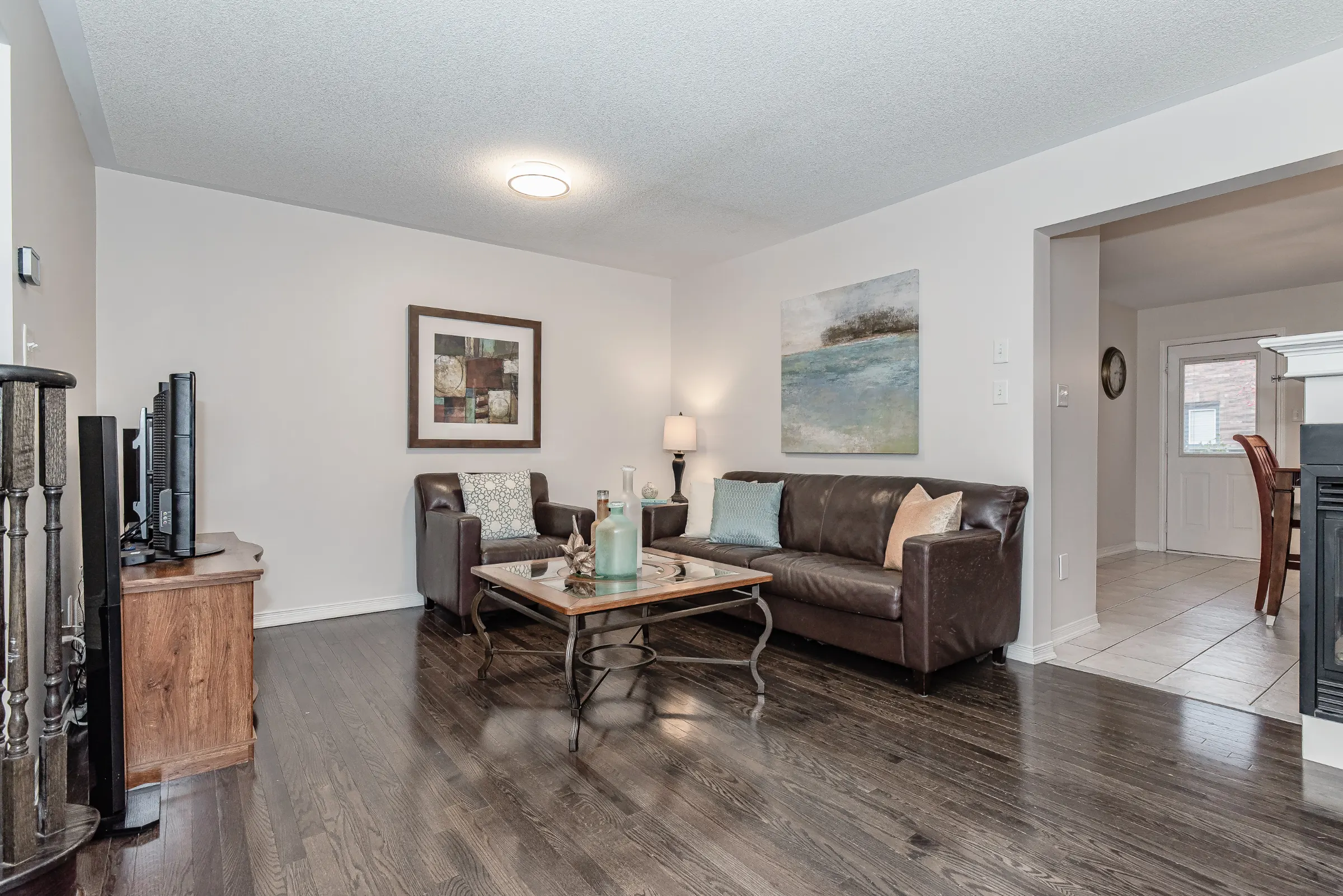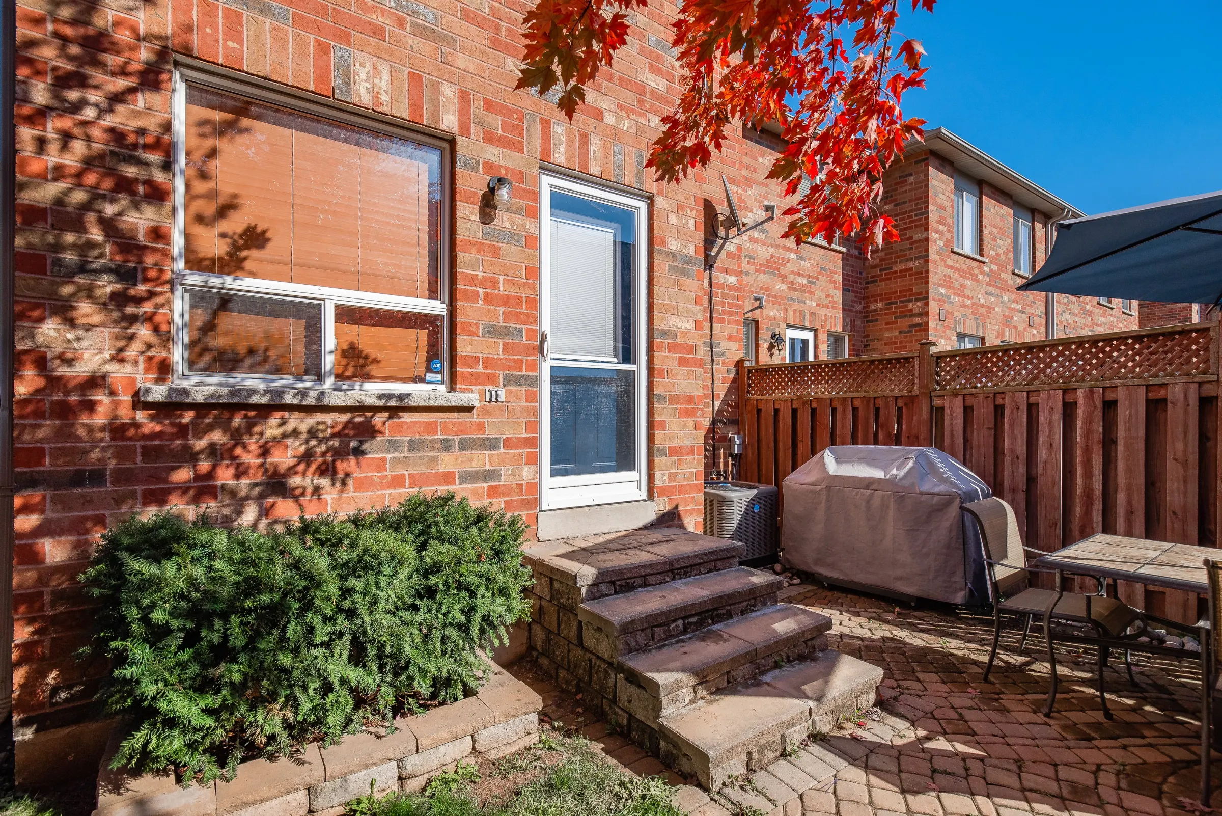 Stylish brick exterior façade with inviting interlock walkway to the covered front porch. Deluxe entry door with glass insert opening to the spacious foyer with mirrored sliding closet doors. The combined living, kitchen and dining rooms are configured perfectly for entertaining and everyday family life. Generous kitchen and dining area filled with an abundance of natural daylight boasting ample windows and walkout to private tree covered back yard and patio with new fence. Open concept living room featuring a gas fireplace and dark stained hardwood floors. Convenient powder room and inside entry to the attached garage.