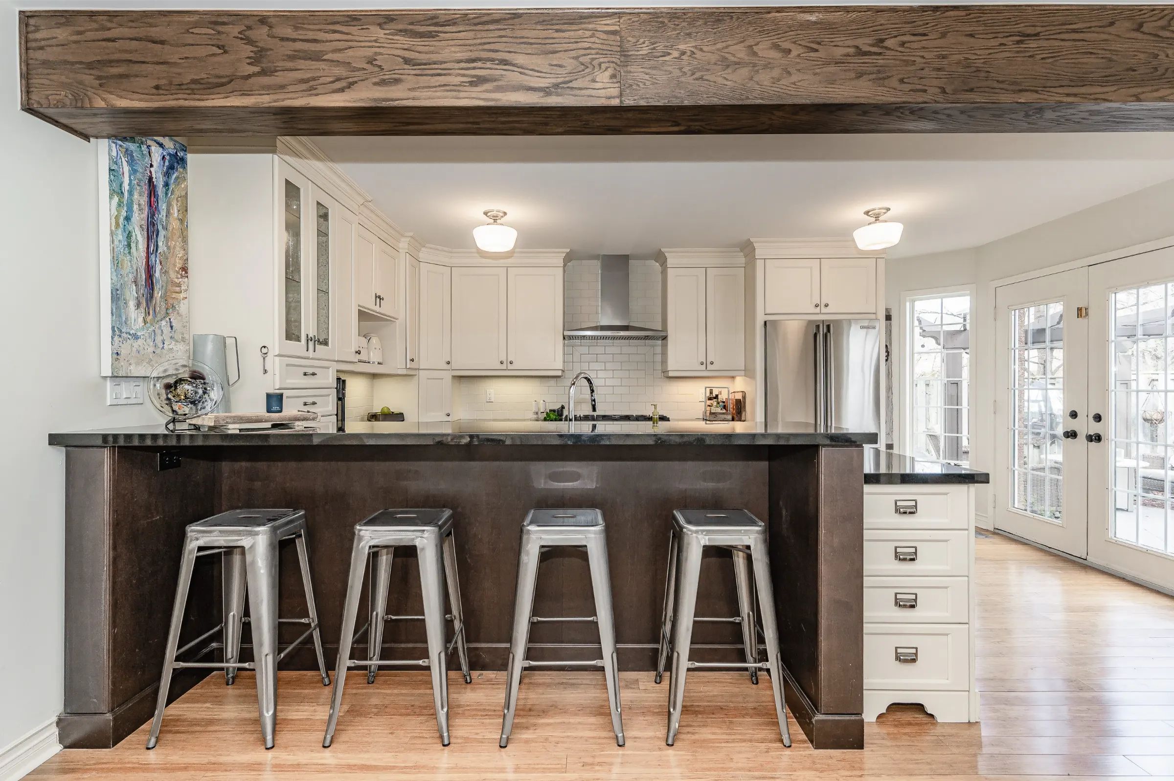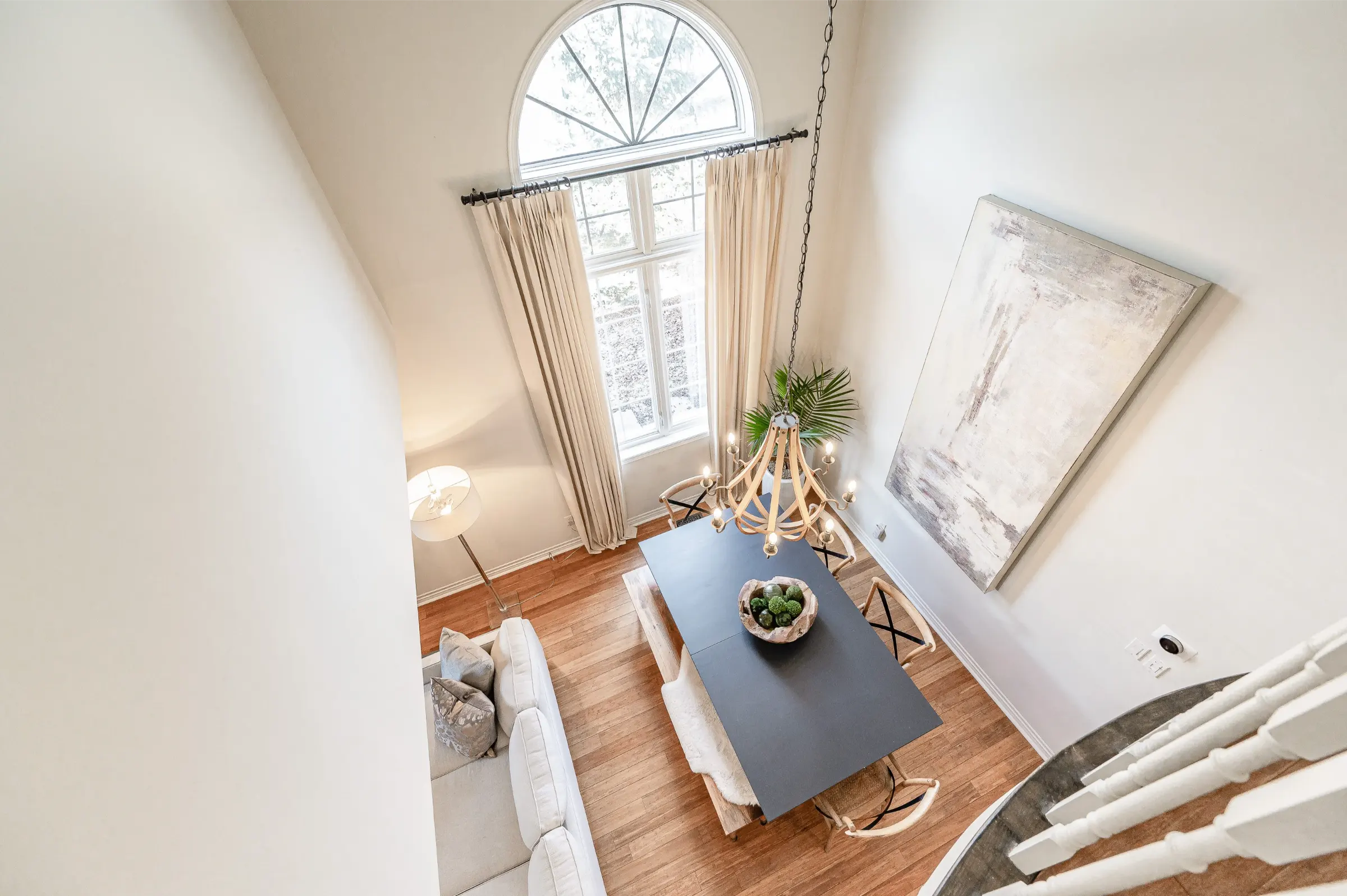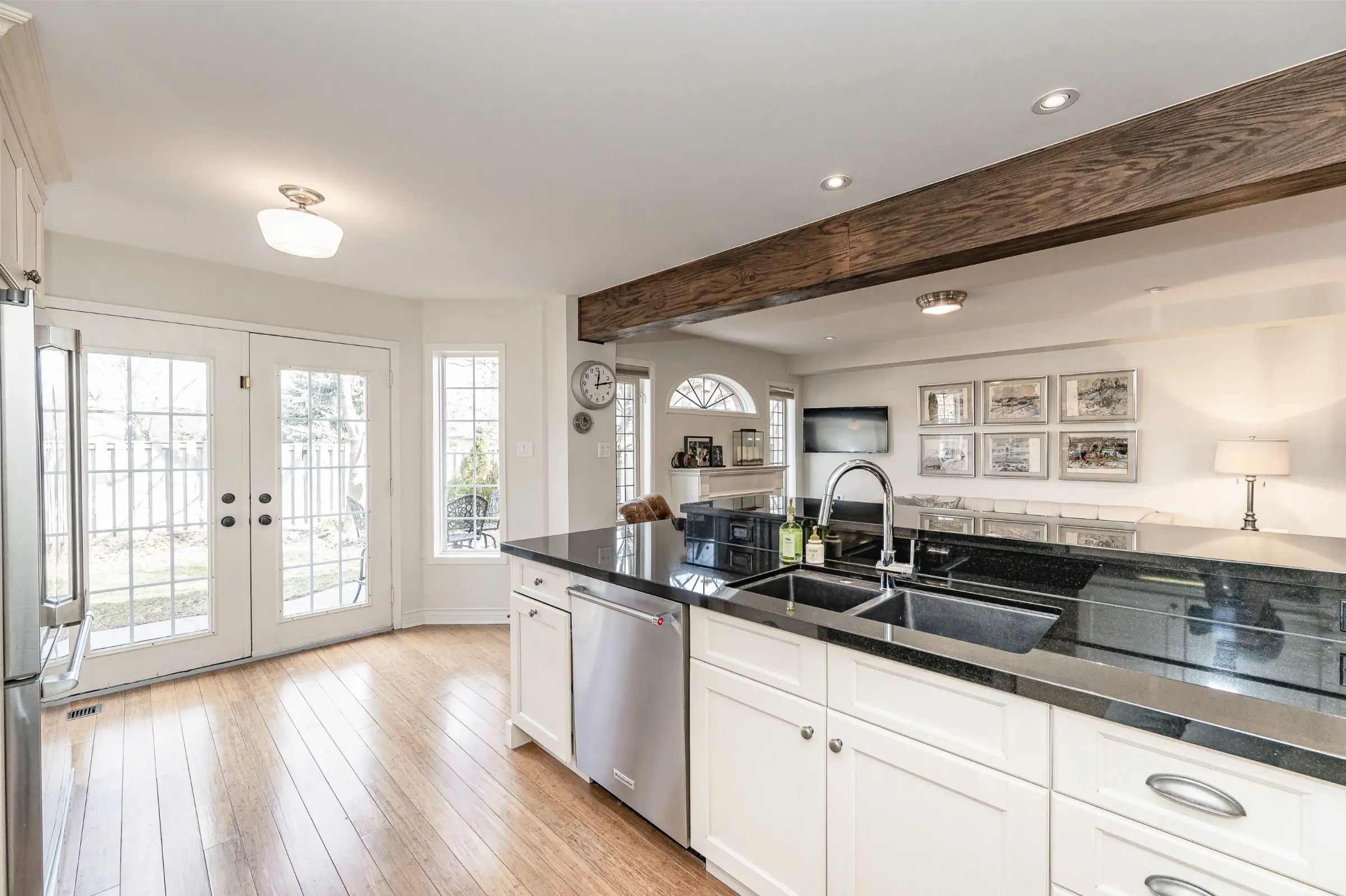 The inviting bright foyer opens to the entertainment sized formal living room overlooking the dining room boasting a vaulted ceiling & magnificent Palladine arched window. Gorgeous chef inspired kitchen features a well-crafted exposed beam & custom Cabico birch lined, soft close cabinetry with dovetail drawers. Equipped with high end stainless-steel appliances, back splash, granite counters & massive peninsula with breakfast bar. The double glass door walkout leads to the sunny backyard with large stone patio, pergola, gas hook up for bbq & lots of room for play area. Adjoining family room provides plentiful windows & a gas fireplace with stylish mantel surround. Convenient 2-piece powder room, laundry room & inside entry to garage.