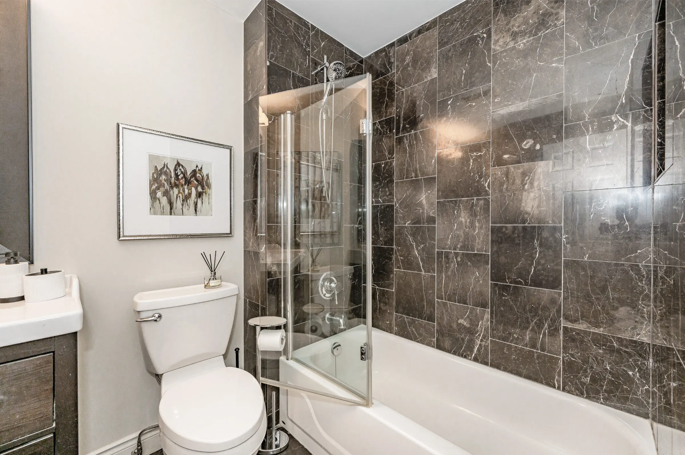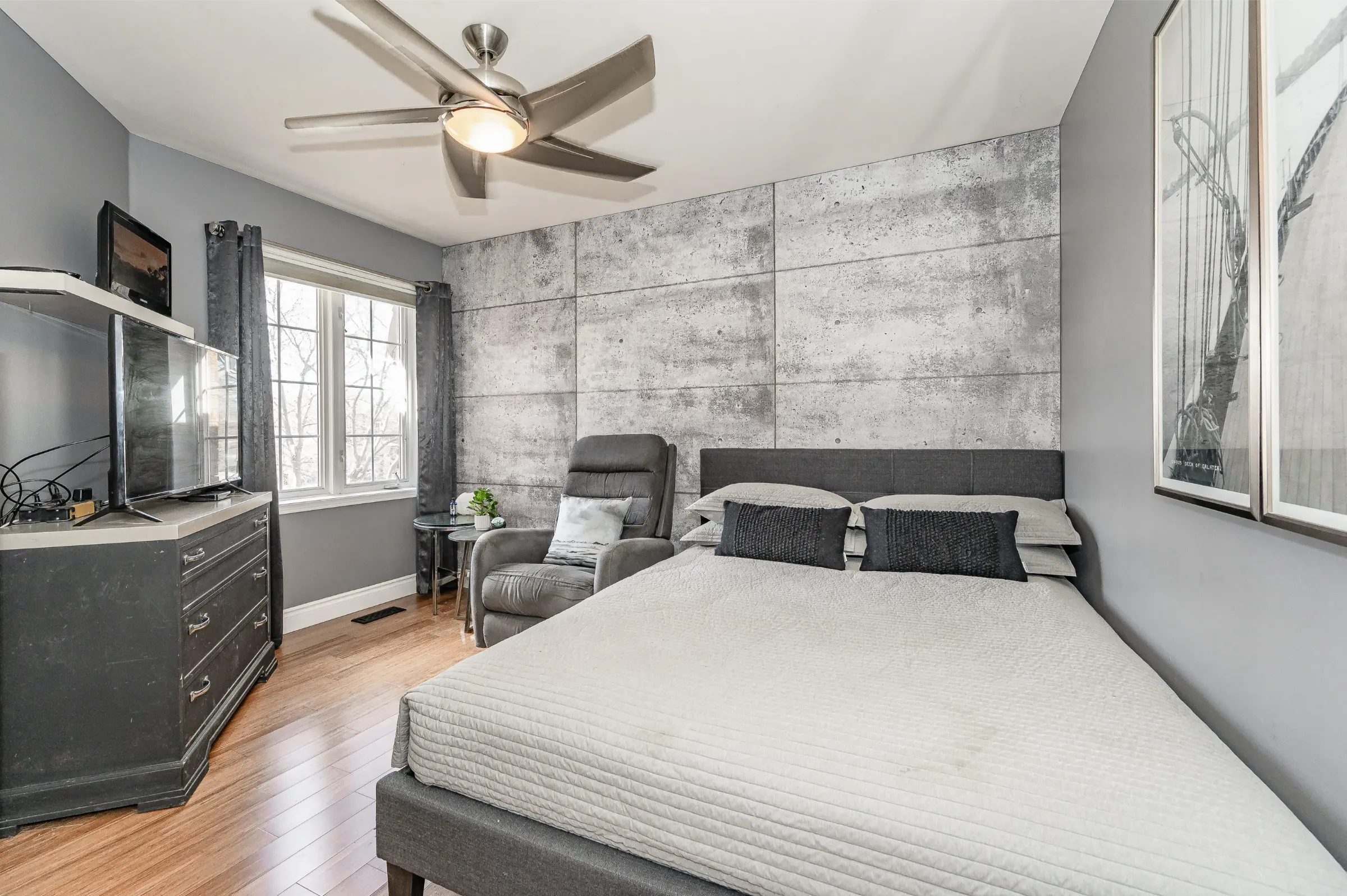 The second level hosts an impressive staircase & juliette balcony overlooking the main floor. Spacious master bedroom retreat presenting a walk-in closet complete with custom PAX closet organizers & exquisite chandelier. The lavish spa like 4-piece ensuite is outfitted with a heated floor, marble top vanity, oversized glass walk-in shower & stand-alone bathtub with stunning wall feature. Two additional generous sized bedrooms with large windows, ceiling fans & closets, one showcasing a vaulted ceiling. The chic 4-piece main bathroom offers marble floor & tub surround & built-in storage cabinet. A linen closet & laundry chute complete this floor. The lower level features a large recreation room with custom built-in bar, office/nook area, workshop & loads of finished storage areas. Furnace 2021 & roof 2013.