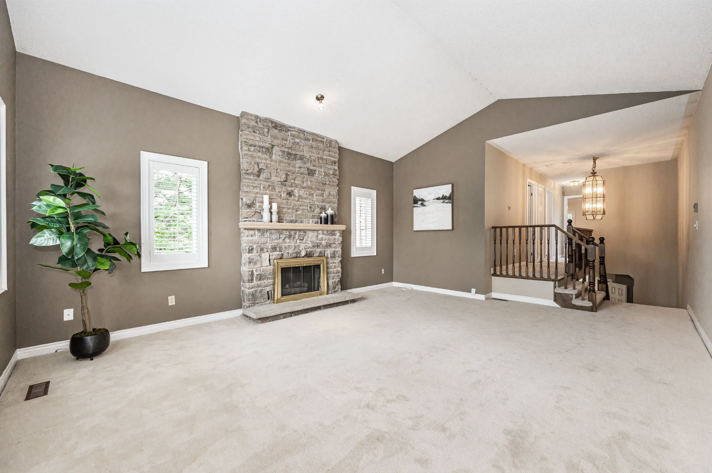The upper level hosts a fabulous massive family room showcasing vaulted ceilings and a gas fireplace highlighting a grand floor to ceiling brick surround. The large primary bedroom retreat presents a walk-in closet & 4-piece ensuite. Two additional good-sized bedrooms with large windows & closets and 4-piece bathroom with skylight. The unspoiled lower level offers plenty of space for additional living and storage. Rain Bird irrigation system in the front yard. Roof shingles 2020.