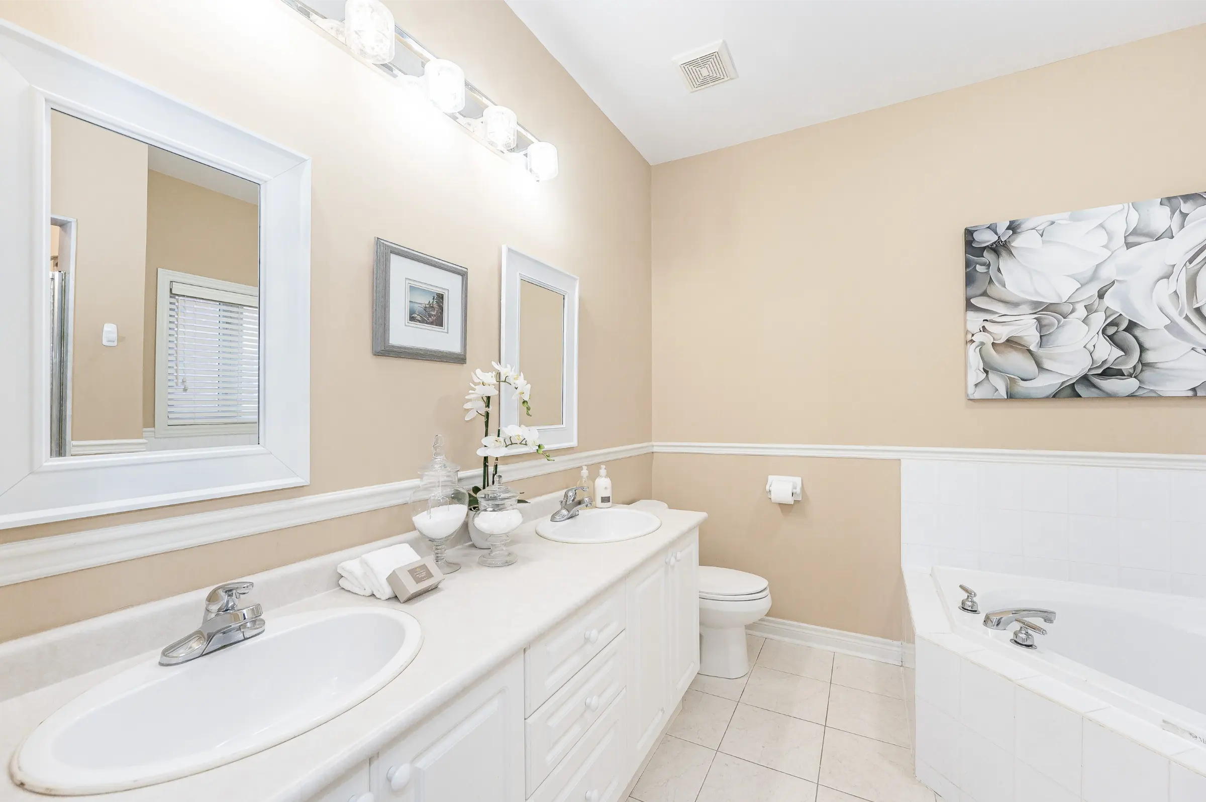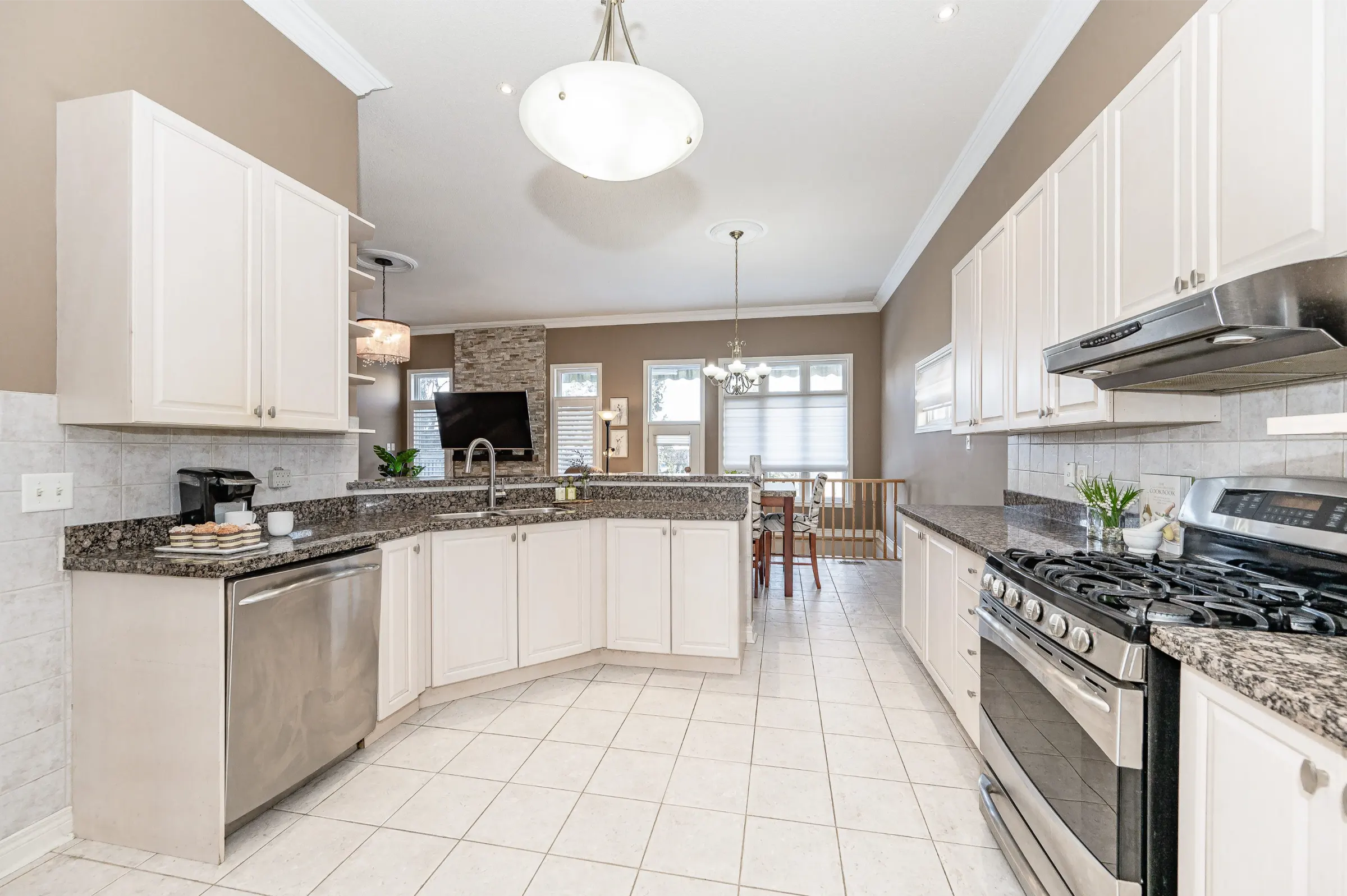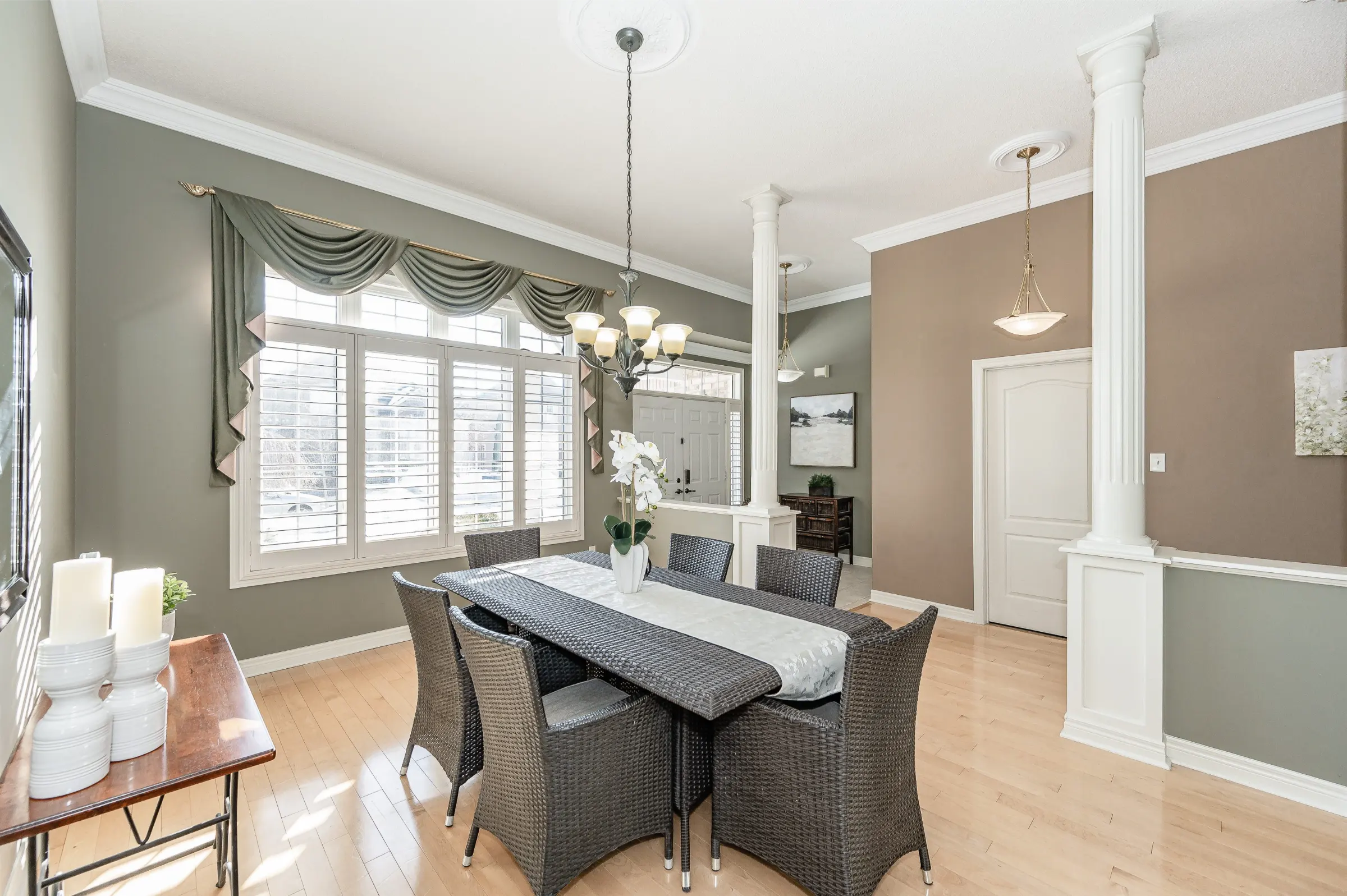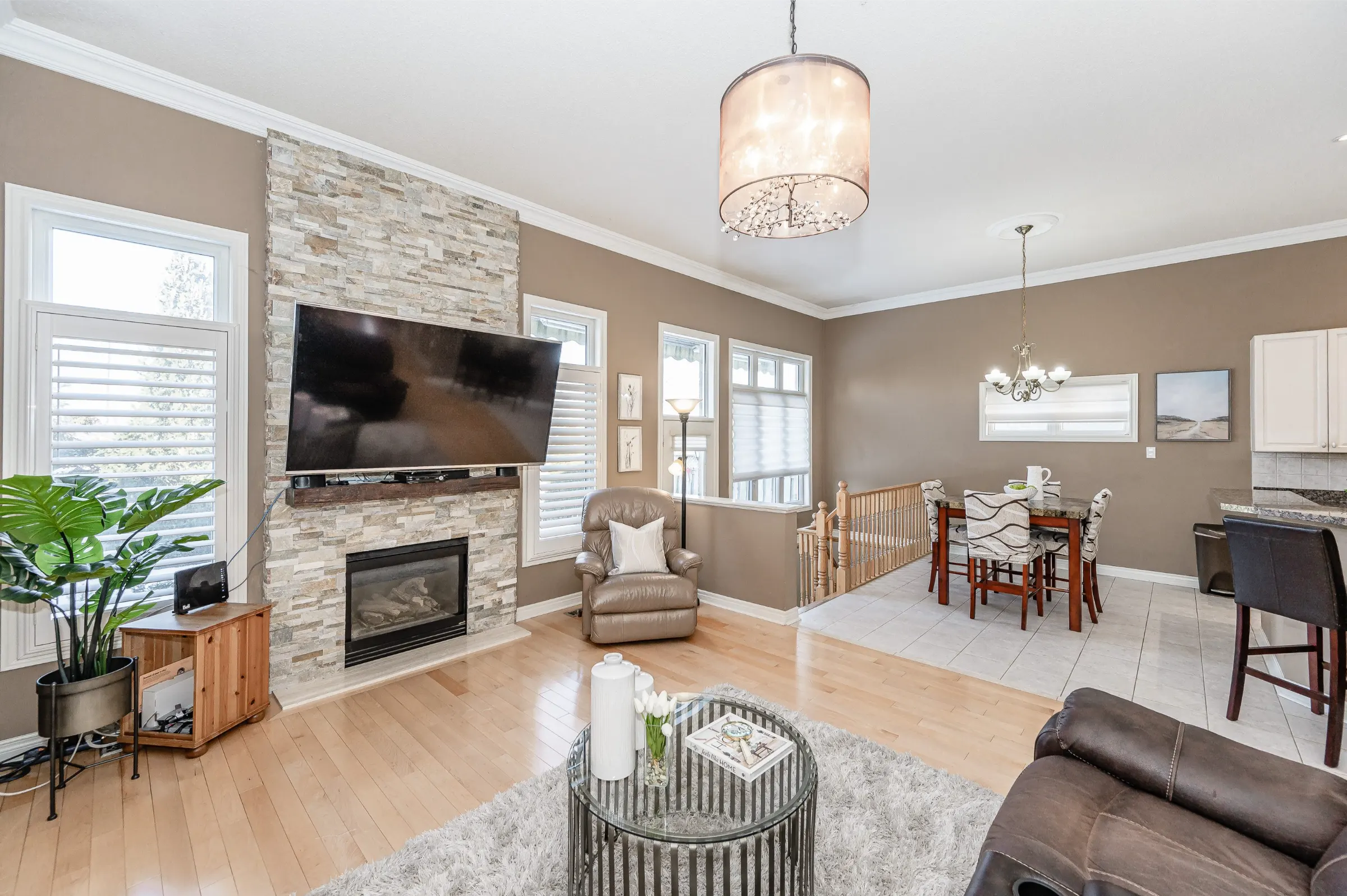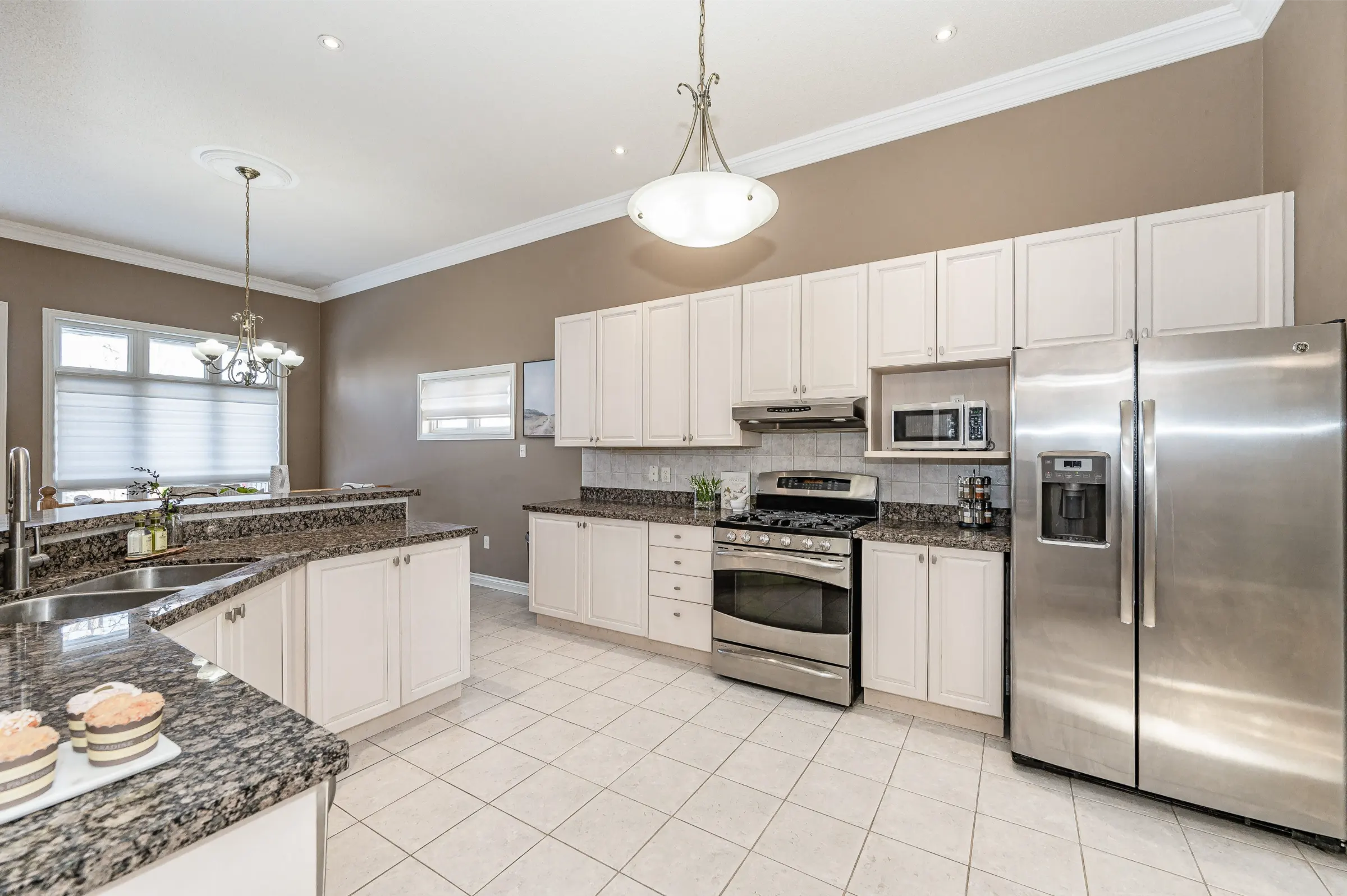 The outstanding interior boasting hardwood floors, crown moulding, pot lights, California shutters, custom blinds and much more. The superior main level offers a spacious kitchen with breakfast room equipped with granite counters, undermount sink, backsplash, stainless steel appliances, ample cabinetry & pantries. Beautiful formal dining room featuring substantial sized windows allowing in lots of natural daylight. The impressive entertainment size living room is loaded with an artisan stone wall feature, gas fireplace and large windows.