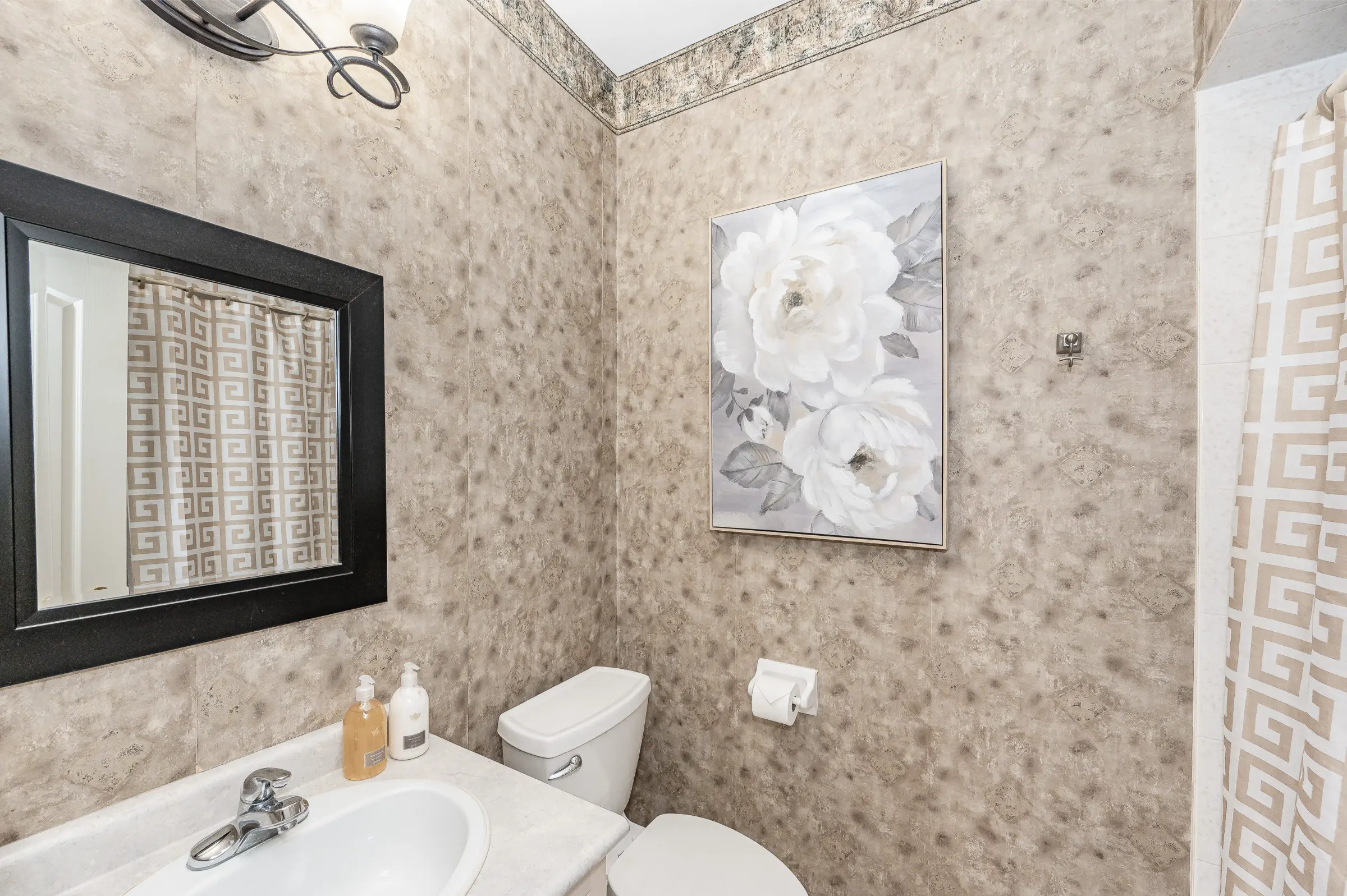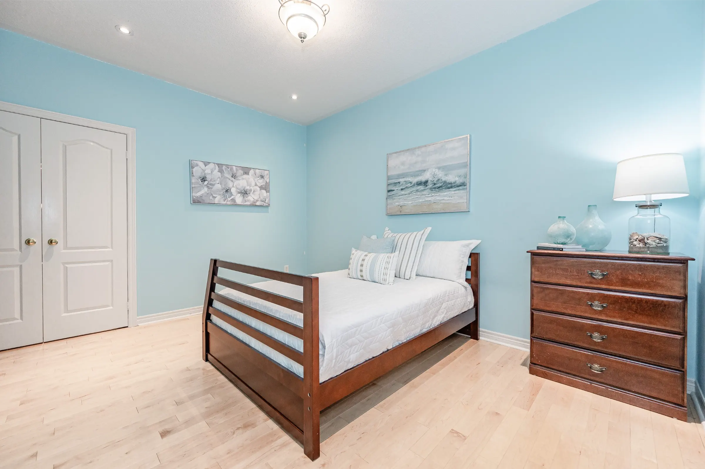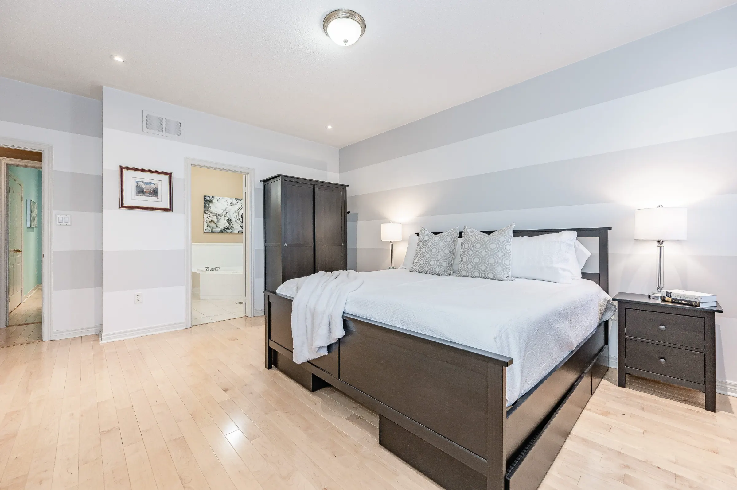 Convenient walkout to the private tree lined back yard with concrete patio, electric awning and rough in for hot tub. Tranquil generous primary bedroom with two good sized double door closets, large windows and private 5-piece spa-like ensuite. Additional bedroom, 4-piece main bathroom, linen closet and laundry room complete the exceptional main level.