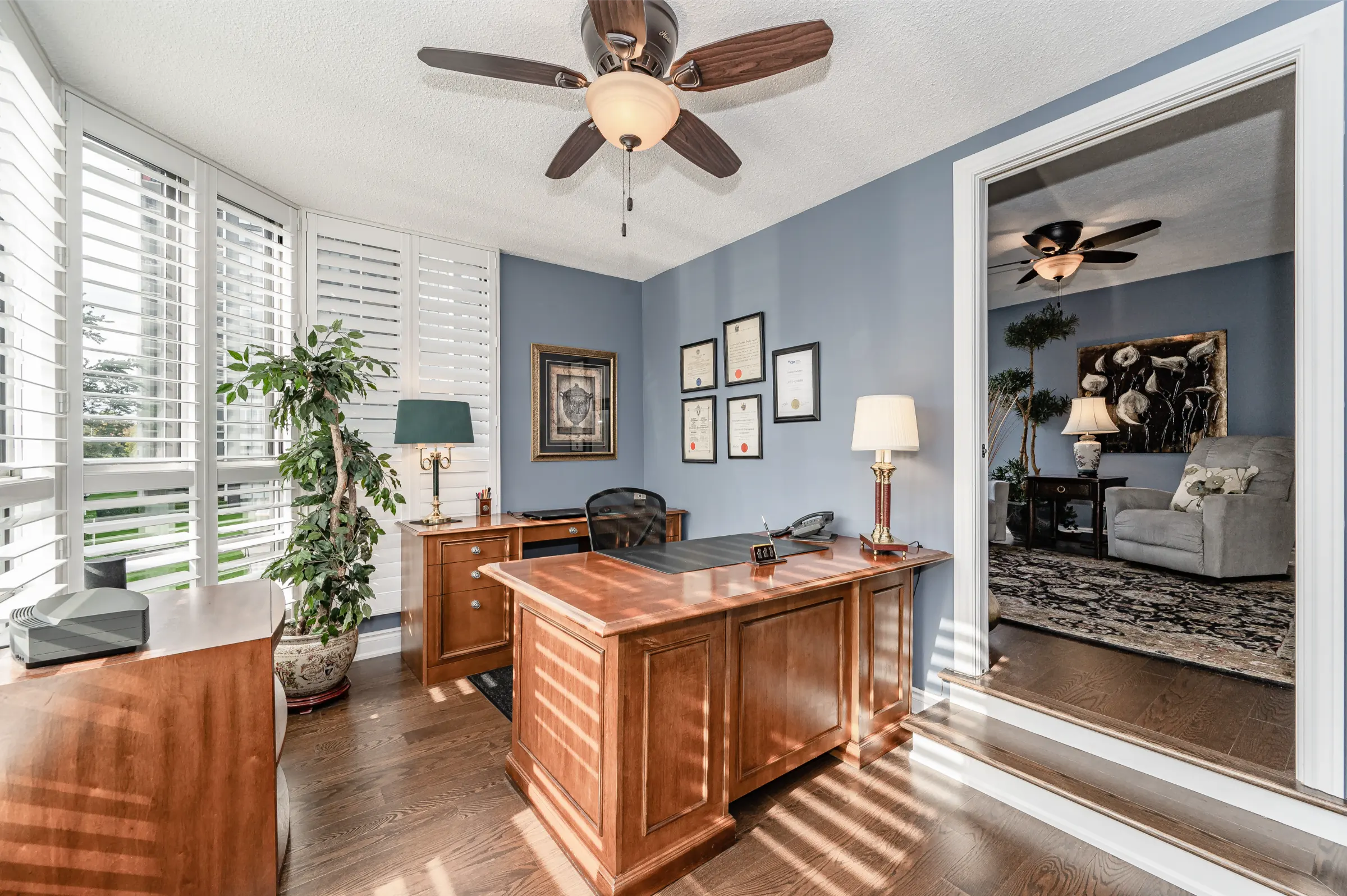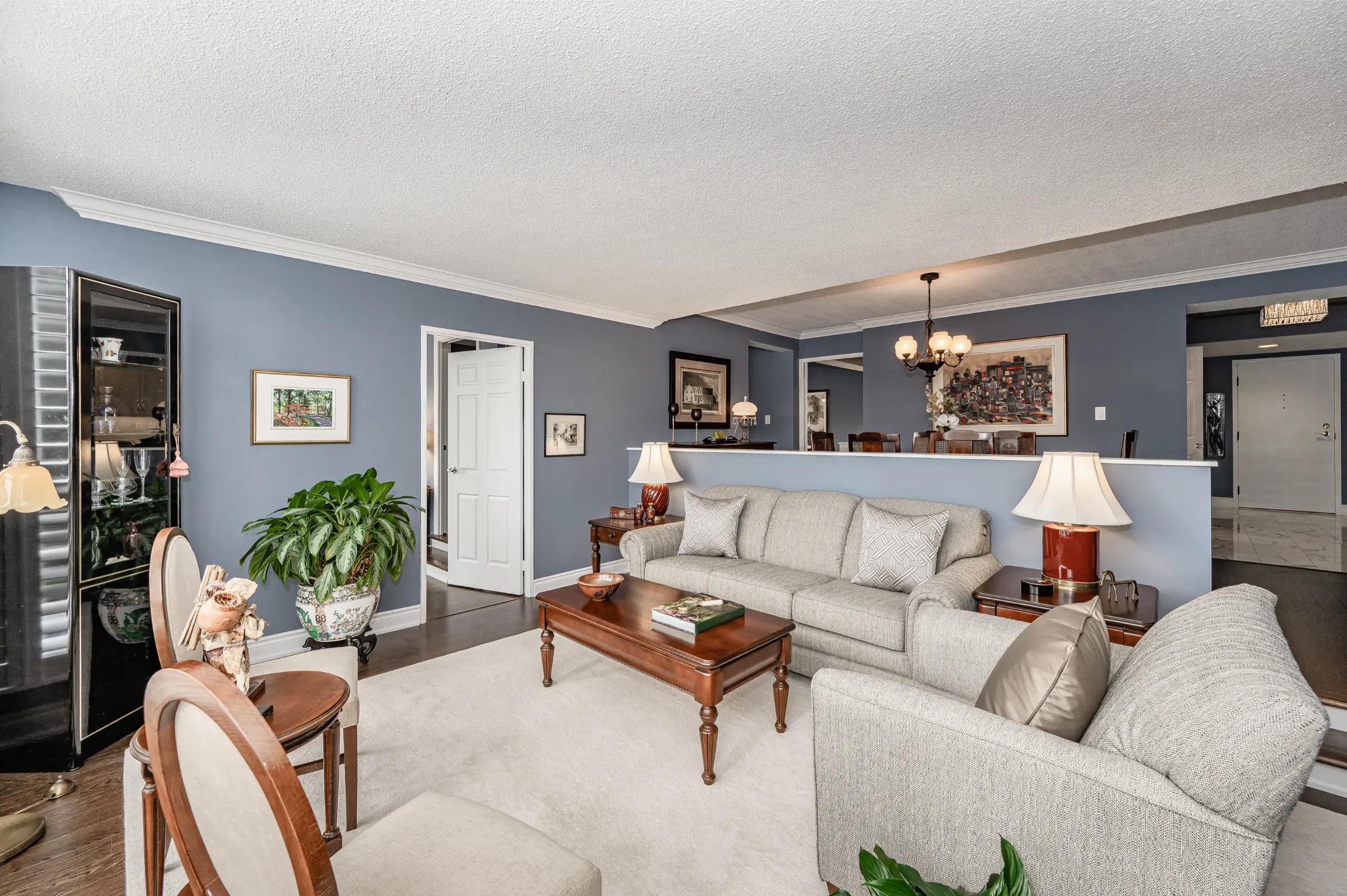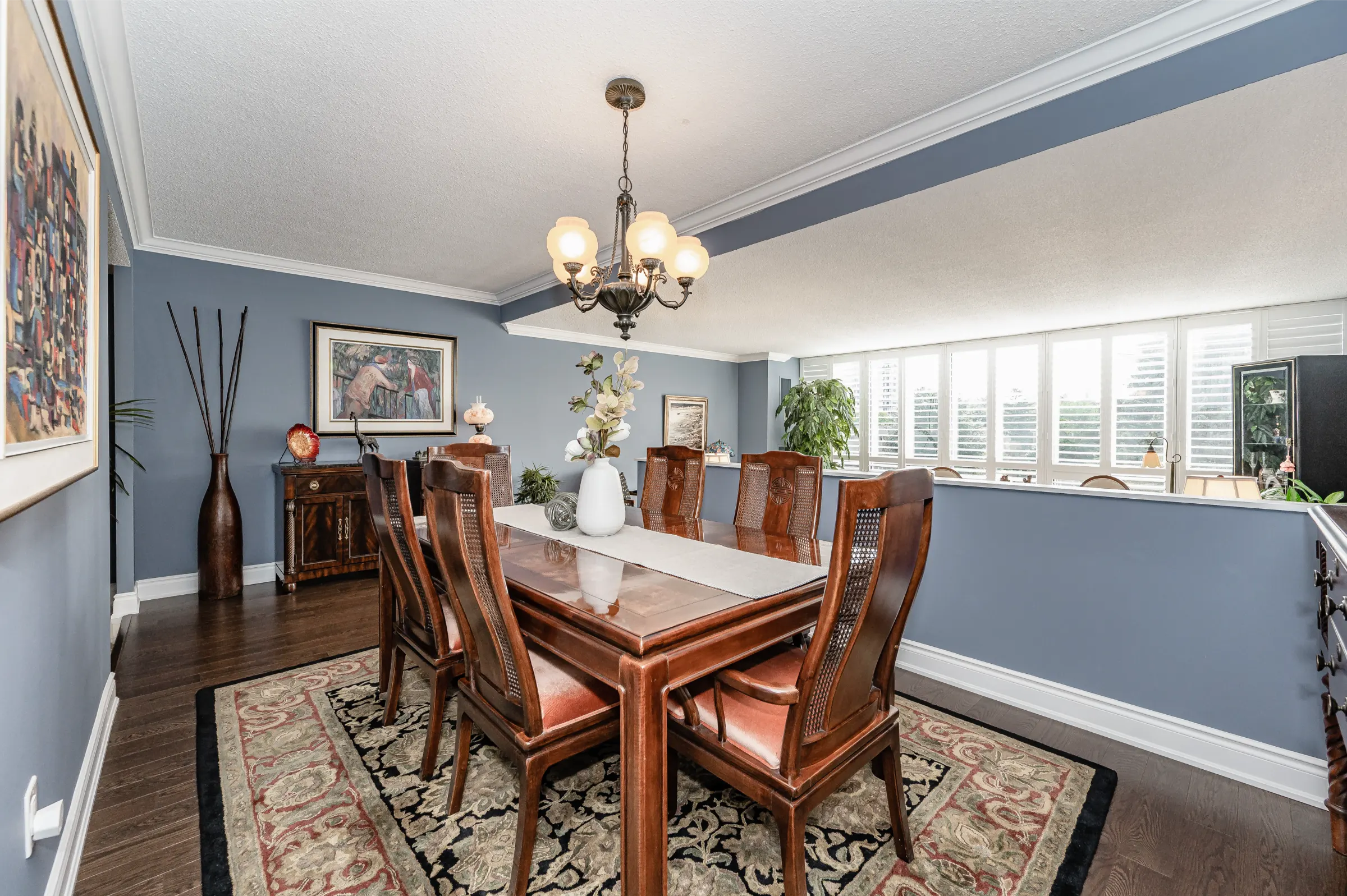 Spectacular renovated 2-bedroom suite boasting 1830 square feet offering luxurious upgrades with attention to detail throughout. Stylish spacious corner unit filled with an abundance of natural daylight featuring an eat-in kitchen, formal dining & living rooms, den, office, 2 bathrooms & laundry/storage room. Outfitted with floor to ceiling windows, California shutters, crown moulding, hardwood floors, upgraded baseboards, pot lights, quality light fixtures, ceiling fans, custom drapery & much more!