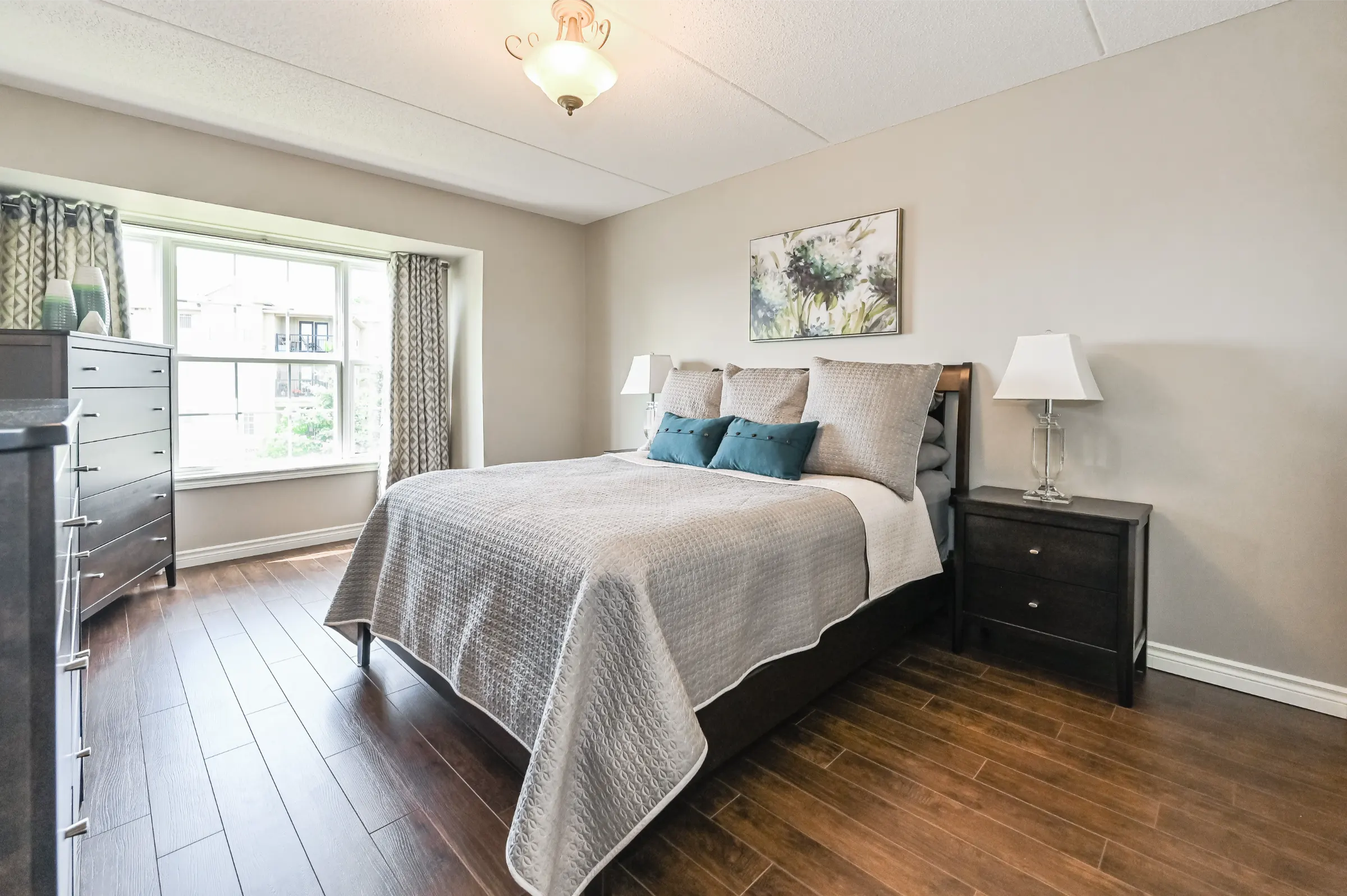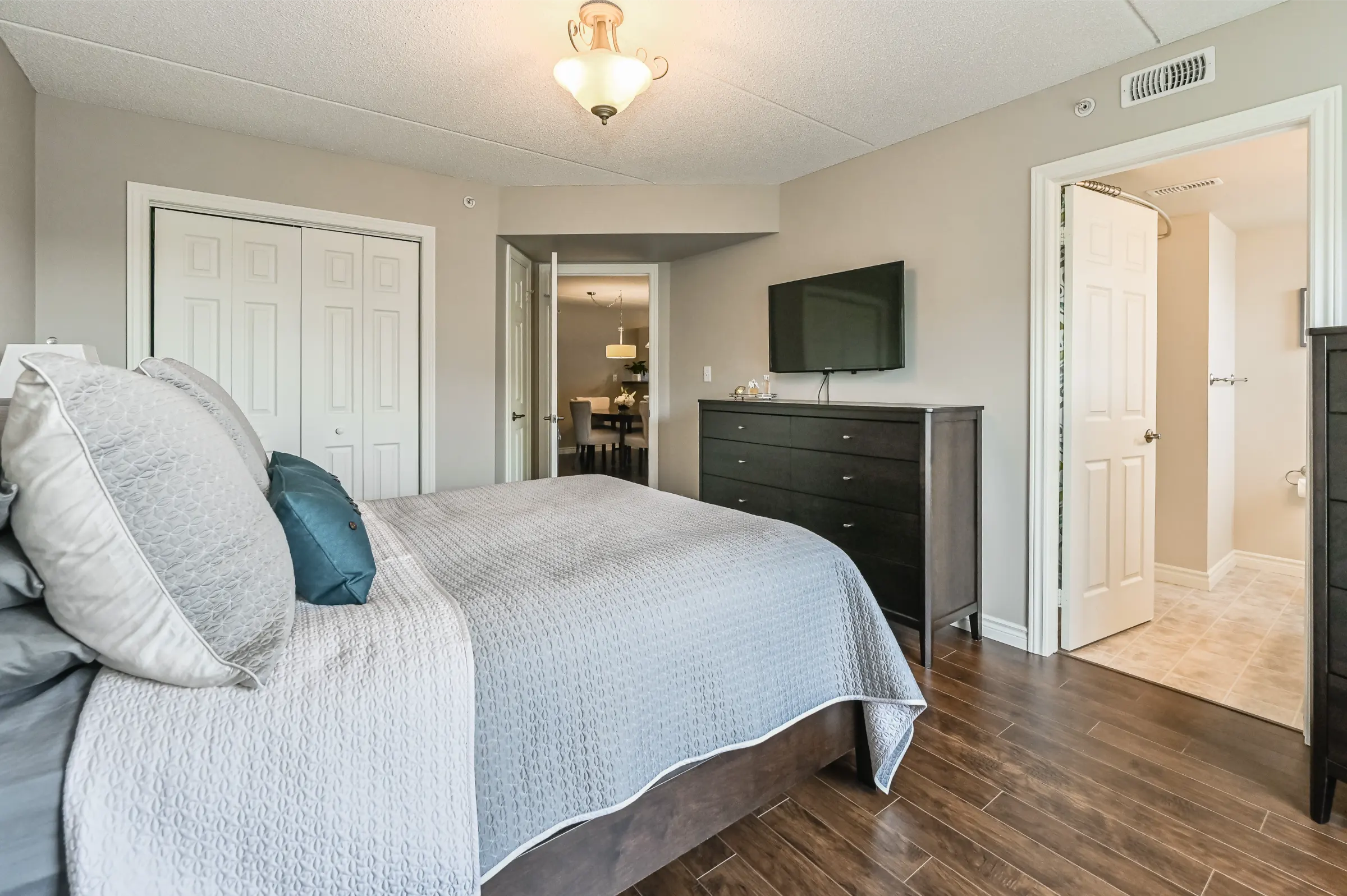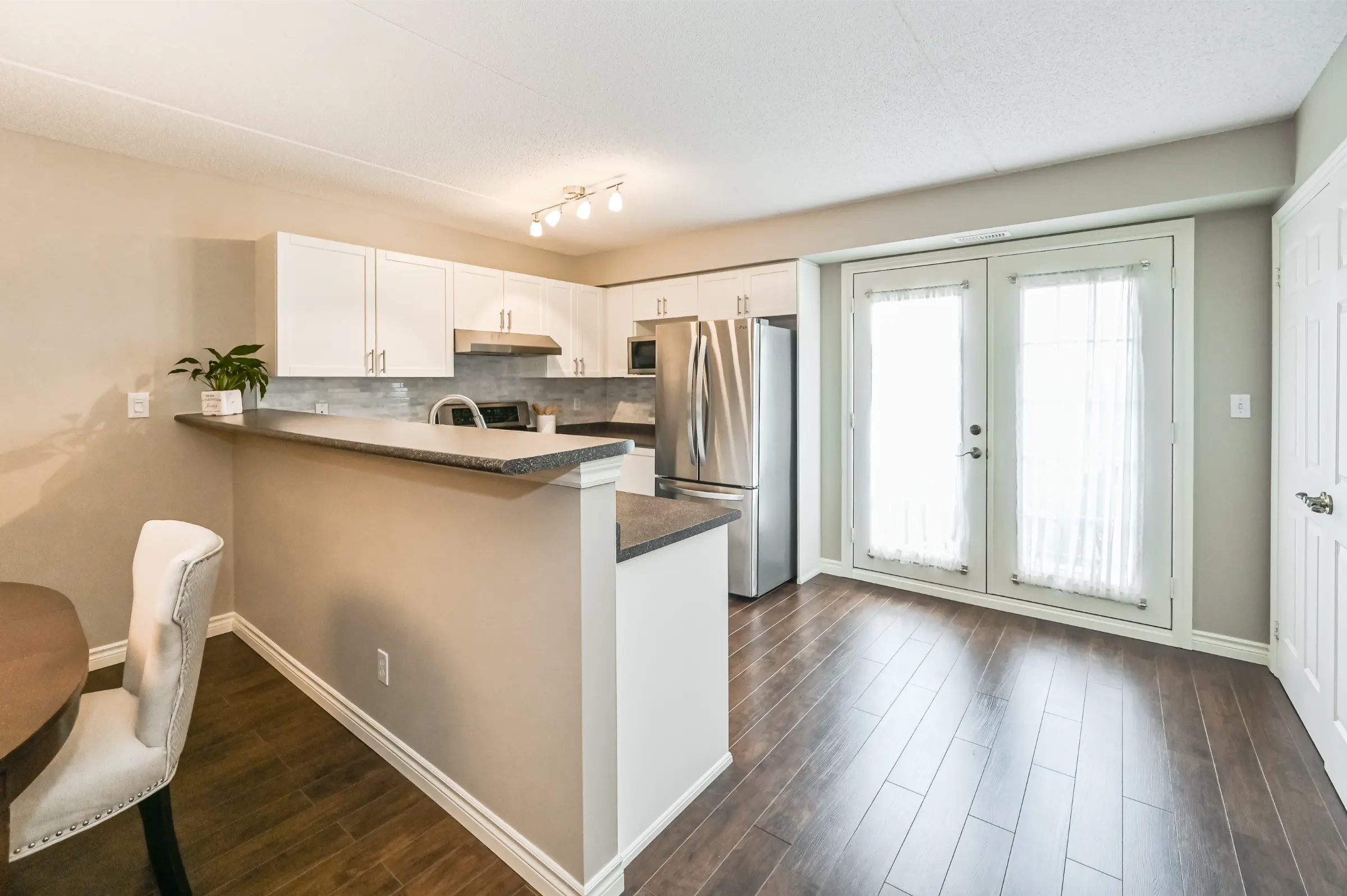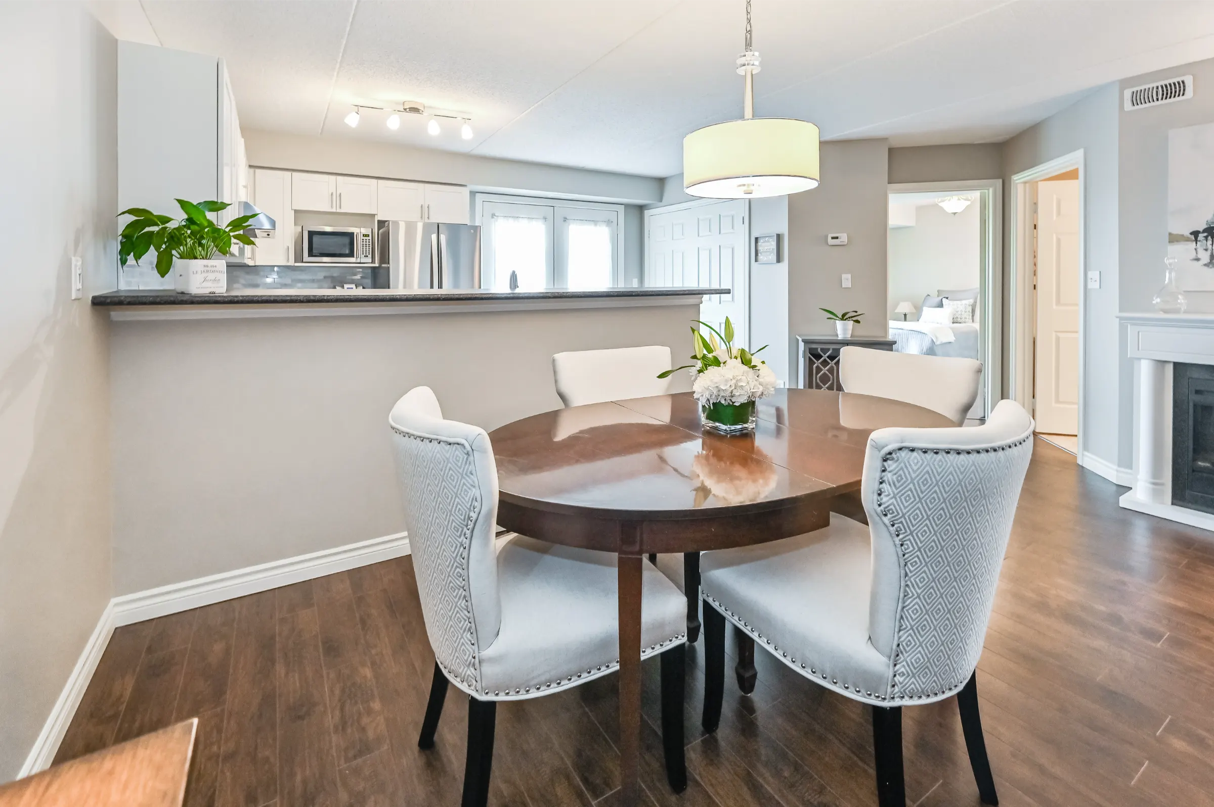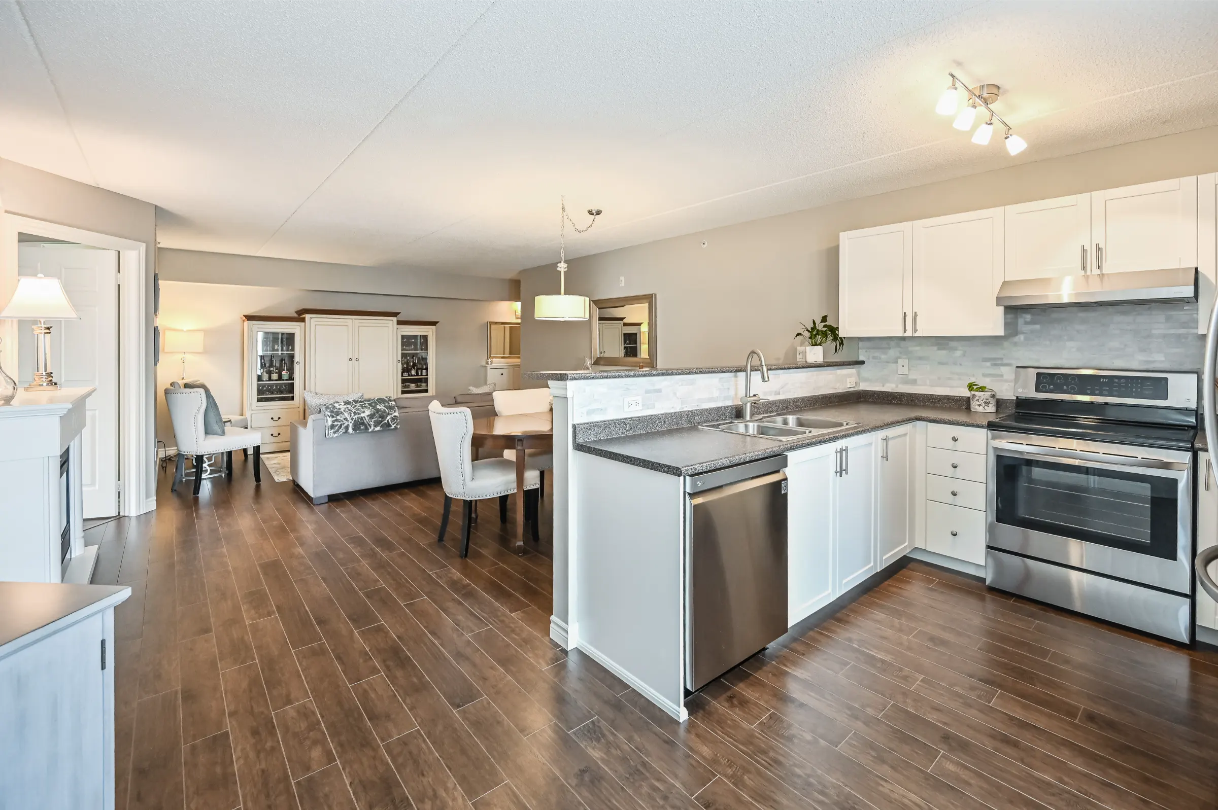 Inviting foyer with closet leads into the beautifully updated suite with the perfect layout for entertaining. Upgraded flooring, light fixtures, electric fireplace and neutral décor. Generous sized living room overlooking the dining room. Kitchen features ample cabinetry and counter space, back splash, stainless steel appliances, breakfast bar and french door walk out to the balcony with custom patio tiles.