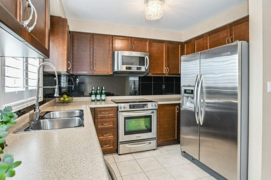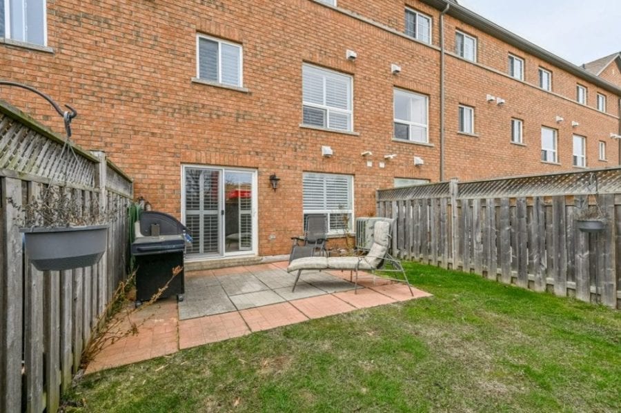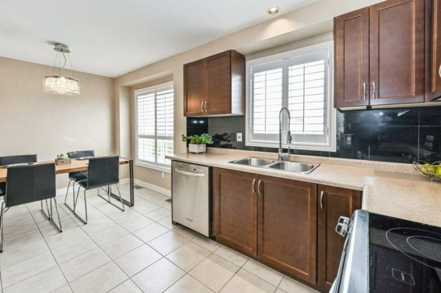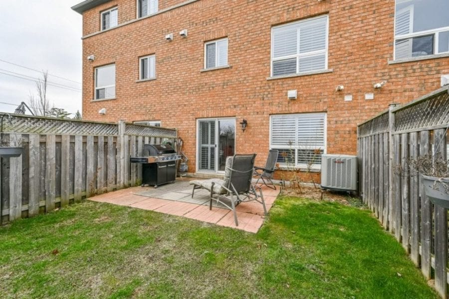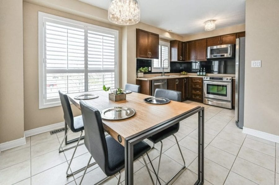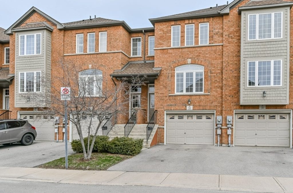 Fabulous upgraded townhouse in “The Village on Green” built by Valery Homes offering approximately 1797 square feet above grade and tasteful décor throughout filled with lots of natural light. Easy access to parks, restaurants, transit and major highways. Stylish brick exterior and entry door with glass insert and transom window. Upgraded hardwood staircase leads to the combined open concept dining and living rooms configured perfectly for entertaining. Featuring crown moulding, smooth ceiling, dark stained hardwood floor, upgraded light fixture and large window with custom California shutters and handy powder room. Fantastic large eat in kitchen with pot light, dark cabinetry, upgraded light fixtures, stainless steel appliances, large windows and sunny generous breakfast area overlooking the rear yard.