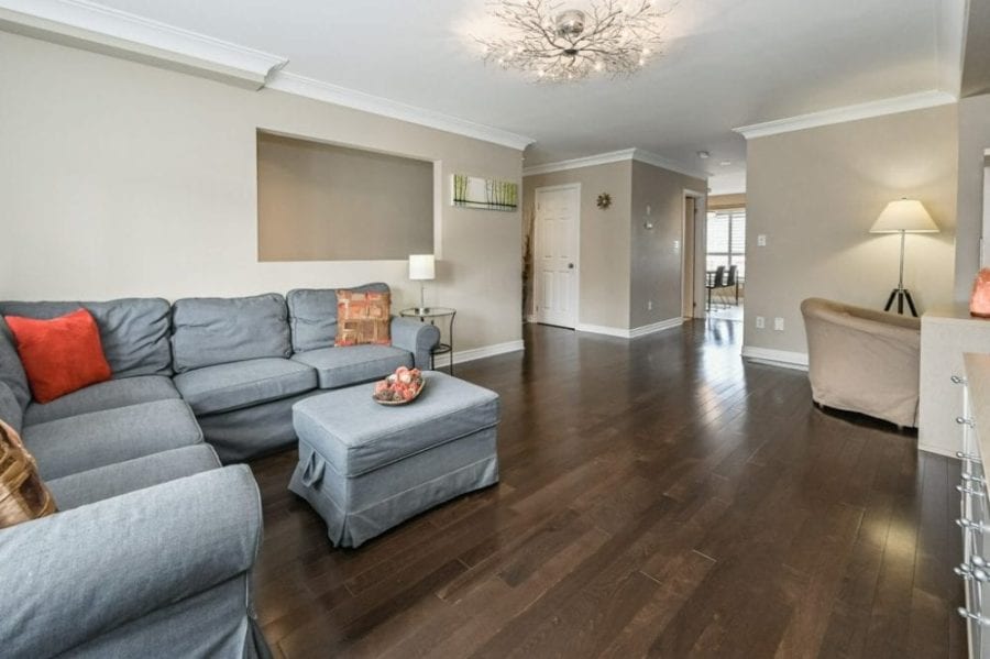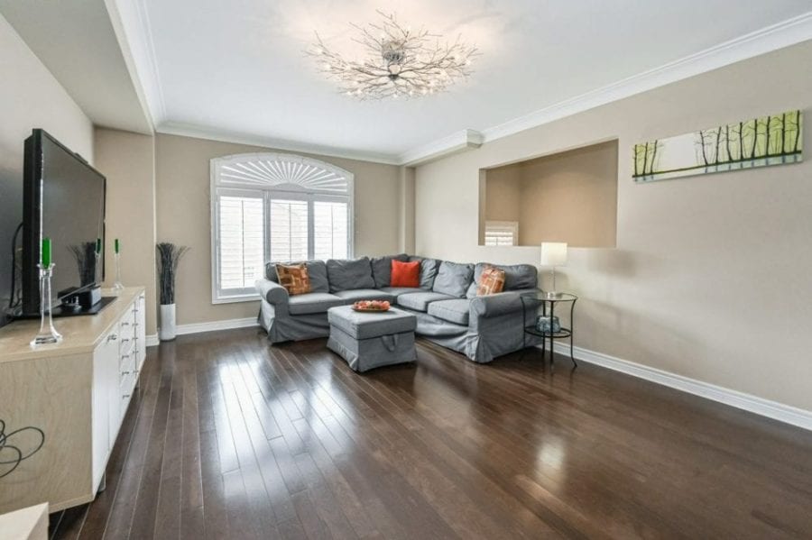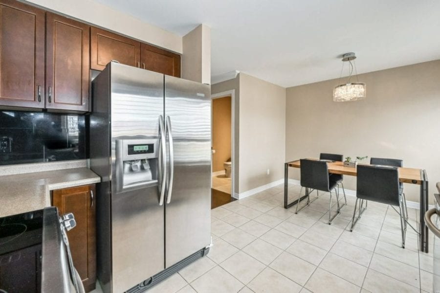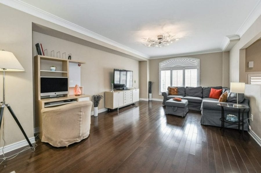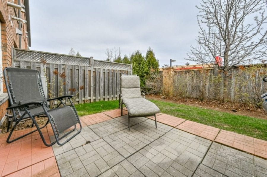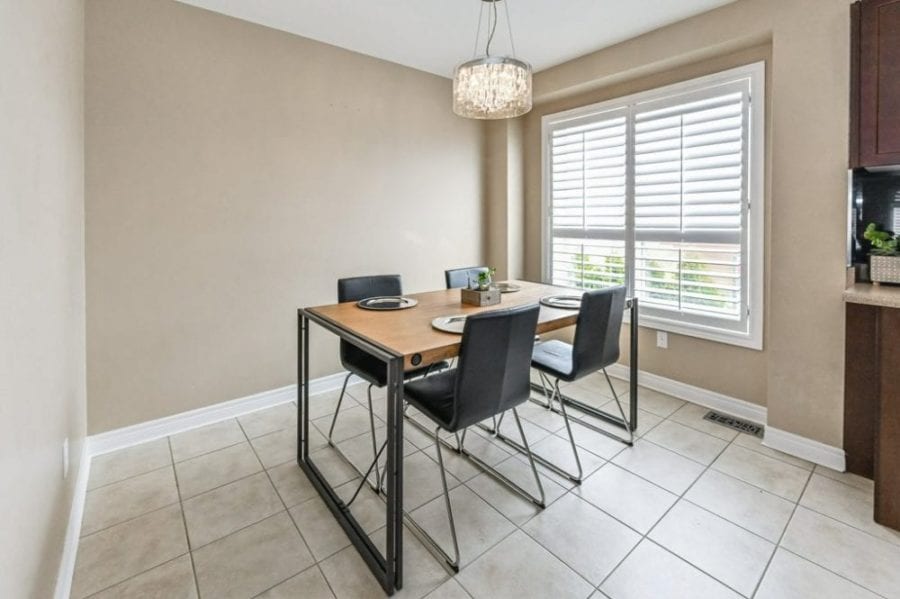 Fabulous upgraded townhouse in “The Village on Green” built by Valery Homes offering approximately 1797 square feet above grade and tasteful décor throughout filled with lots of natural light. Easy access to parks, restaurants, transit and major highways. Stylish brick exterior and entry door with glass insert and transom window. Upgraded hardwood staircase leads to the combined open concept dining and living rooms configured perfectly for entertaining. Featuring crown moulding, smooth ceiling, dark stained hardwood floor, upgraded light fixture and large window with custom California shutters and handy powder room. Fantastic large eat in kitchen with pot light, dark cabinetry, upgraded light fixtures, stainless steel appliances, large windows and sunny generous breakfast area overlooking the rear yard.