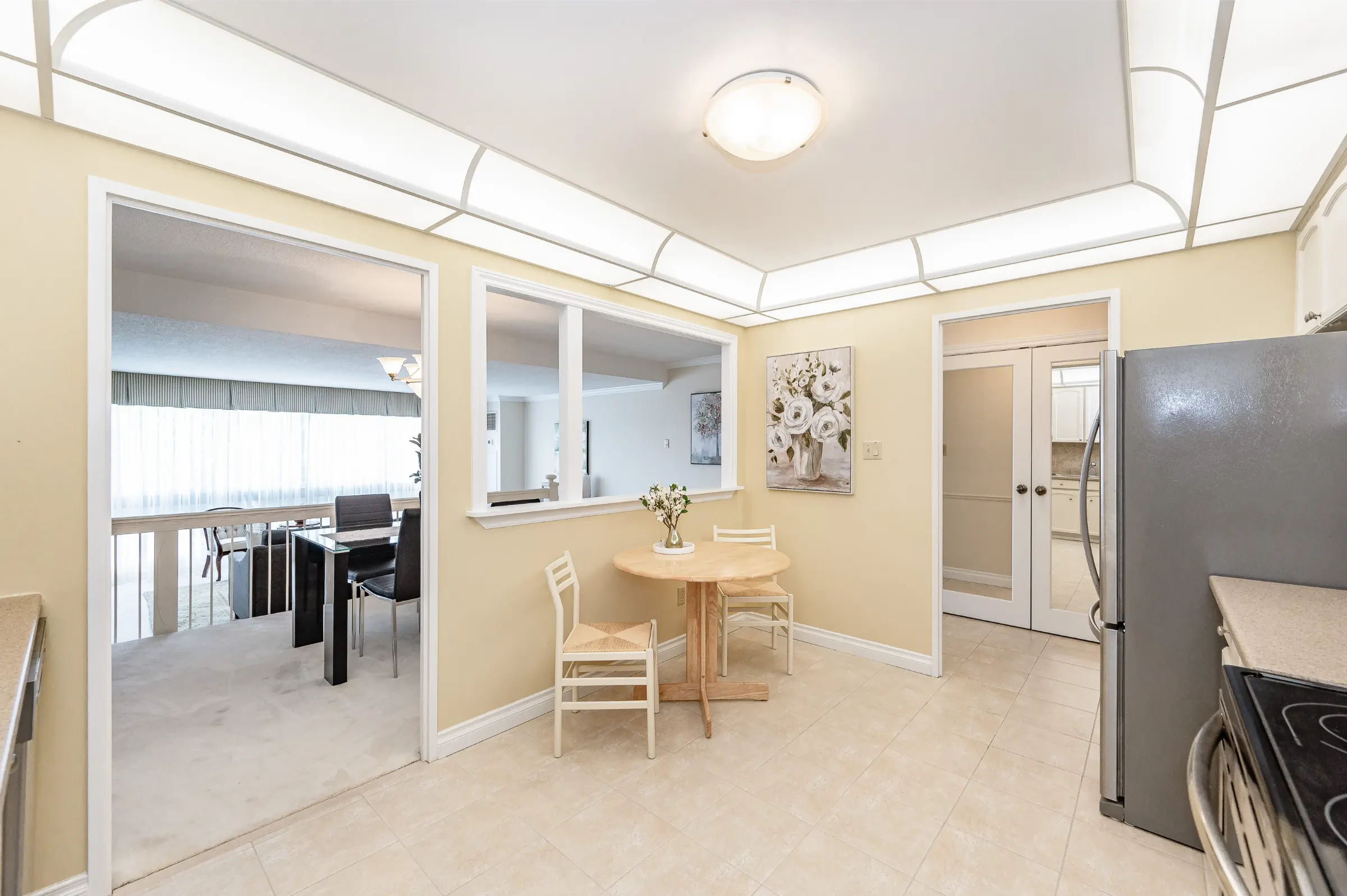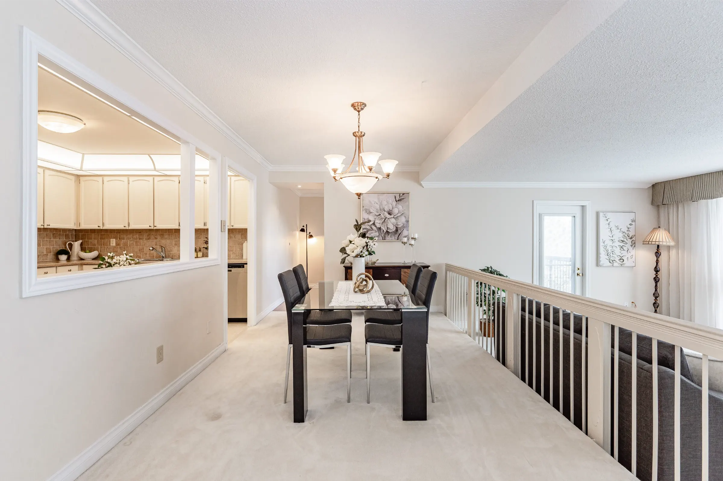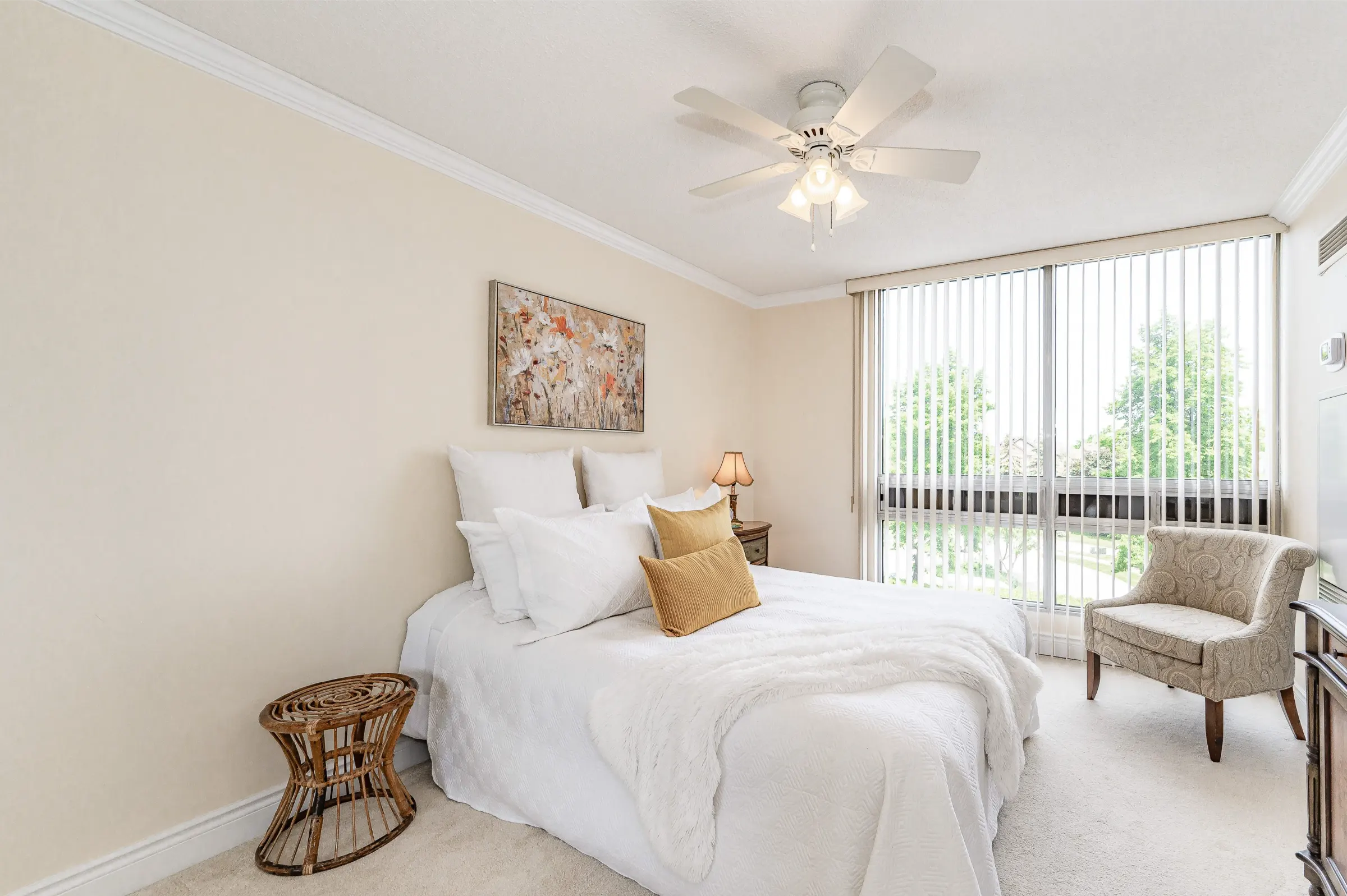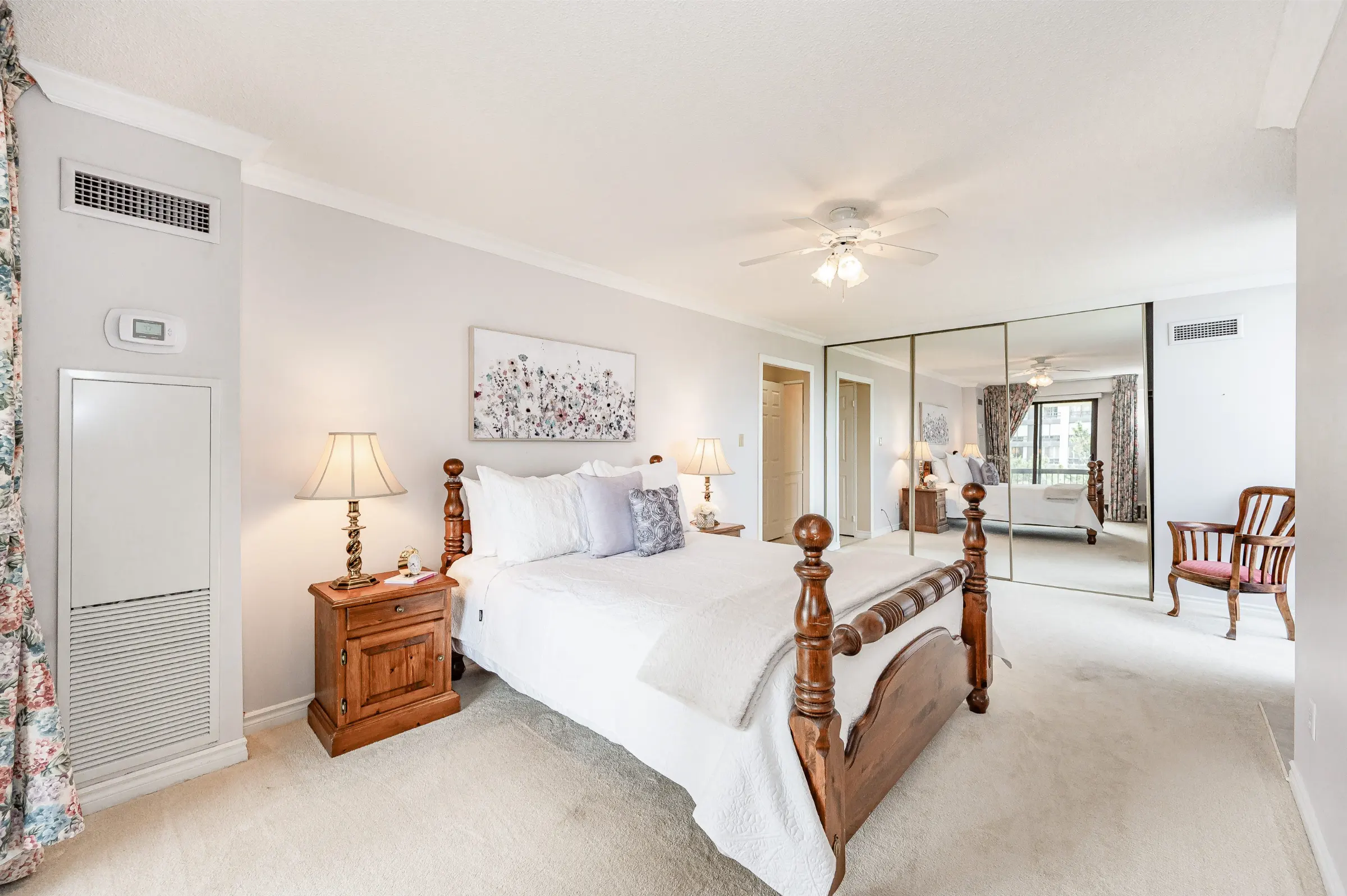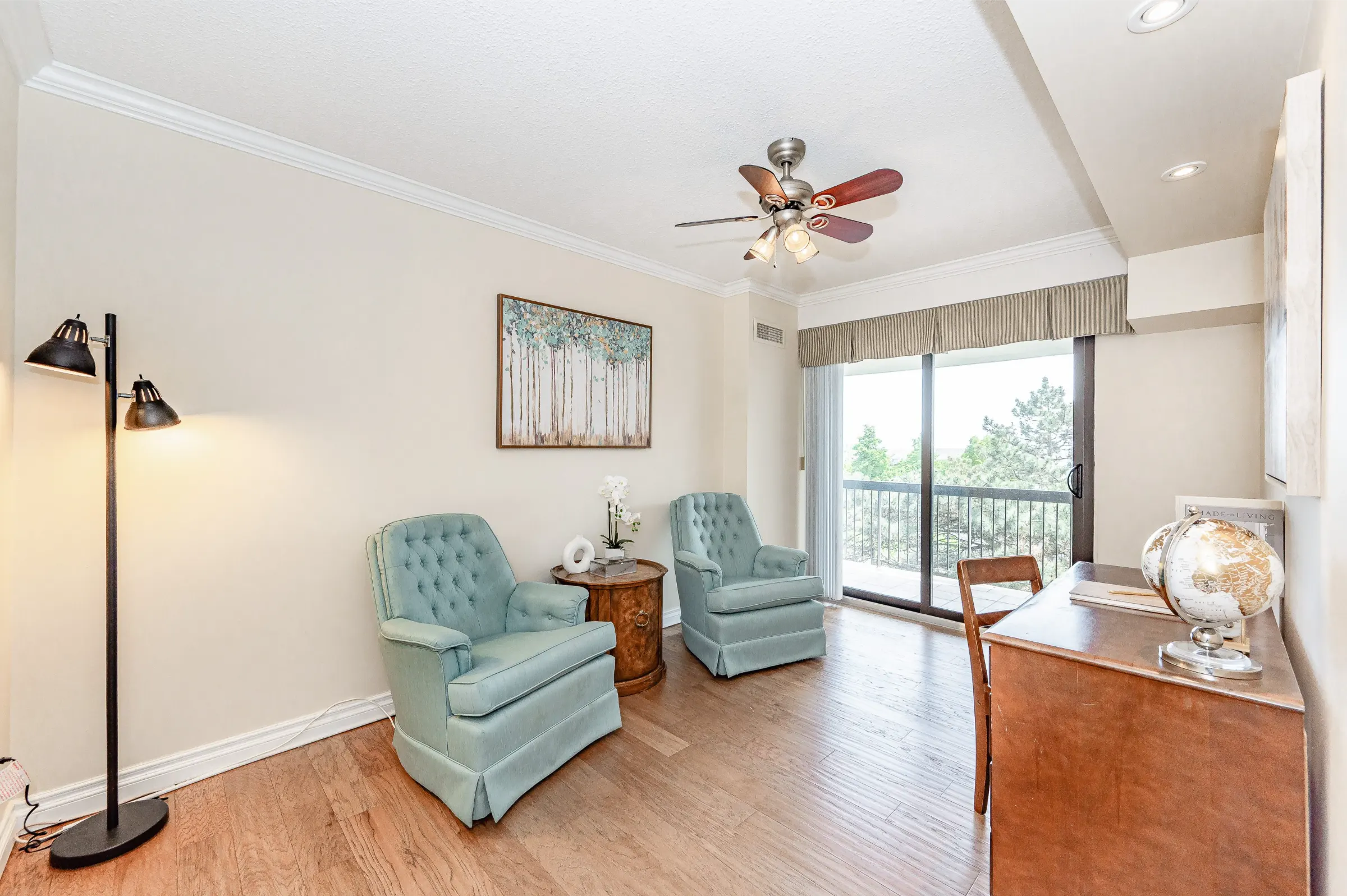 Neutral décor with crown moulding, pot lights, ceiling fans, ceramic flooring and more. Impressive sized foyer providing multiple mirrored closet doors with ample storage leads into the well-designed layout with generous sized rooms. Large eat-in kitchen equipped with a pass-through window, stainless steel appliances, tiled backsplash and plenty of cabinetry and counter space. Open concept entertainment sized dining room overlooking the formal living room showcasing floor to ceiling windows and walk out to the balcony with pretty views of lush treetops and Lake Ontario. Cozy private den complete with wood floor and walk-out to the balcony. Spacious primary bedroom retreat featuring floor to ceiling windows, sliding door walkout to the balcony, wall to wall mirrored closet doors and beautiful spa like 3-piece ensuite with glass walk-in shower. Offering a bright second bedroom with mirrored sliding closet doors and 4-piece main bathroom with tub/shower combination. Convenient linen closet and laundry and storage rooms. New heating and cooling system installed 2022.
