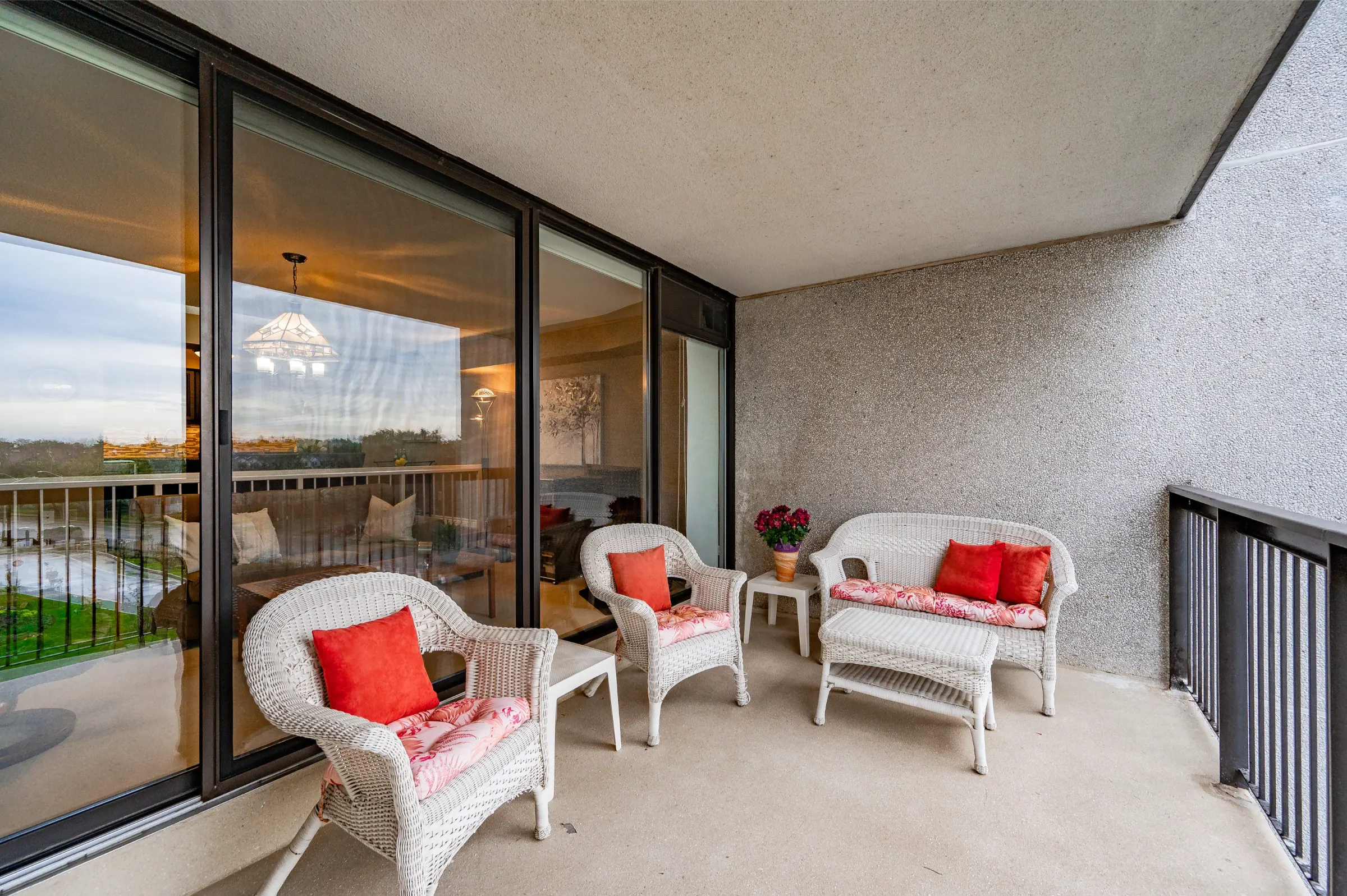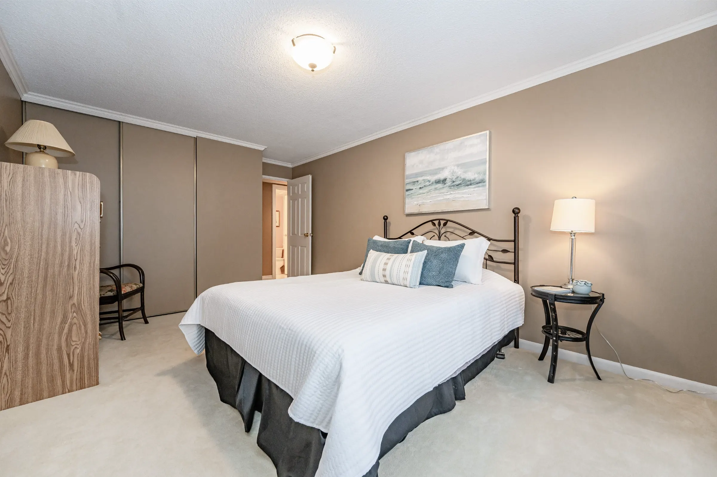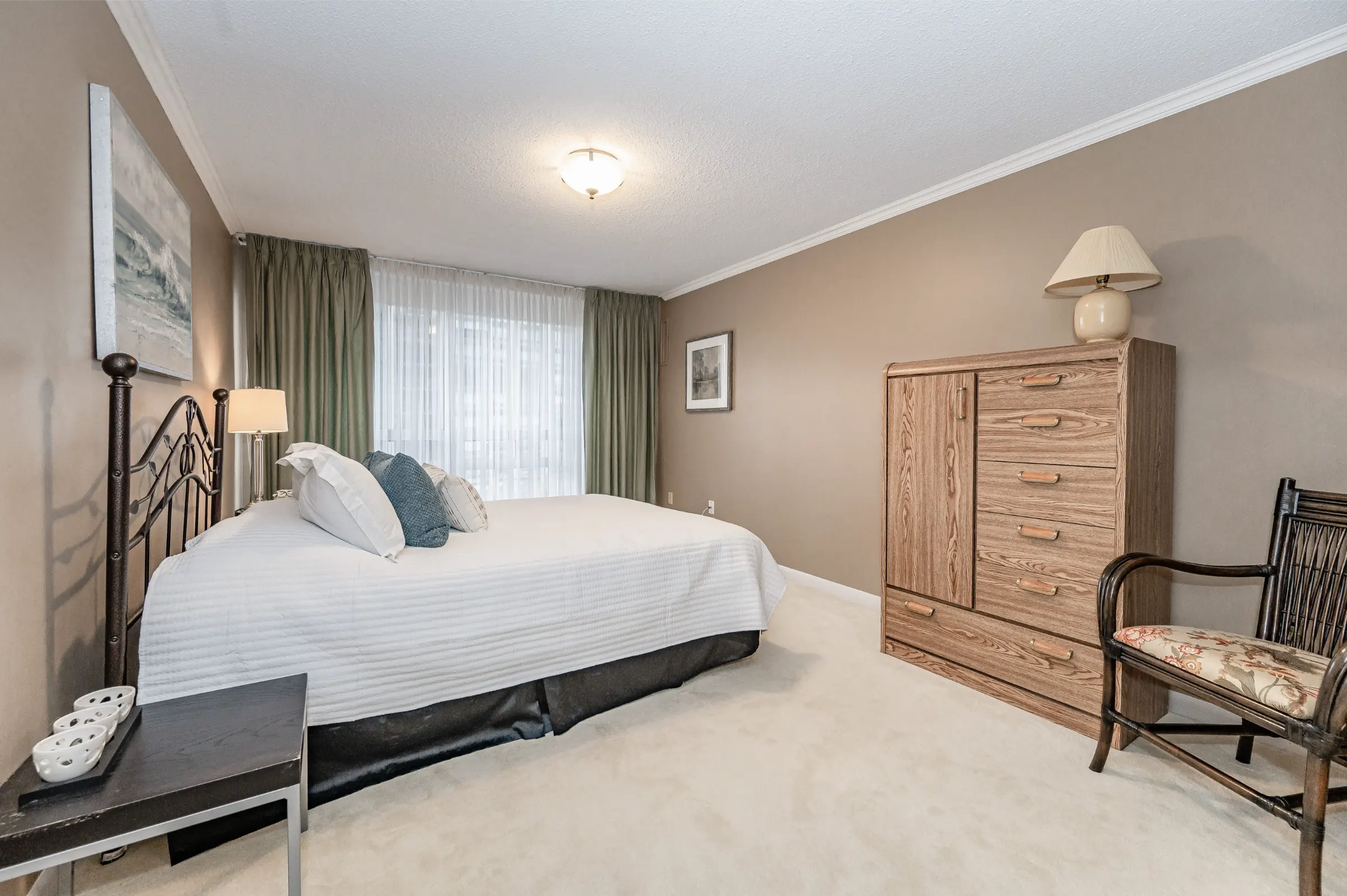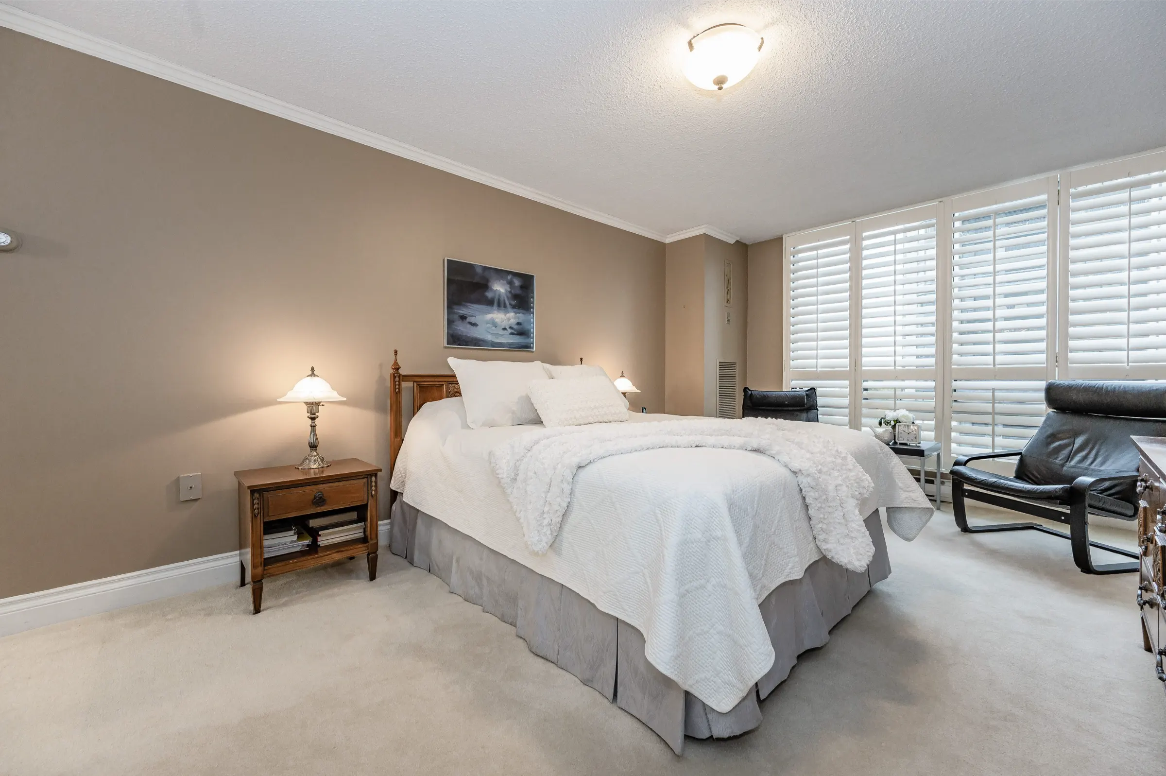 Generous master bedroom getaway with floor to ceiling windows, three sets of sliding closet doors providing plenty of storage & 3-piece ensuite with glass door walk-in shower. Large second bedroom & main 4-piece bathroom with tub/shower combination. Convenient in-suite laundry, linen closet & storage room complete this appealing home.