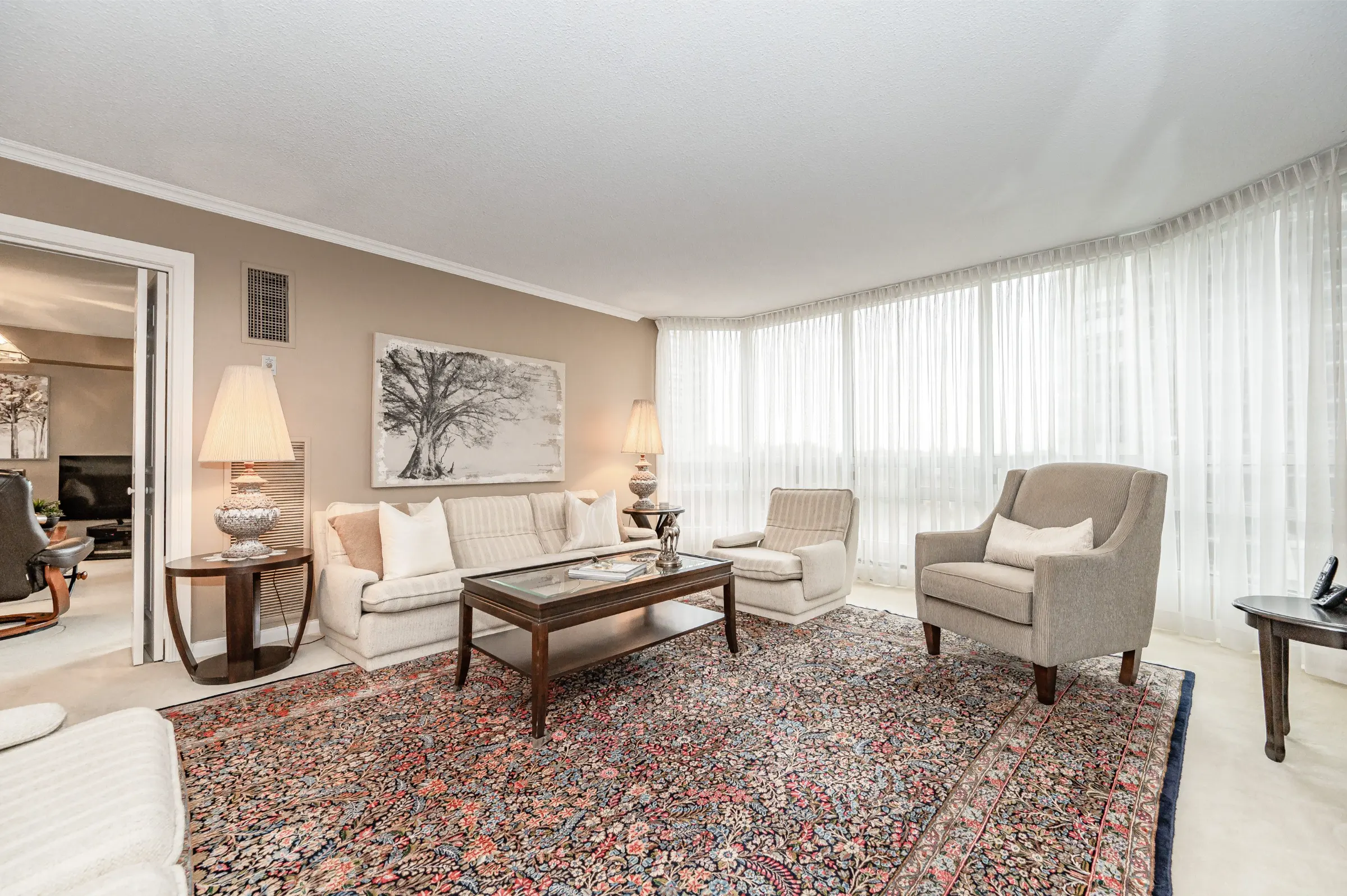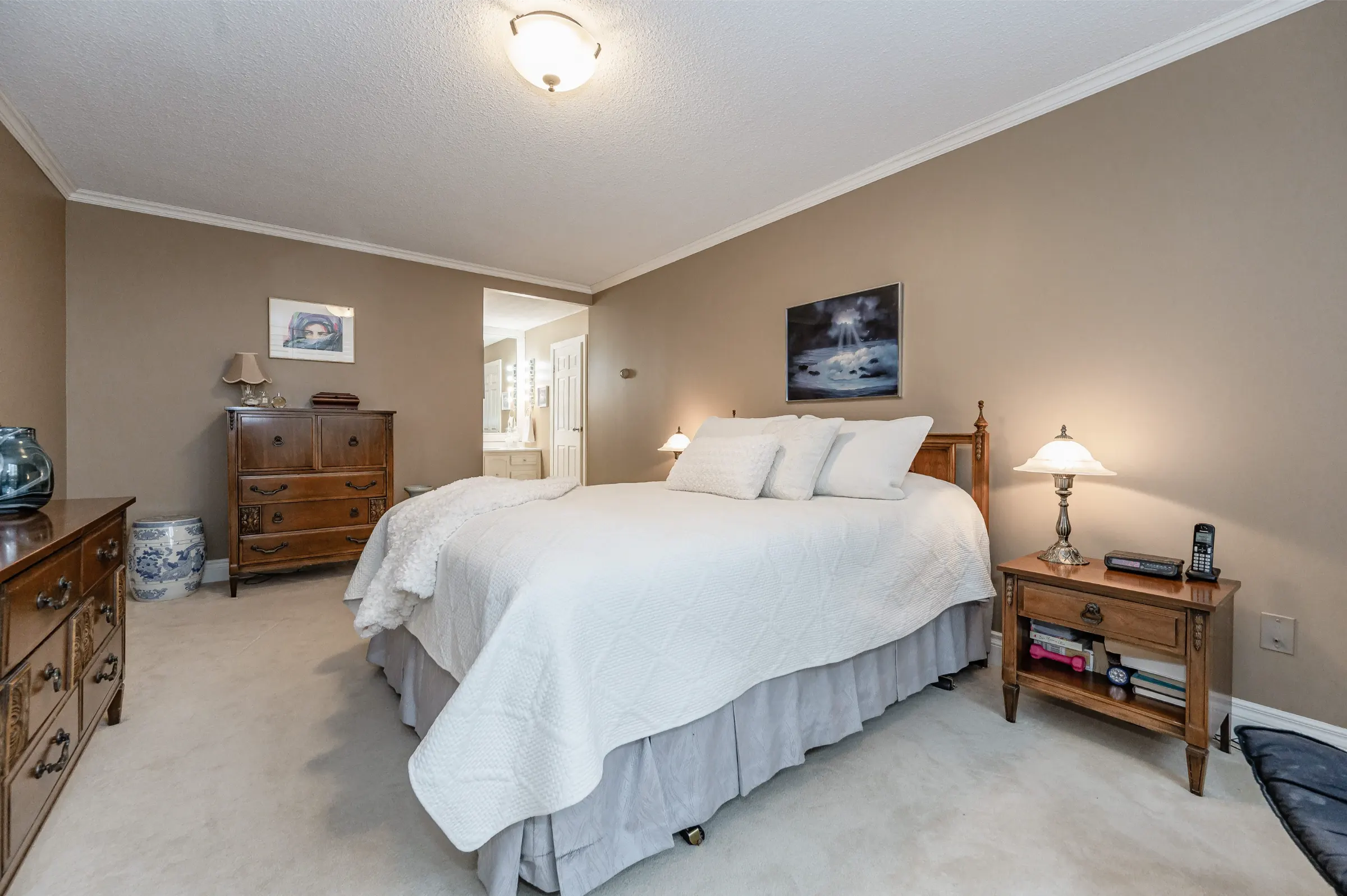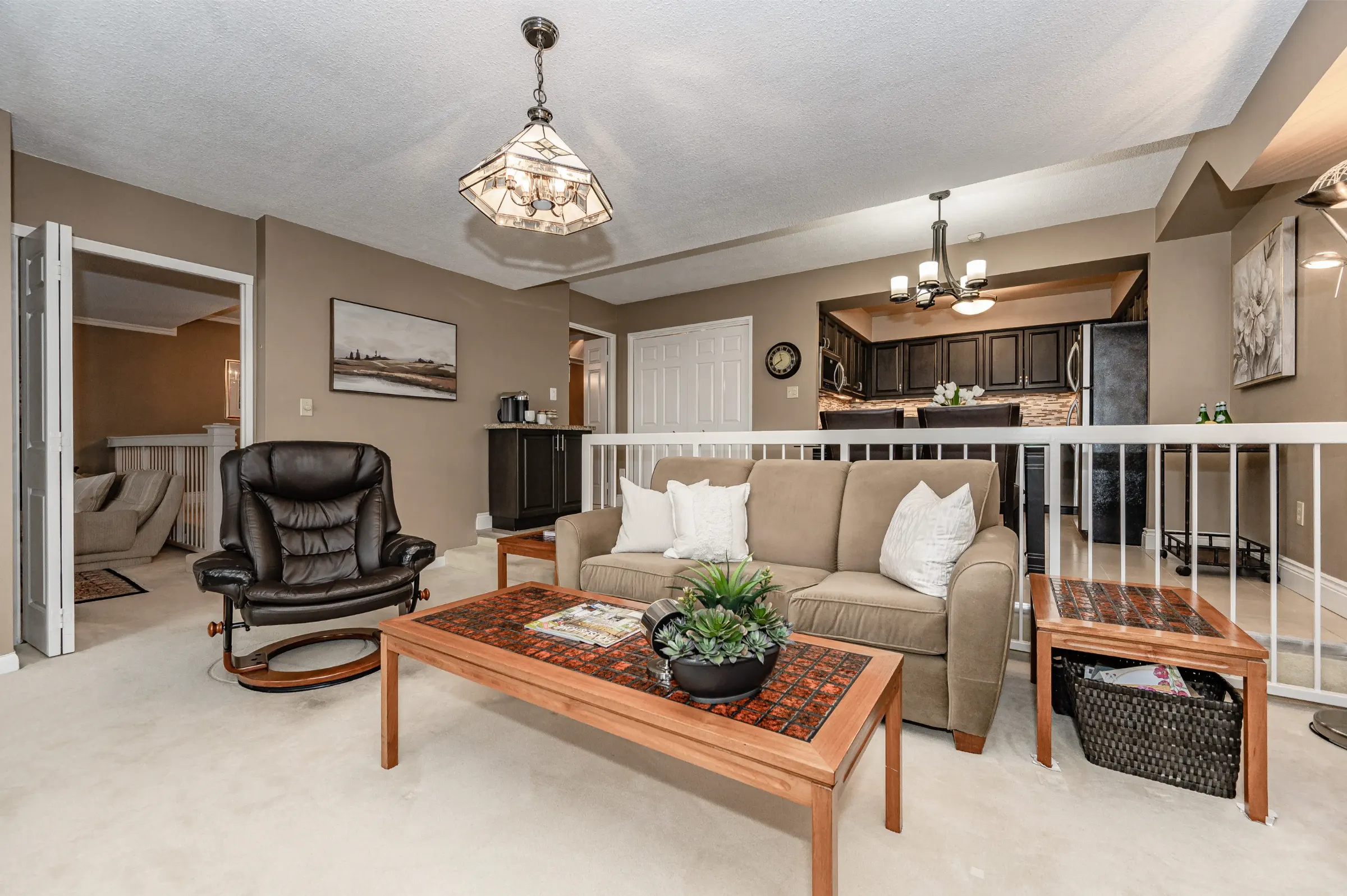 Generous master bedroom getaway with floor to ceiling windows, three sets of sliding closet doors providing plenty of storage & 3-piece ensuite with glass door walk-in shower. Large second bedroom & main 4-piece bathroom with tub/shower combination. Convenient in-suite laundry, linen closet & storage room complete this appealing home.