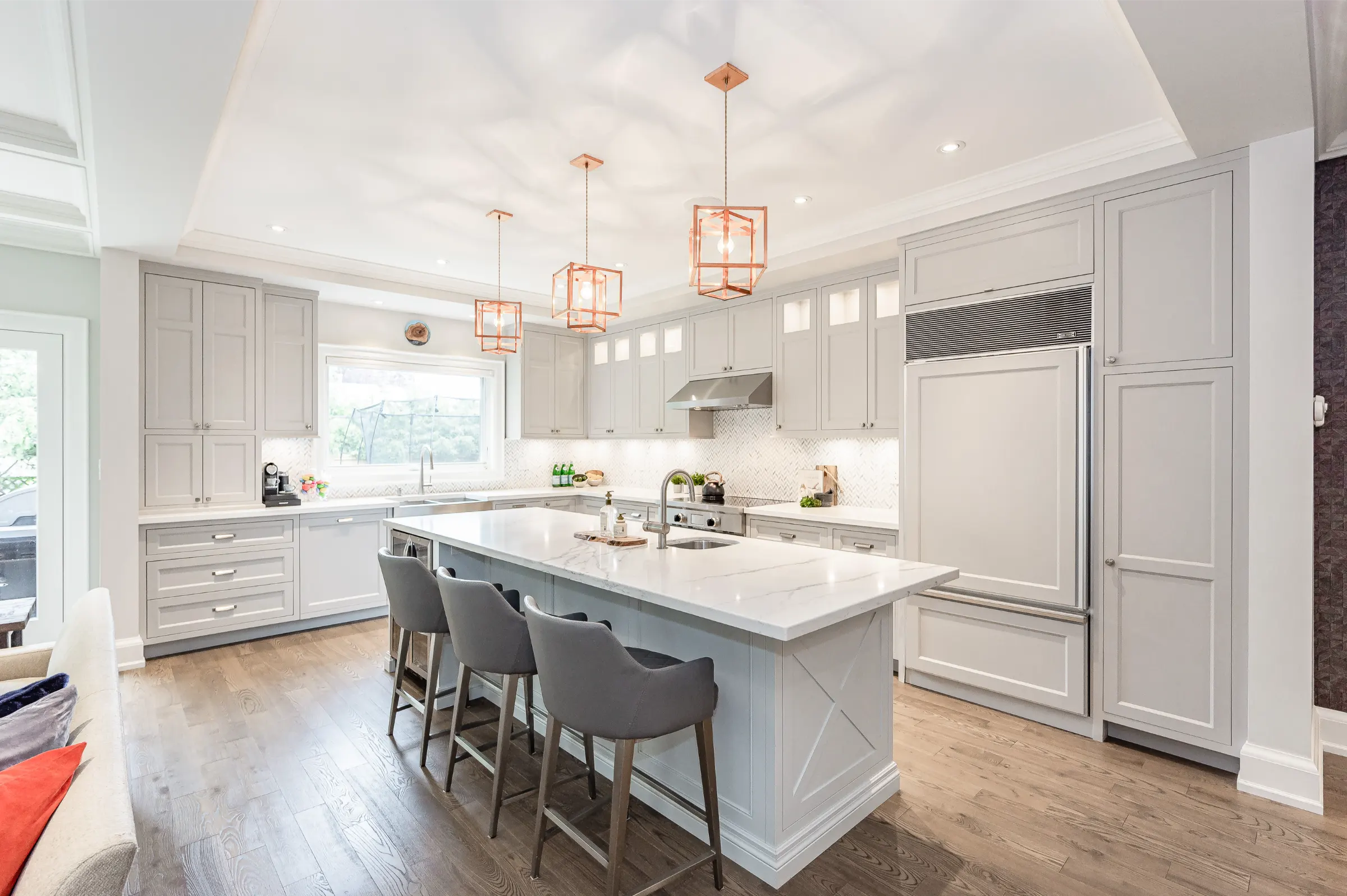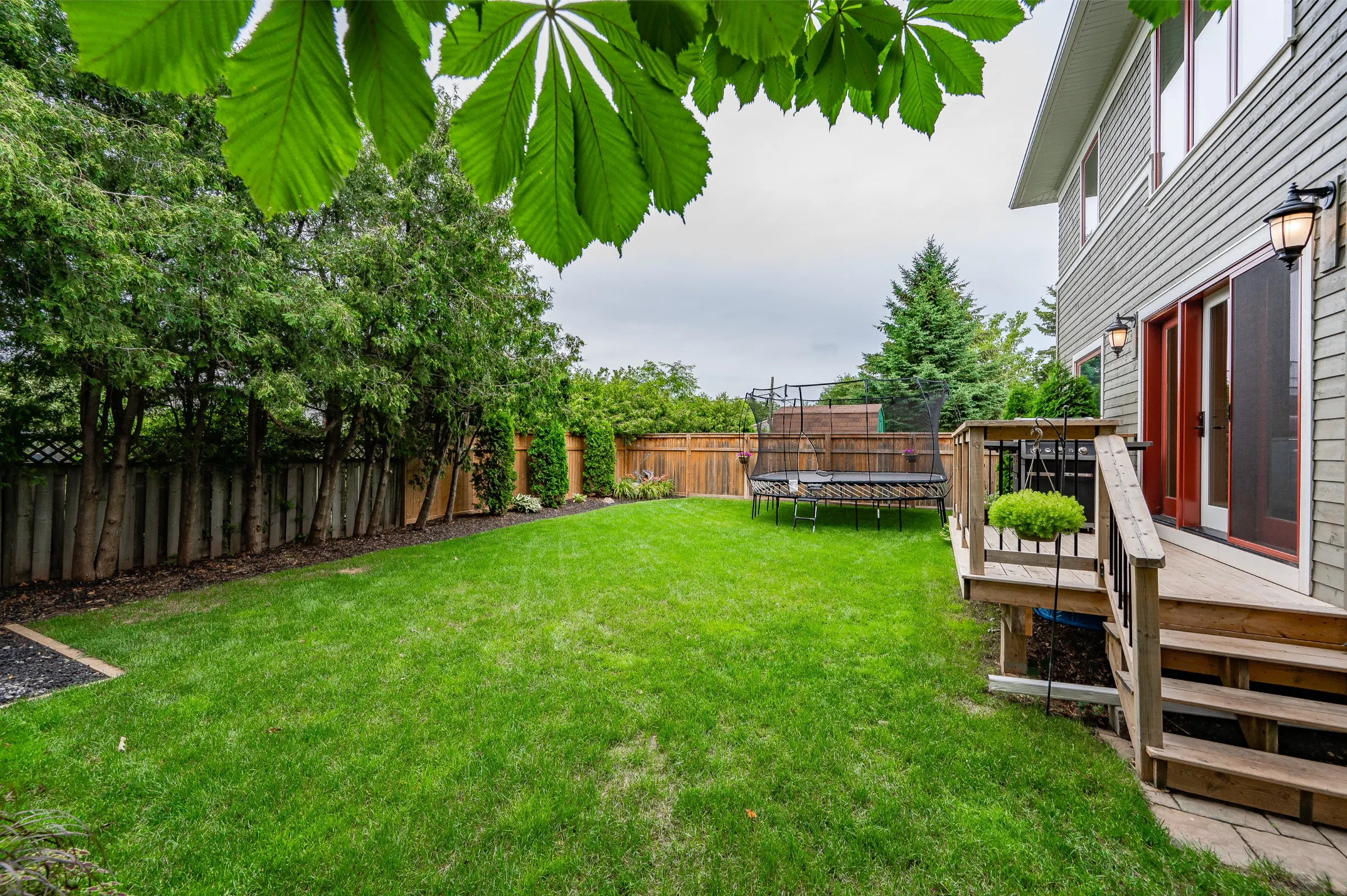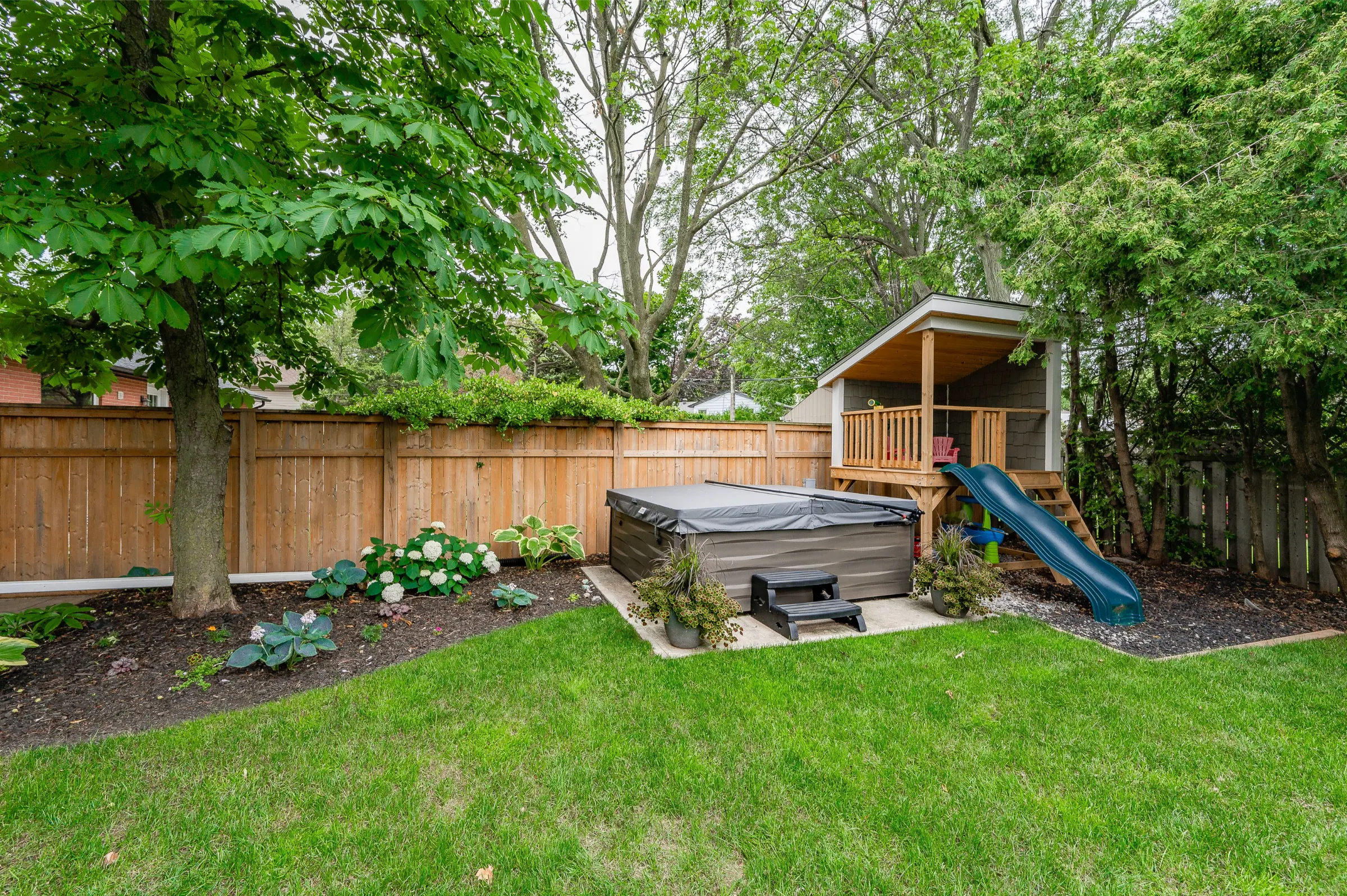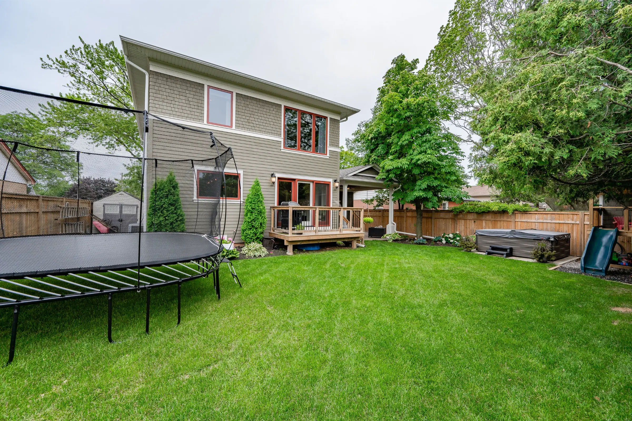 Spectacular custom chef’s kitchen featuring a large island with breakfast bar, pendant lighting & bar sink, Wolf induction oven, Sub-Zero fridge, Miele dishwasher, touch garbage can, pantry, quartz counters & marble backsplash. Impressive dining room with stylish tray ceiling feature & spacious family room with glass door walkout to the amazing back yard complete with wood deck, private patio with covered portico & children’s playhouse. Convenient den/office with glass doors for privacy, 2-piece powder room & the ultimate mud/laundry room outfitted with custom built-in bench & shelves & walk-out to rear yard & access to garage complete the main level.