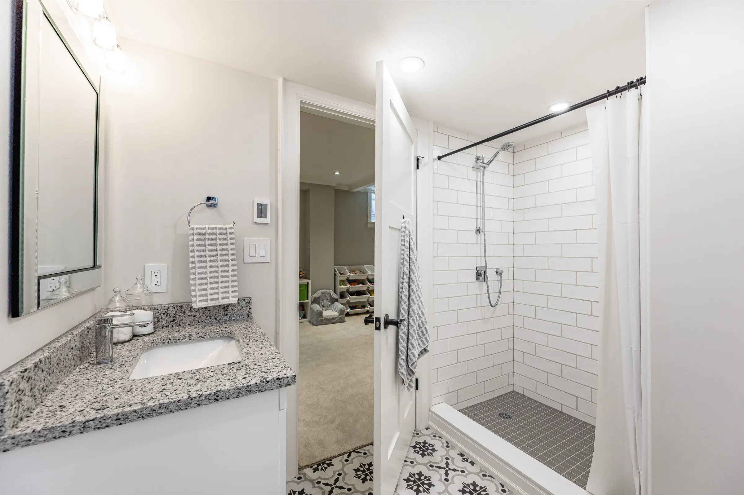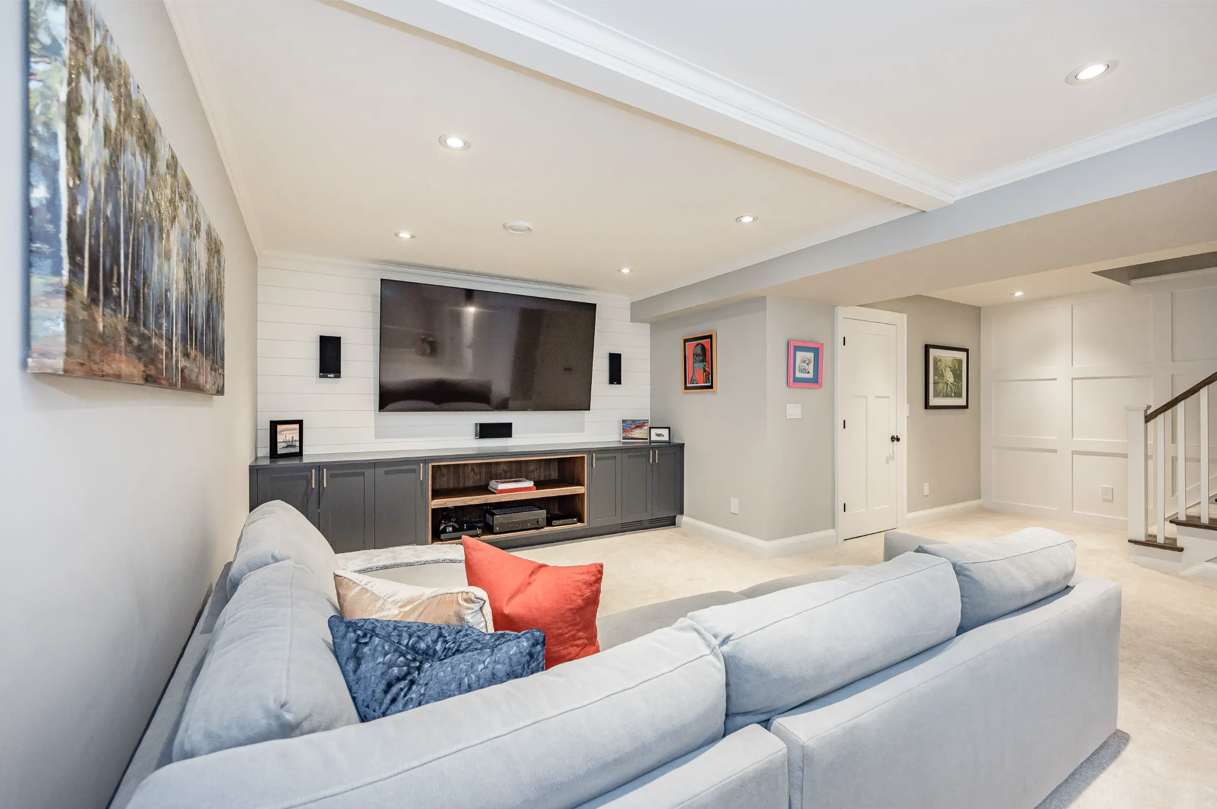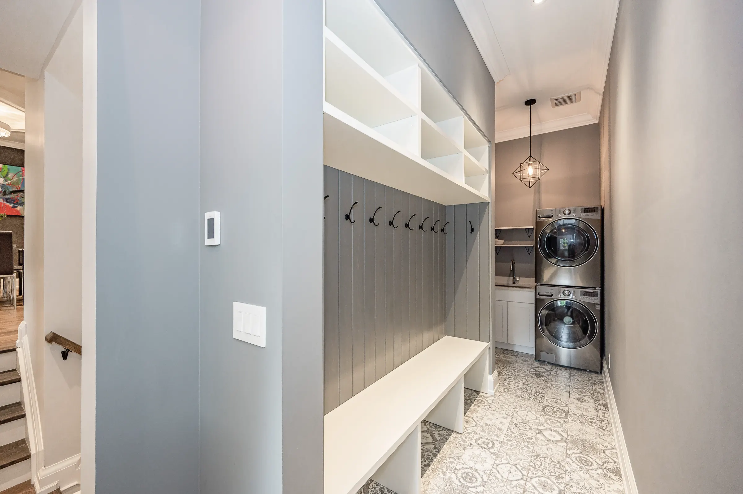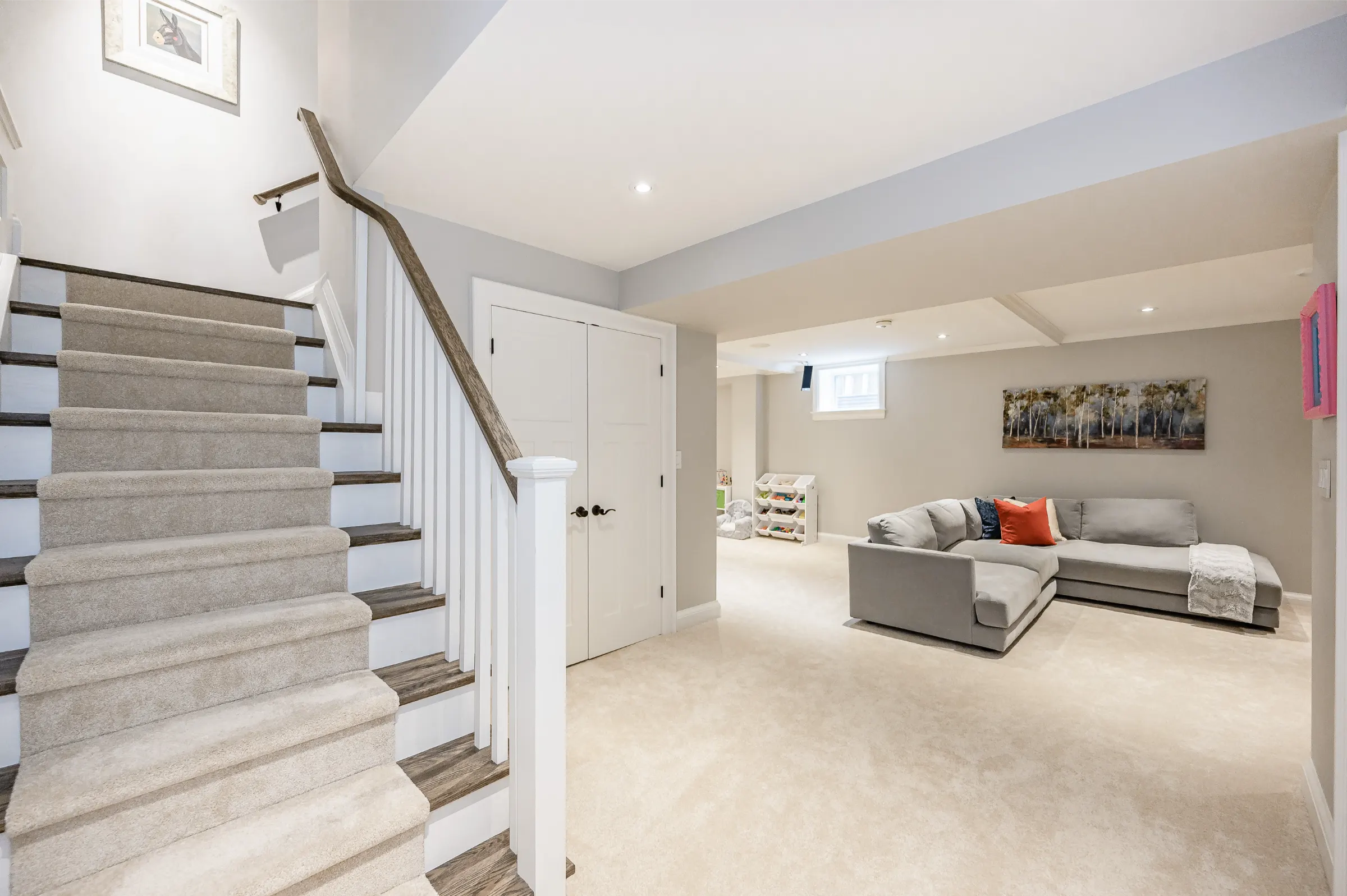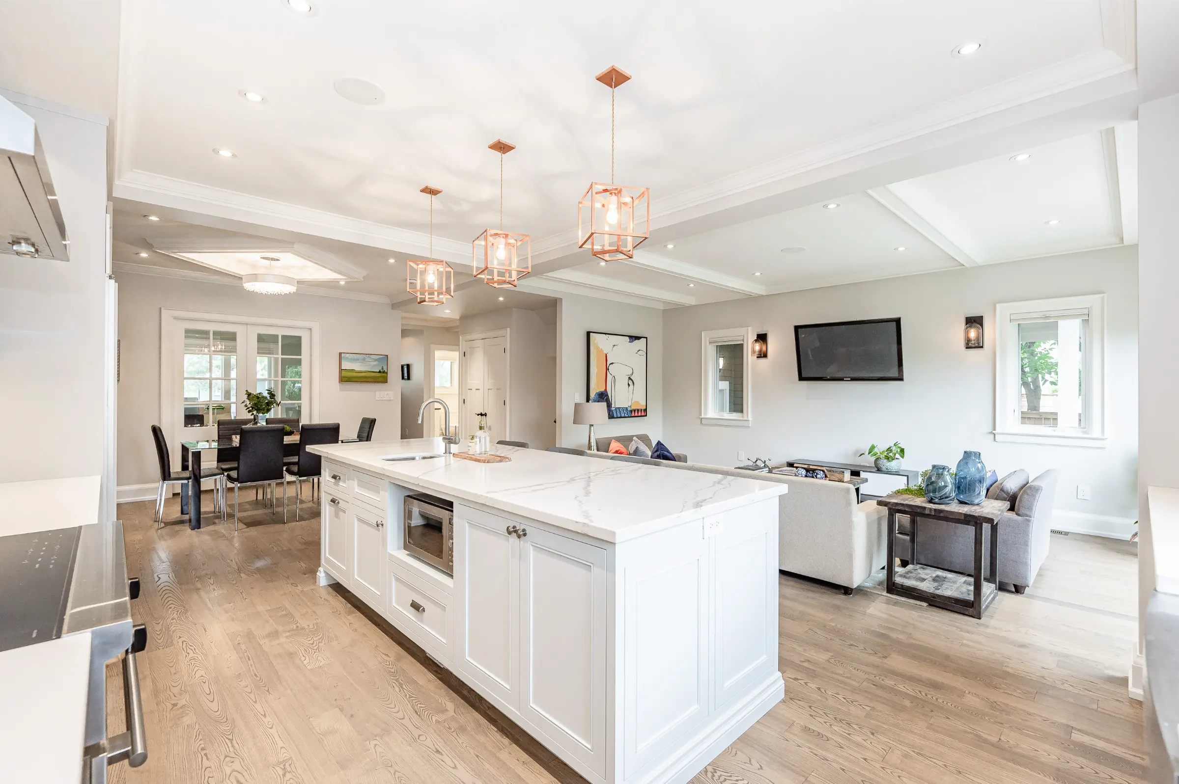 Spectacular custom chef’s kitchen featuring a large island with breakfast bar, pendant lighting & bar sink, Wolf induction oven, Sub-Zero fridge, Miele dishwasher, touch garbage can, pantry, quartz counters & marble backsplash. Impressive dining room with stylish tray ceiling feature & spacious family room with glass door walkout to the amazing back yard complete with wood deck, private patio with covered portico & children’s playhouse. Convenient den/office with glass doors for privacy, 2-piece powder room & the ultimate mud/laundry room outfitted with custom built-in bench & shelves & walk-out to rear yard & access to garage complete the main level.