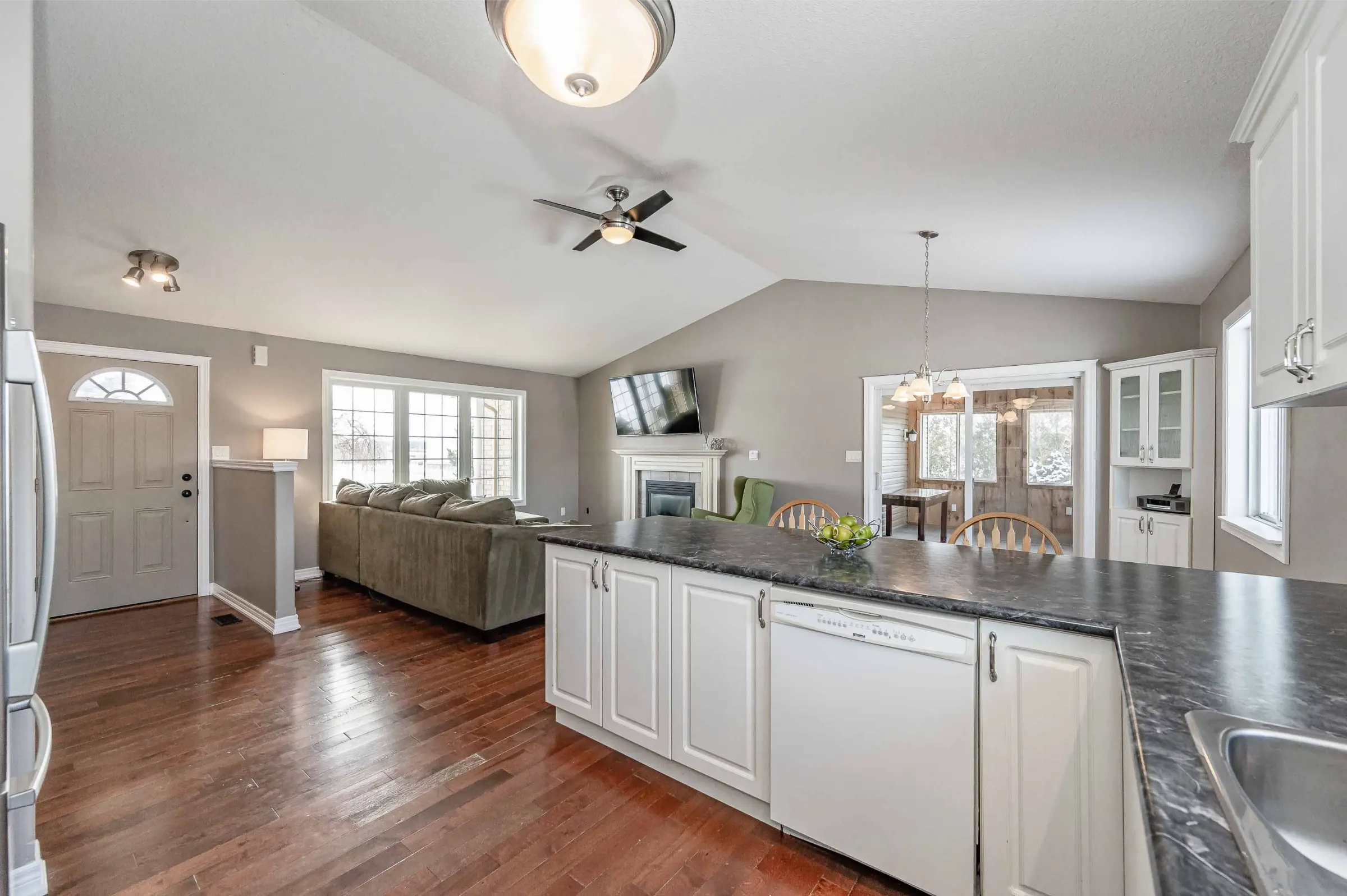 Stylish brick exterior façade with inviting walkway to the covered front porch. The combined open concept plan with hardwood floors throughout is configured perfectly for entertaining & everyday family life. Large kitchen featuring ample white cabinetry and breakfast bar & dining area filled with an abundance of natural daylight boasting ample windows & walkout to sunroom & private tree covered back yard. Living room boasting large picture window, vaulted ceiling, gas fireplace & ceiling fan.