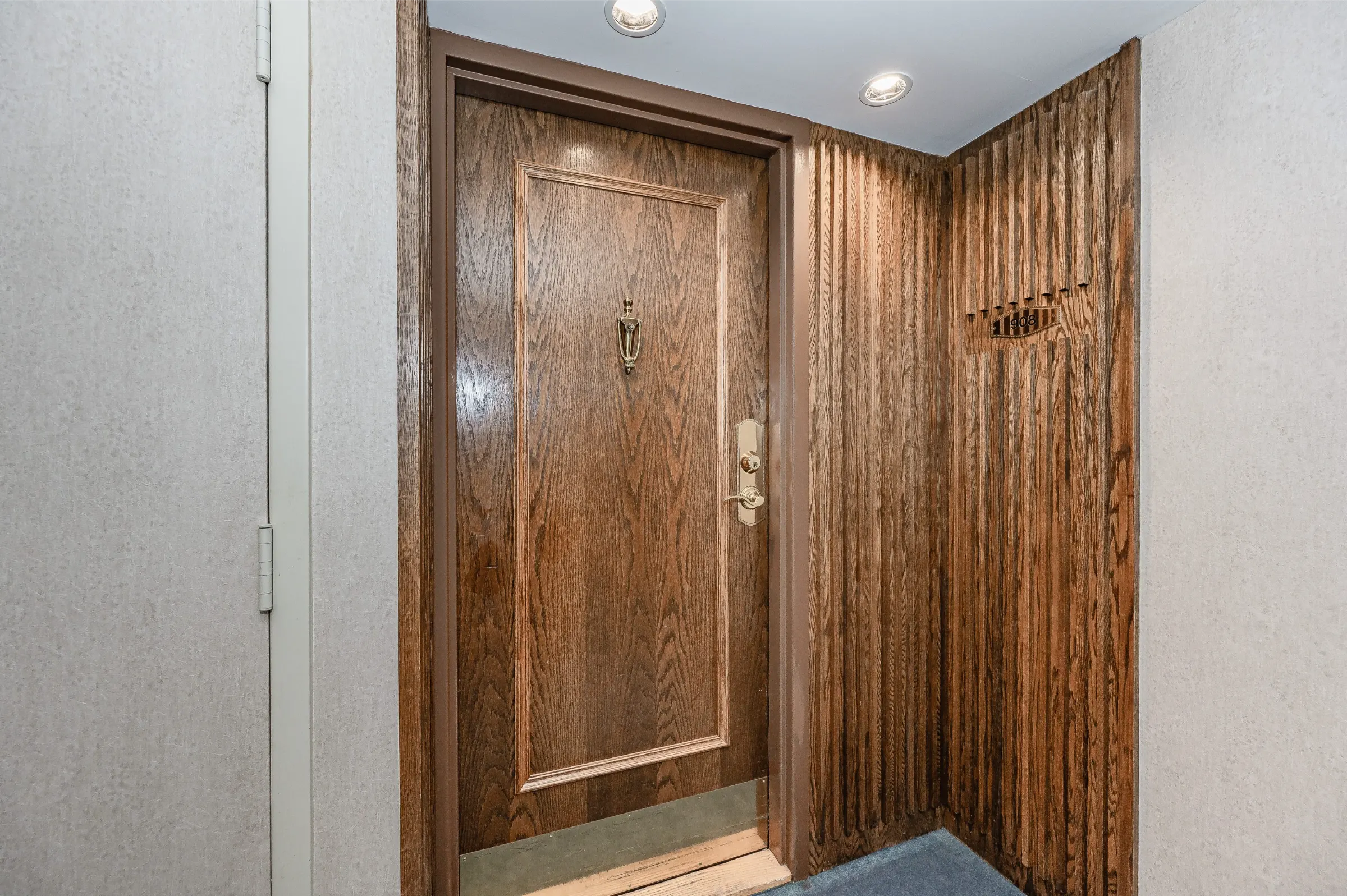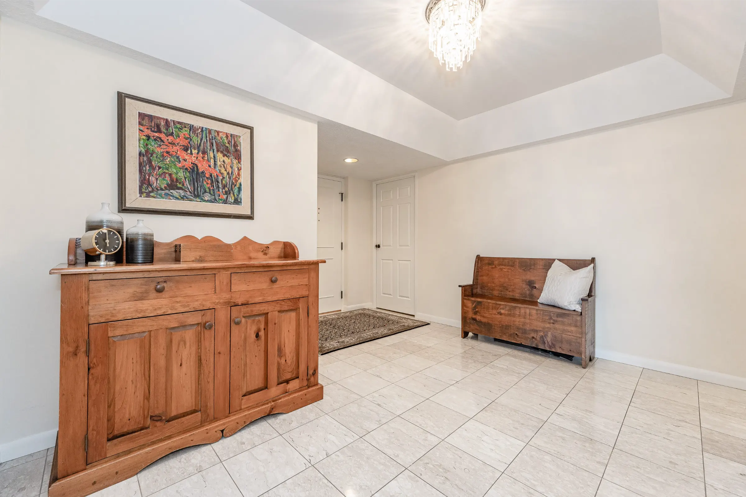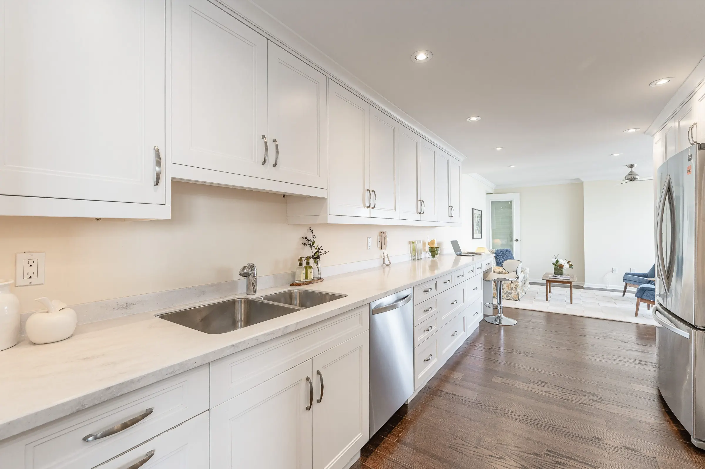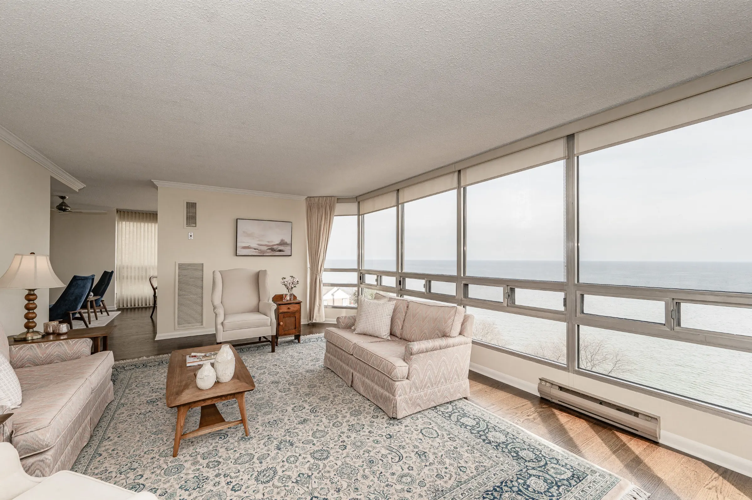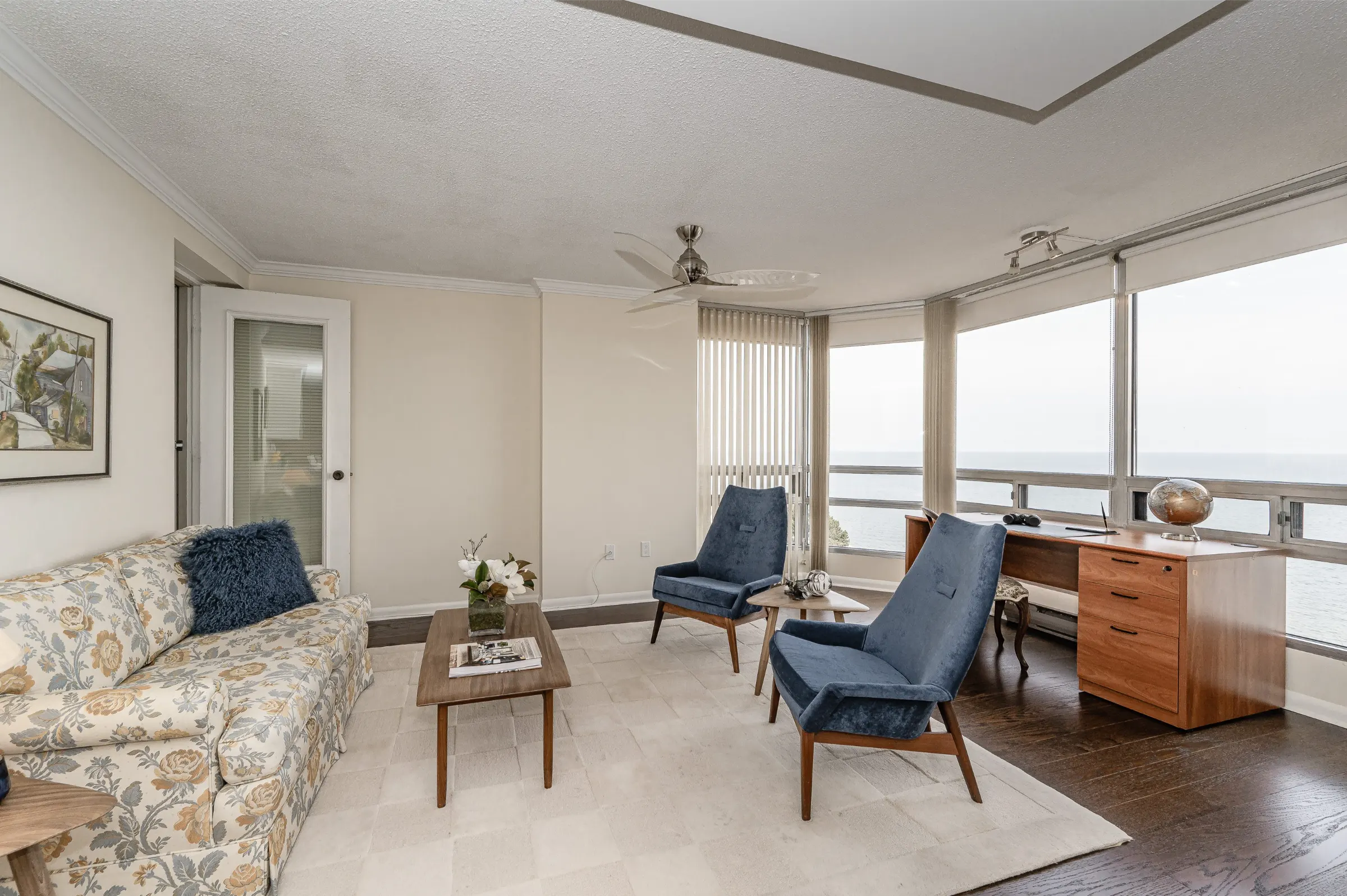 The welcoming generous foyer provides a large walk-in closet and leads to the sensational custom chef-inspired kitchen outfitted with ample white cabinetry, pantry, pull out drawers, undercabinet lighting, endless Corian counters, stainless-steel appliances & built-in desk feature. Overlooking the kitchen is a spacious open concept den with a walkout to the large balcony highlighting tranquil views of Lake Ontario & manicured gardens. The sophisticated dining room is adjacent to the formal living room, both with wall-to-wall windows presenting exceptional lake views.