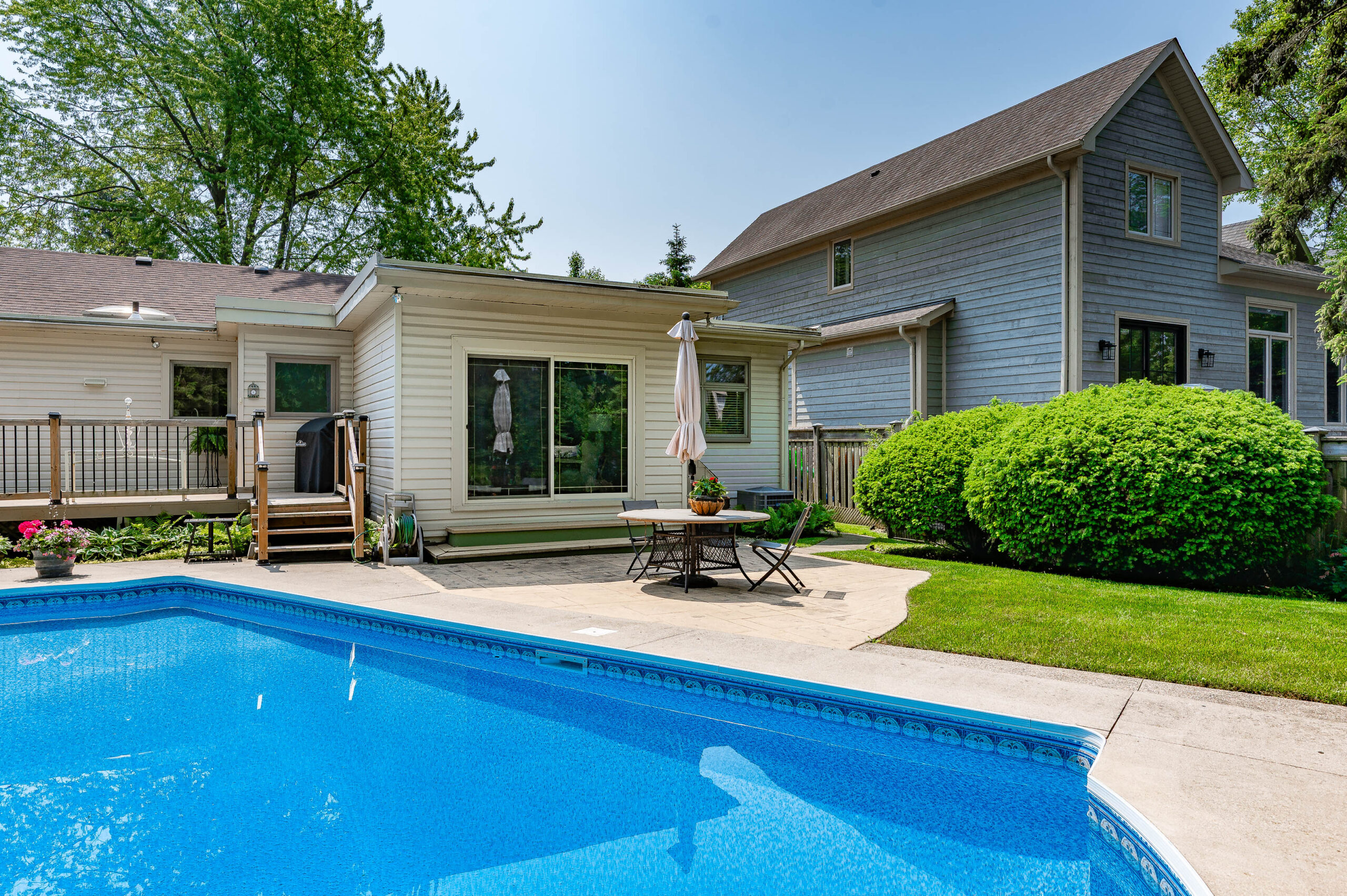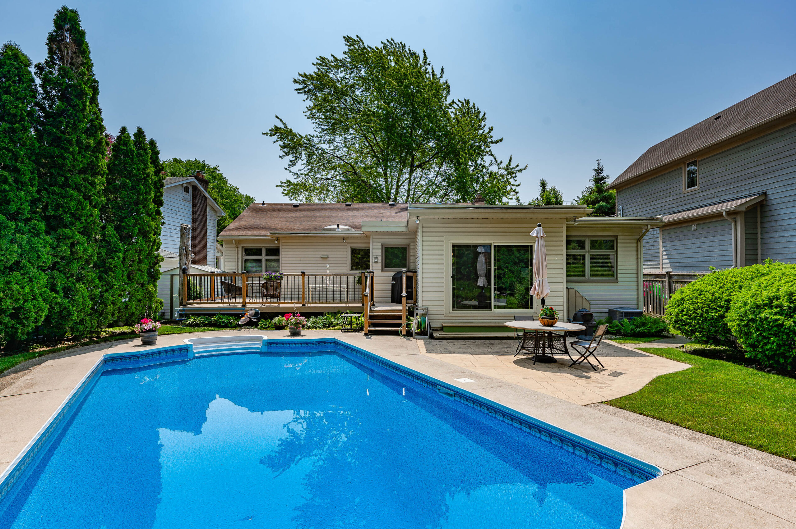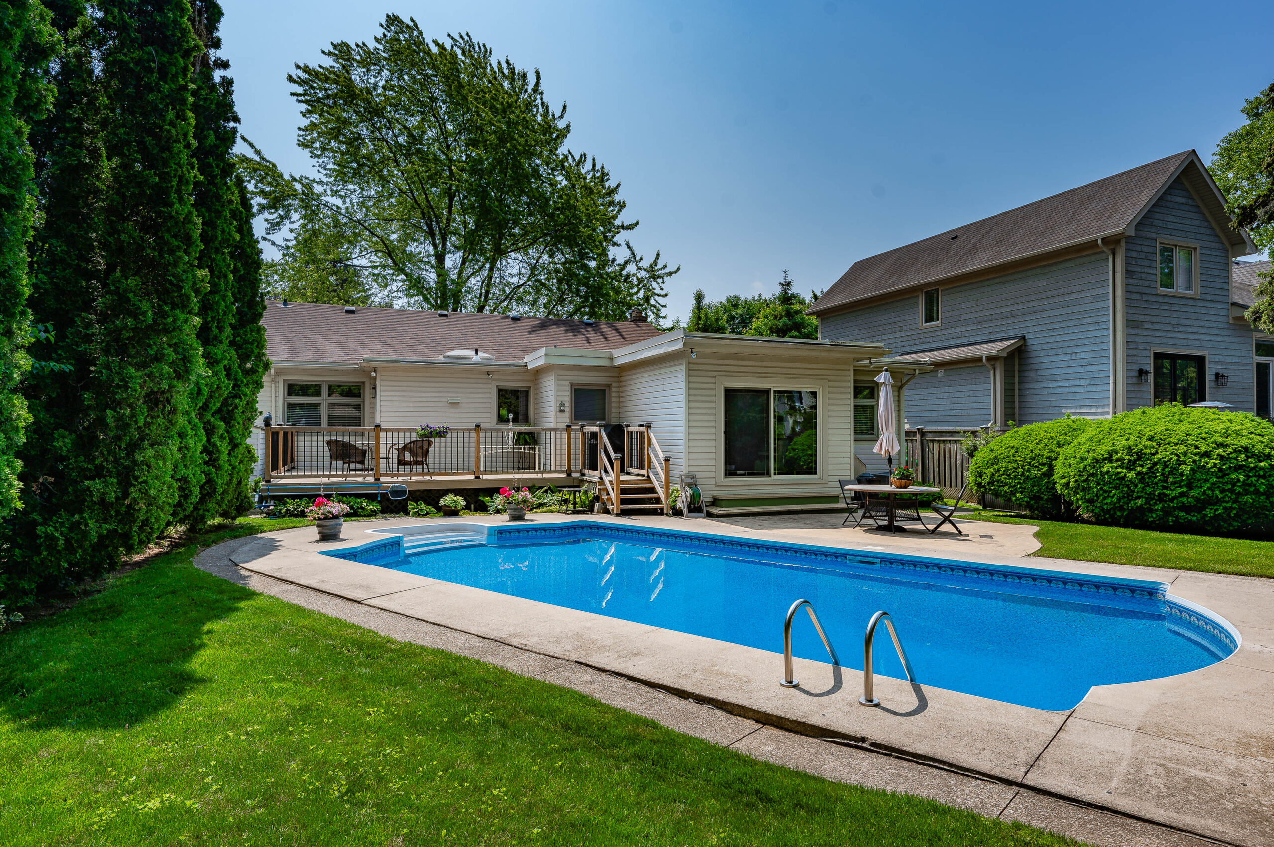 Step inside and discover a home that exudes warmth and atmosphere. The well-equipped kitchen features a skylight that fills the room with natural light, along with an abundance of cabinets, pull out drawers, built-in shelves and quartz counters. The walkout leads you to the private backyard complete with an inground pool, patio, large deck, and lush landscaping – a perfect setting for both entertaining and relaxation.