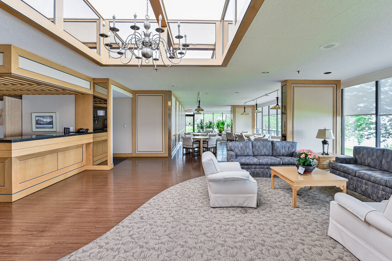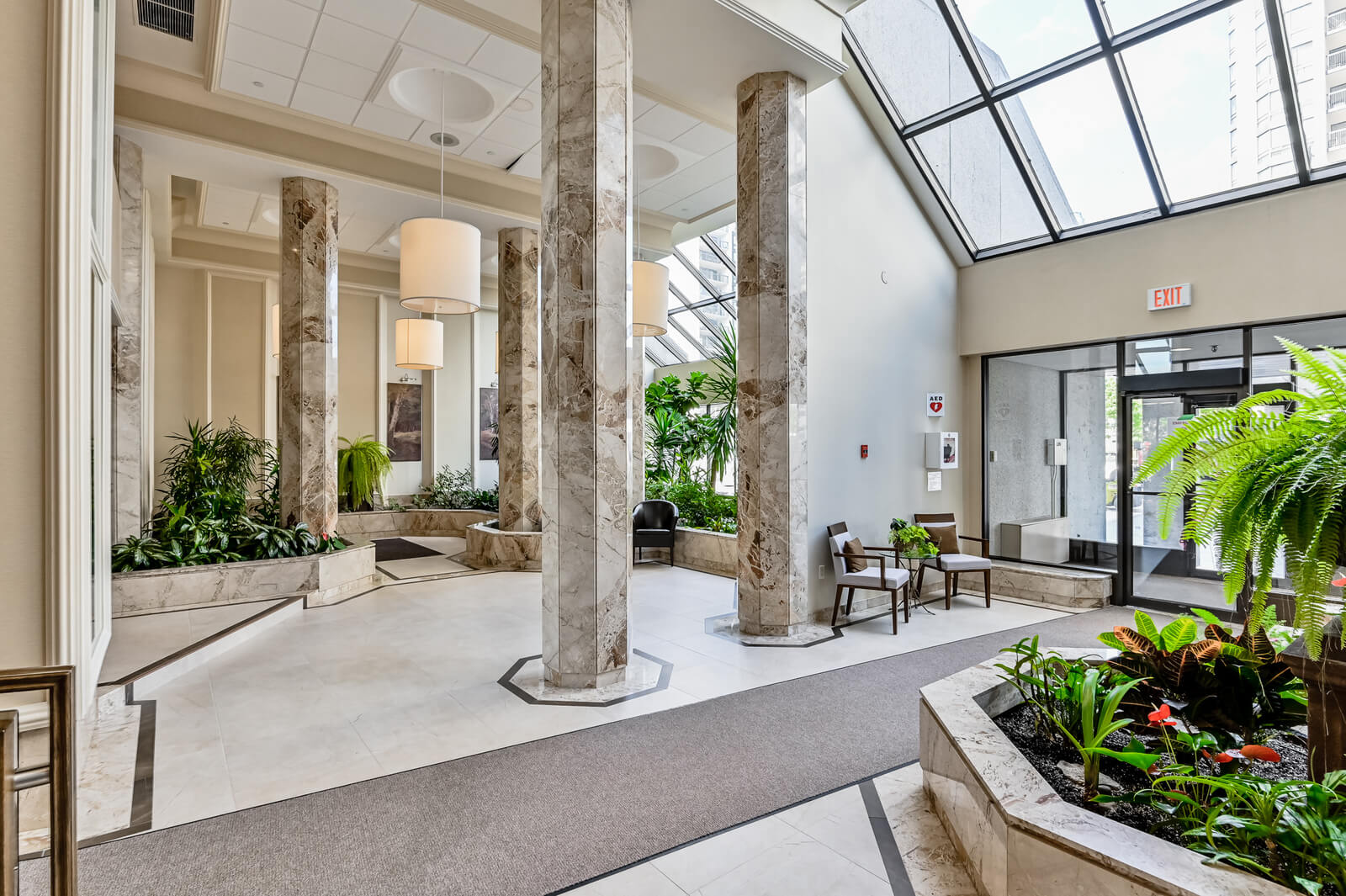 Impressive atrium-style lobby with marble columns and professionally maintained interior gardens.