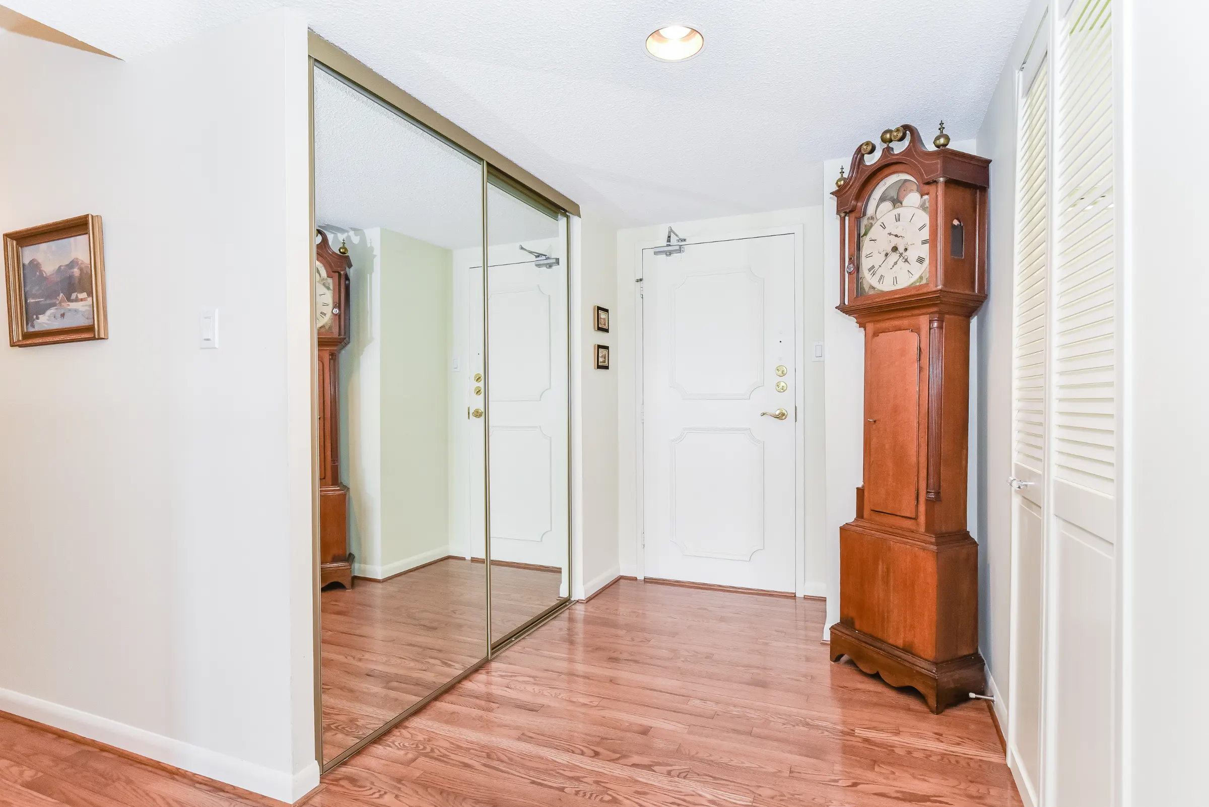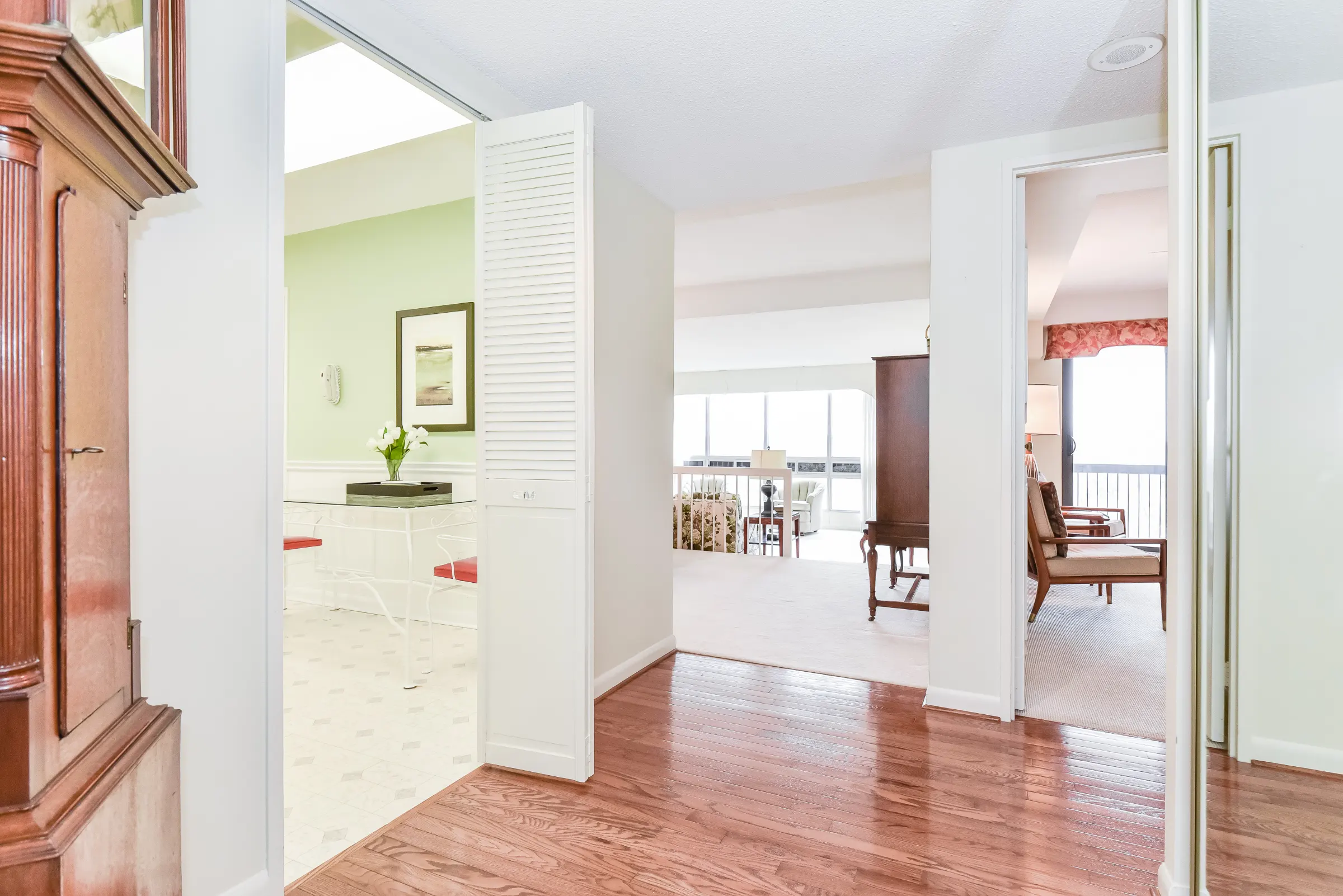 Inviting large foyer with lustrous hardwood floor and double mirrored sliding closet doors leads into the well designed layout with generous sized rooms. Bright eat-in kitchen features white cabinetry with ample cabinets & pantry, modern white back splash and bifold doors. Entertainment size dining room overlooking the formal living room with floor to ceiling windows with walk out to the balcony and gorgeous open views of treetops and the Niagara Escarpment.