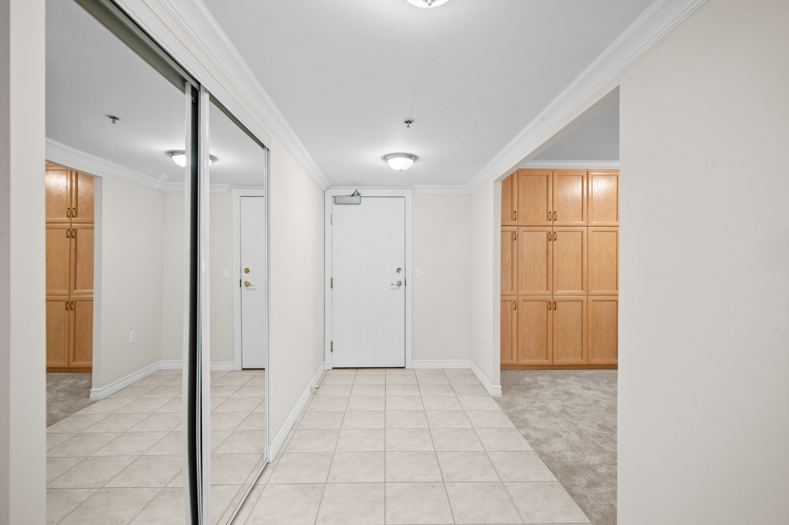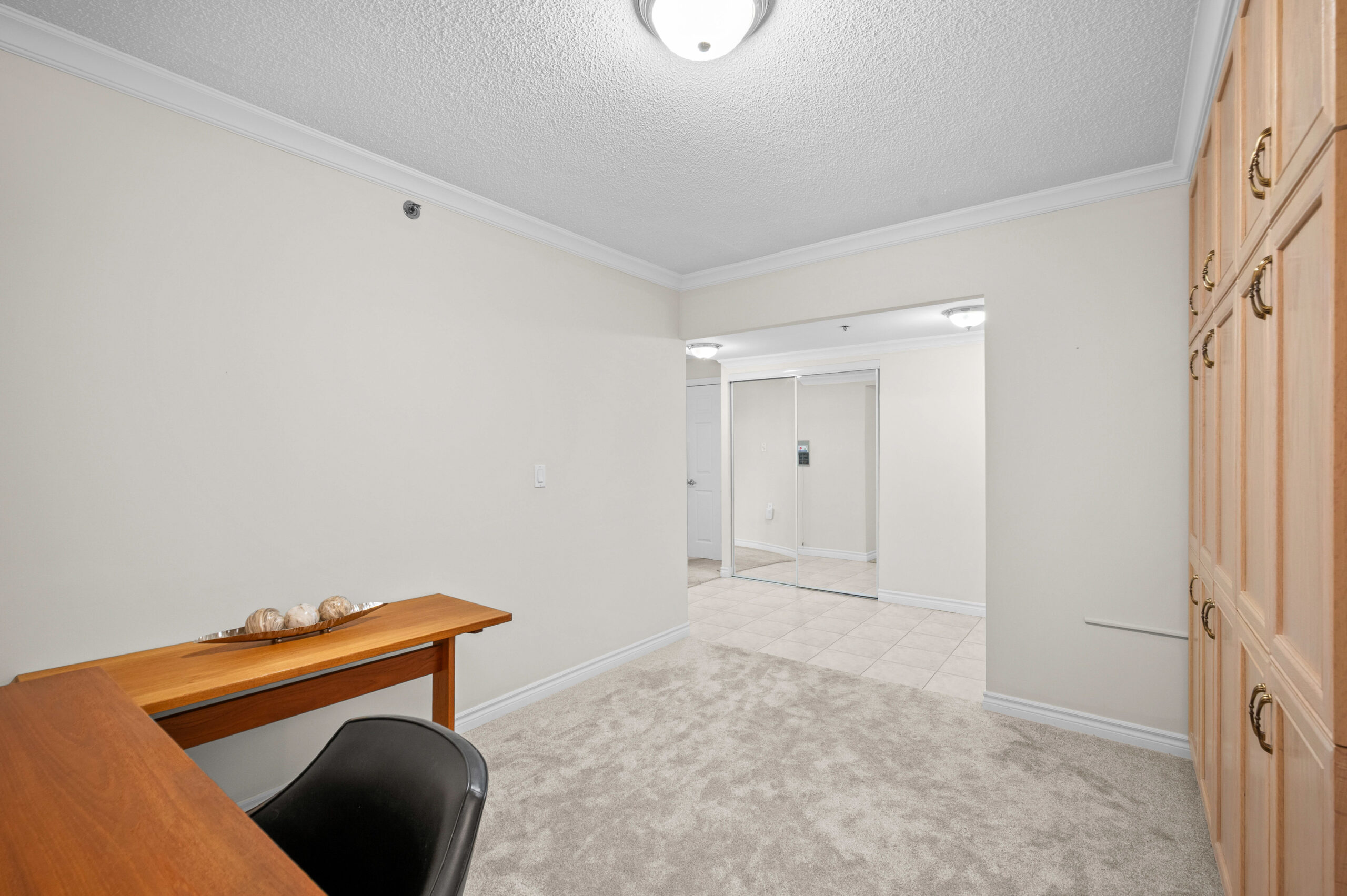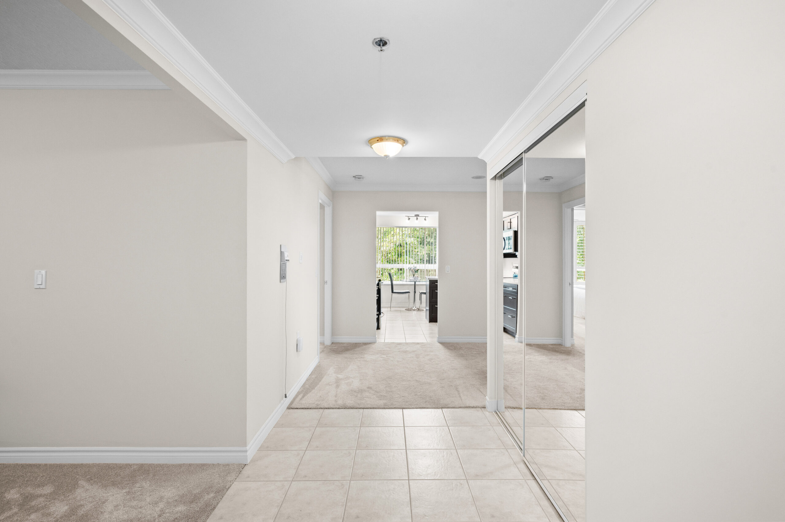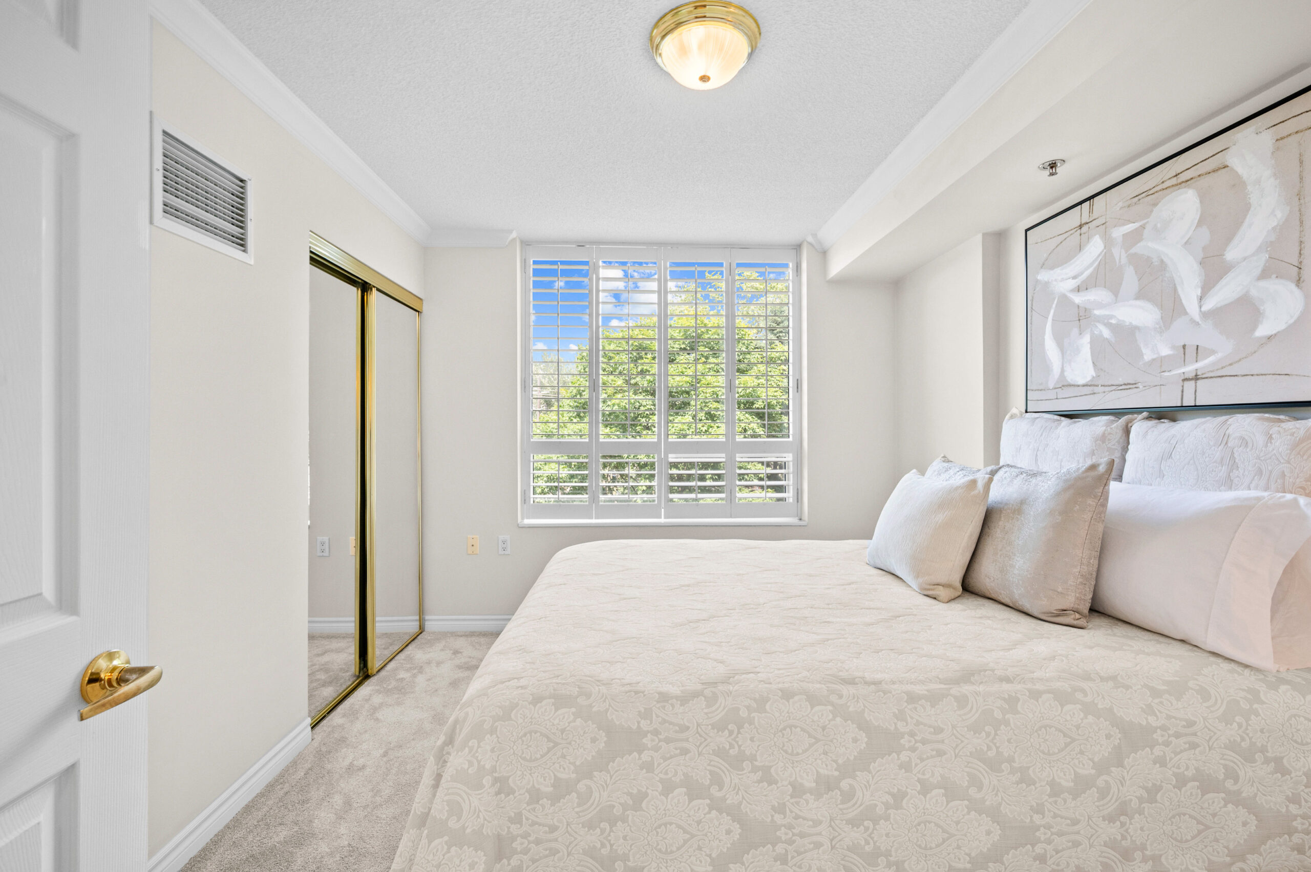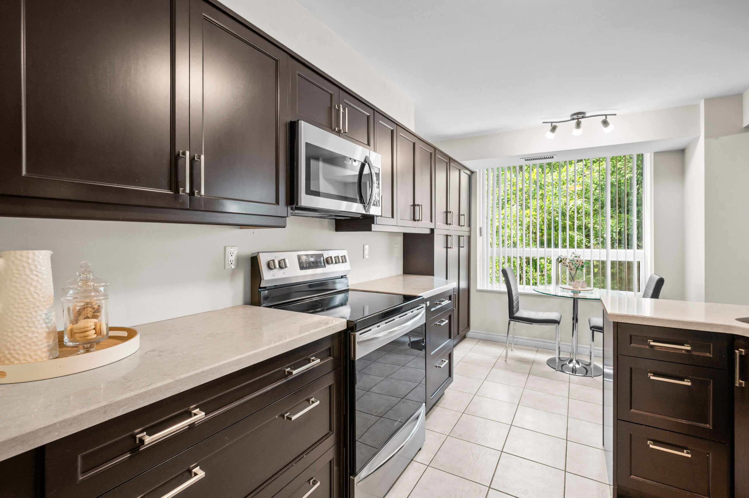 As you enter, you’re greeted by a spacious foyer leading to the heart of the home. The stylish kitchen is a standout, featuring stainless steel appliances, an abundance of cabinetry, ample pantry space, sleek quartz countertops and breakfast area. The expansive dining room seamlessly flows into the large living room, which boasts large windows, California style shutters, and a walk-out to a private balcony offering serene views of lush gardens and trees. The versatile den makes for an ideal home office, tv room, or hobby space.
