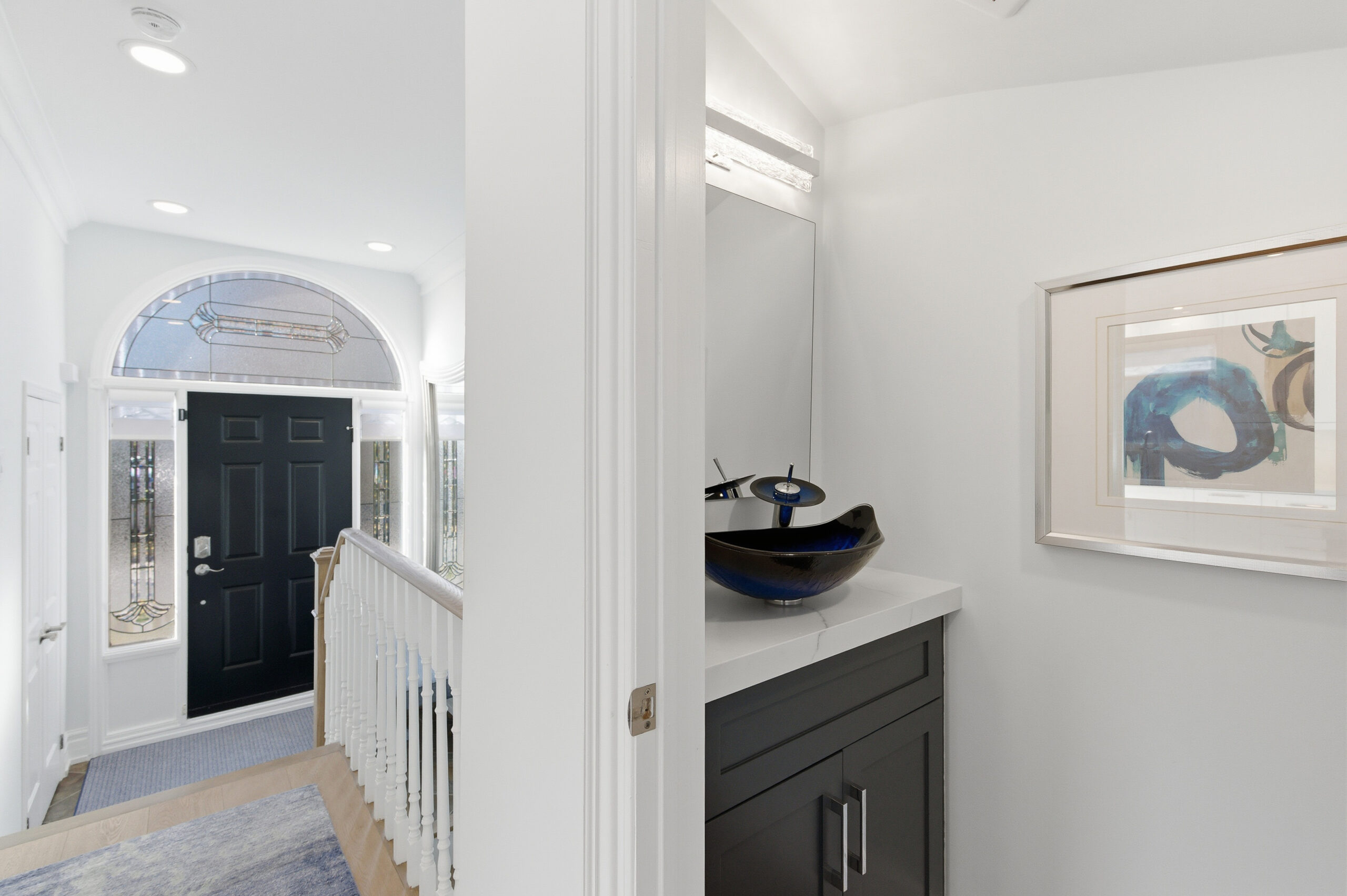The chef inspired kitchen with breakfast area is a showstopper, complete with high-end stainless-steel appliances, ample cabinetry & pull-out drawers, a double pantry, porcelain countertops & backsplash, & a custom peninsula with double-sided storage. The formal dining room seamlessly connects to the spacious living room, which features a custom oversized patio door leading to a substantial outdoor deck—perfect for entertaining or everyday enjoyment. A chic powder room completes this level.