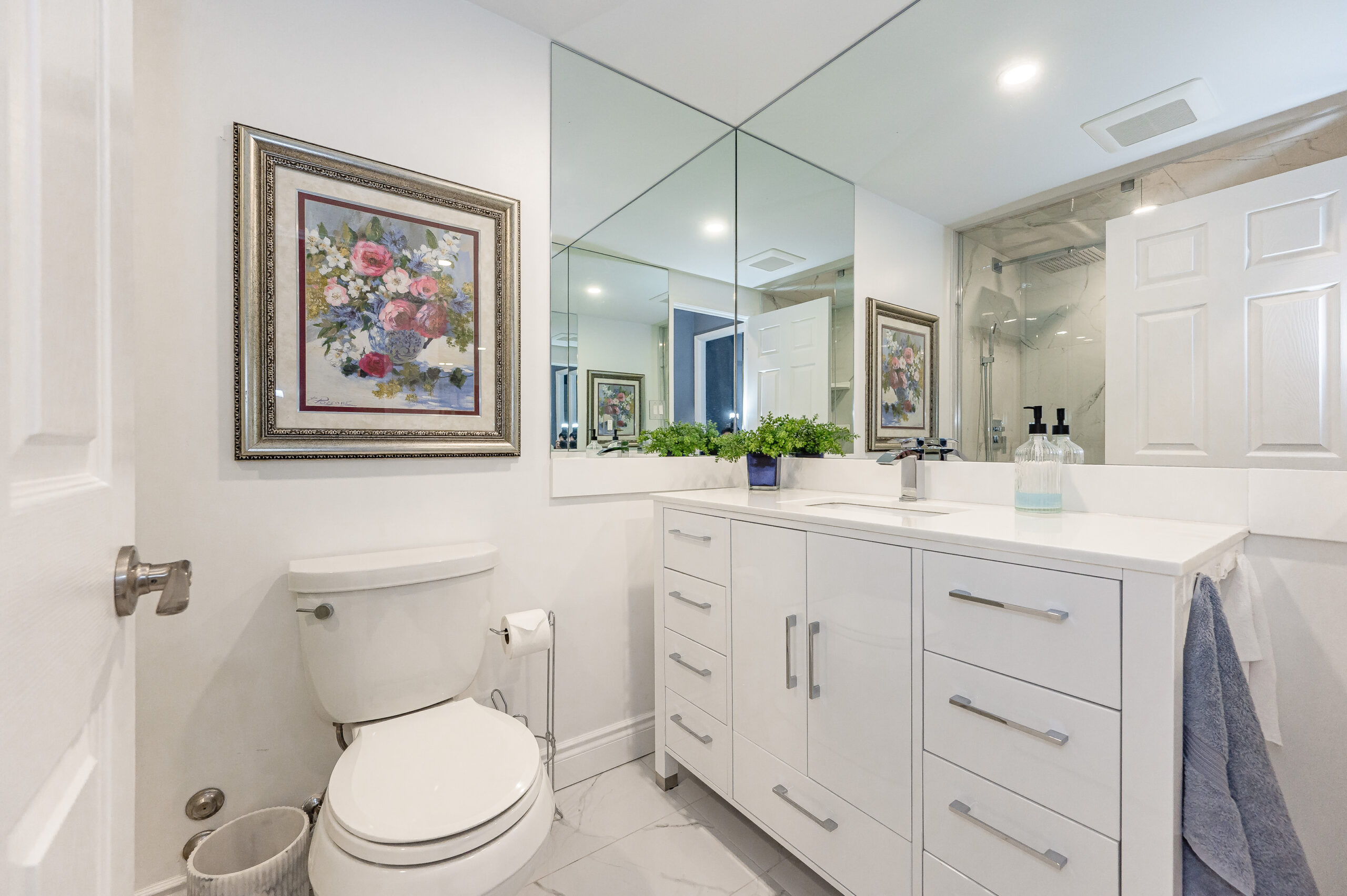 The inviting, spacious foyer leads to the fabulous custom chef inspired kitchen featuring ample white cabinetry, pull out drawers, glass door cabinets, pantries, quartz counters & backsplash, undercabinet lighting, stainless-steel appliances & breakfast room. The sophisticated dining room with wall-to-wall windows overlooks the open concept living room with a walk-out to the X-large balcony, perfect for everyday life & entertaining. Private primary bedroom sanctuary with beautiful built-in cabinetry, mirrored closets & glass sliding door walkout to the balcony. The stunning lavish 4-piece ensuite offers a customized walk-in tub. Generous 2nd bedroom & fabulous spa like 3-piece main bathroom featuring a glass door walk-in shower. Handy cozy den & sizeable laundry room with storage. One owned underground parking space & exclusive use locker.