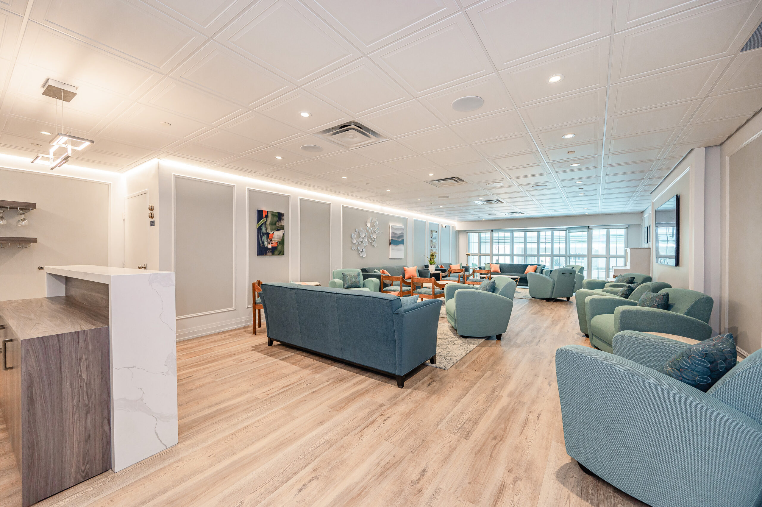 Upon entering, you’re greeted by a spacious foyer that leads to a chef-inspired kitchen, complete with an abundance of white cabinetry, pull-out drawers, a glass-front cabinet, quartz countertops, a modern backsplash, under-cabinet lighting, stainless steel appliances, and a central island offering ample storage. The elegant dining room, separated by a custom glass panel divider, overlooks the open-concept living room, which boasts a walk-out to a large balcony showcasing tranquil lake views—perfect for both everyday living and entertaining.