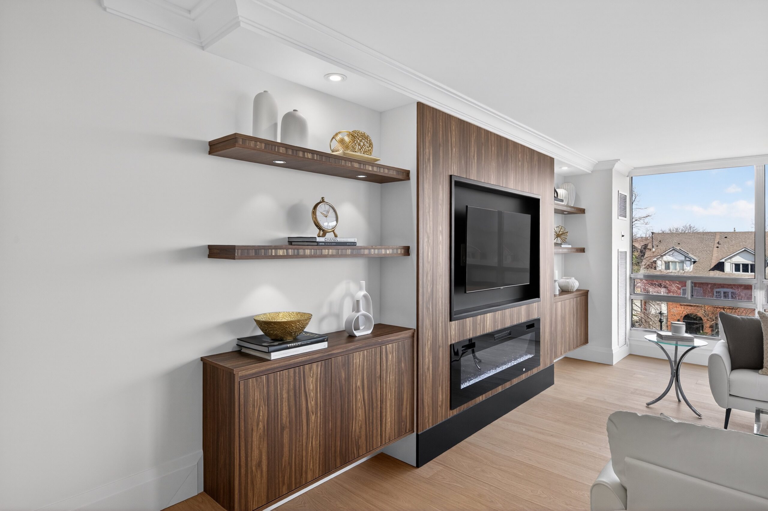 • Statement custom entertainment center with floating shelves, cabinetry, TV niche (up to 65”) and Dimplex electric fireplace (1500W) featuring four ambient mood settings