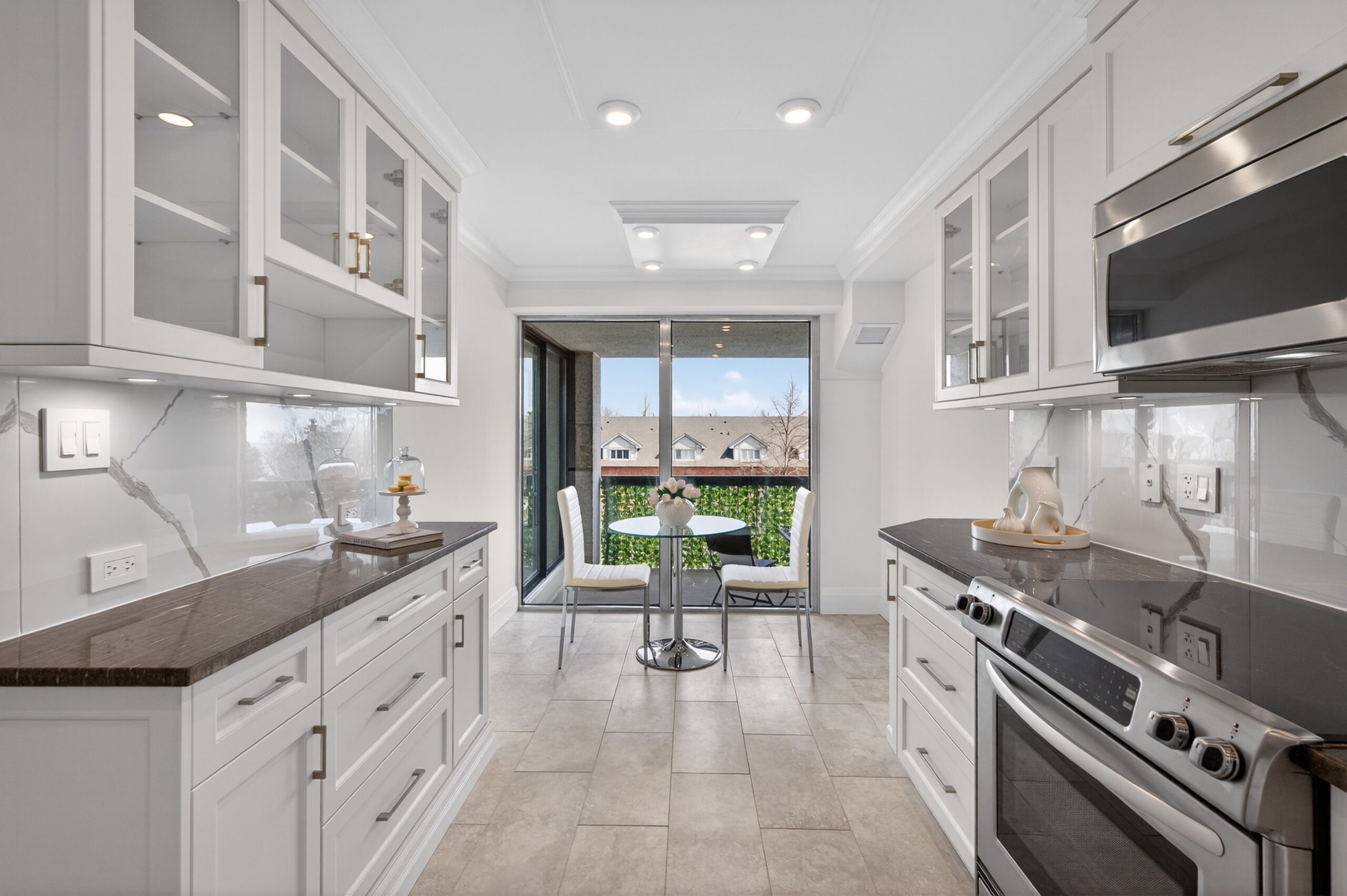 The foyer features an extended-height closet with custom shelving, additional walk-in closet with custom built-ins, and a stylish niche with cabinetry and pot lights. The living room is a standout presenting a custom entertainment unit with floating shelves, a TV niche (up to 65”), and a Dimplex electric fireplace with mood settings. Enjoy floor to ceiling windows and a walk-out to the balcony. The kitchen is outfitted with custom white shaker cabinetry with glass doors and pull-outs, granite counters, porcelain backsplash, under-cabinet lighting, stainless steel appliances, raised ceiling, and porcelain tile flooring.