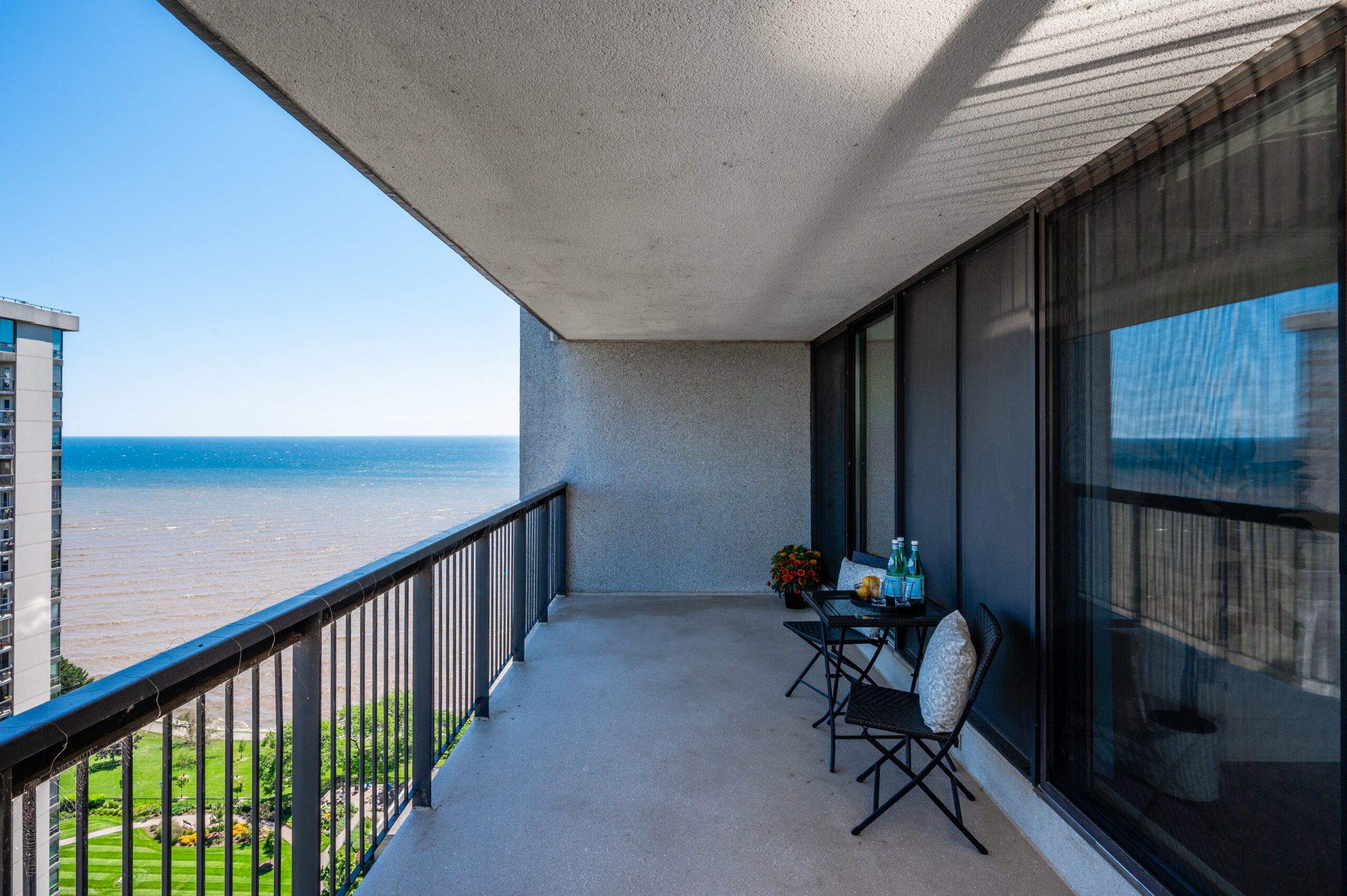 Experience the stunning vistas of Lake Ontario and the Toronto skyline from this sought-after corner suite offering 1,681 square feet of fabulous, single level living space. Boasting floor-to-ceiling windows and two walk-outs to a spacious balcony, this home offers tranquil eastern views of the lake, city skyline, and meticulously landscaped gardens. The layout includes two bedrooms (split design), two full bathrooms, and a private den. The interior is bathed in natural light, with walls of glass that connect seamlessly to the lake, sky, treetops, and lush gardens, creating a harmonious blend of indoor and outdoor living.