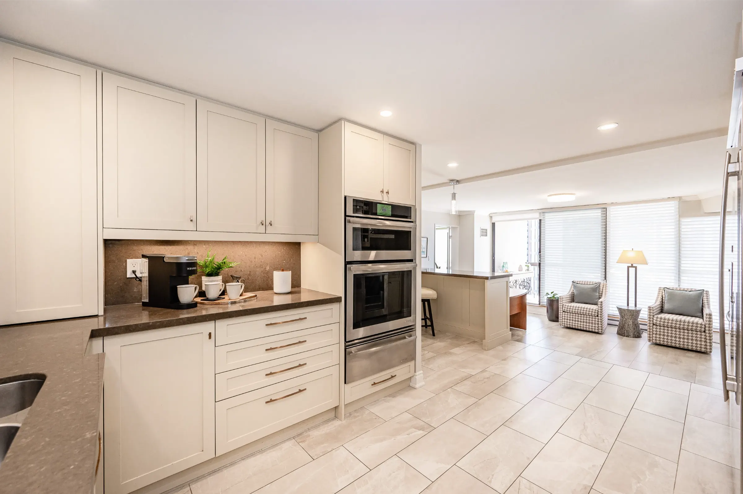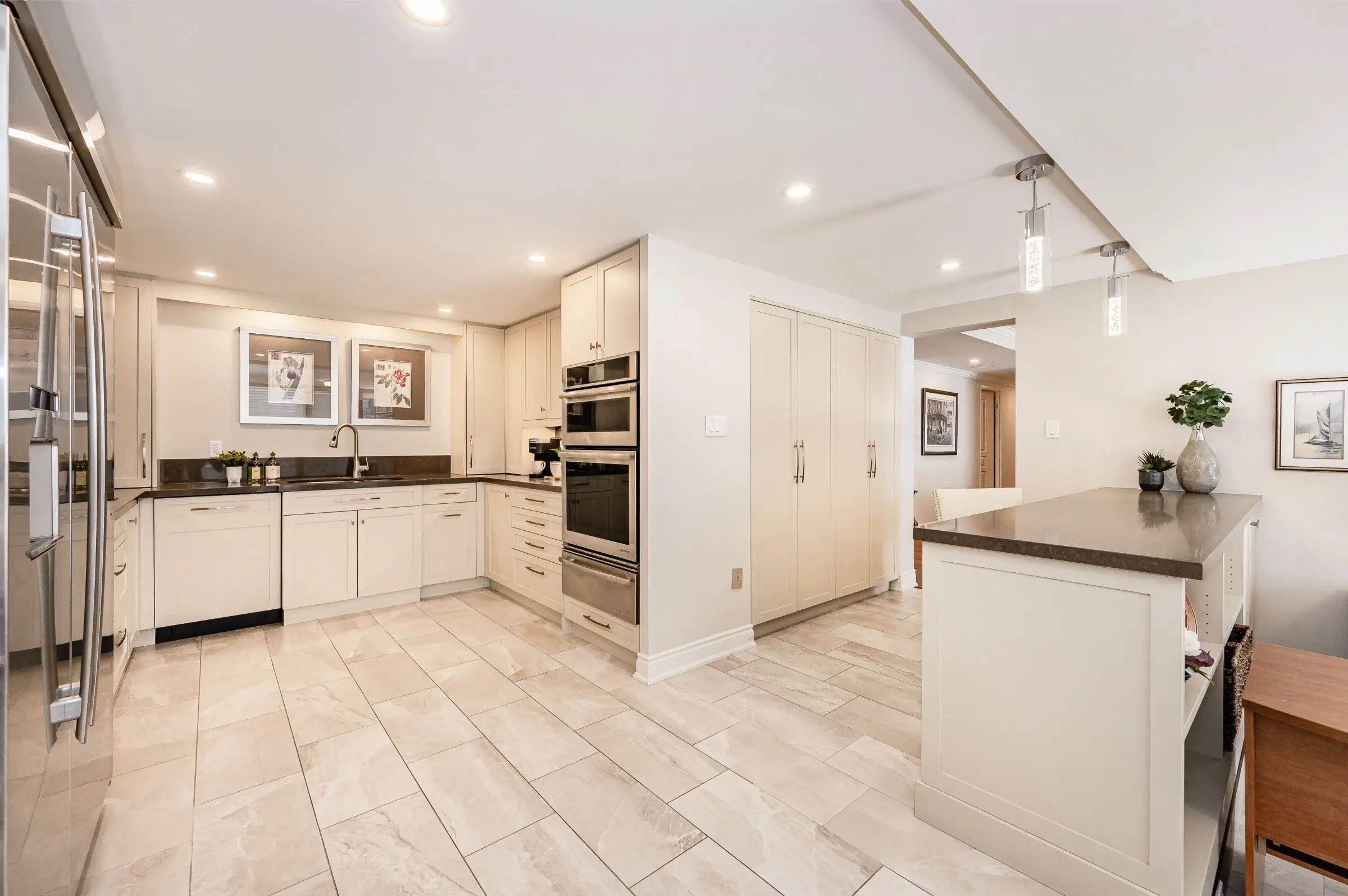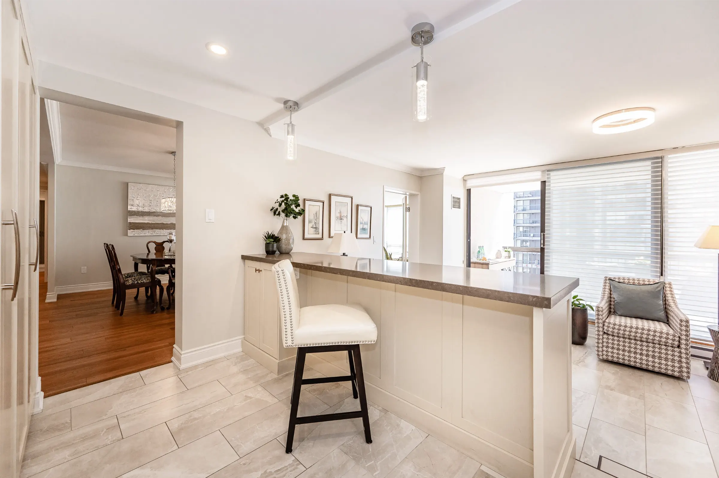 The impressive chef inspired kitchen offers high-end appliances including an induction stovetop, oversized fridge & built-in wall ovens with warming drawer. Equipped with Caesarstone quartz counters & backsplash, kitchen pantry/storage closet, beverage centre with bar fridge & built-in wine rack, & breakfast bar with pendant lighting. The open-concept family room overlooks the kitchen & is outfitted with a well-crafted built-in entertainment centre & sliding door walk-out to the generous size balcony.