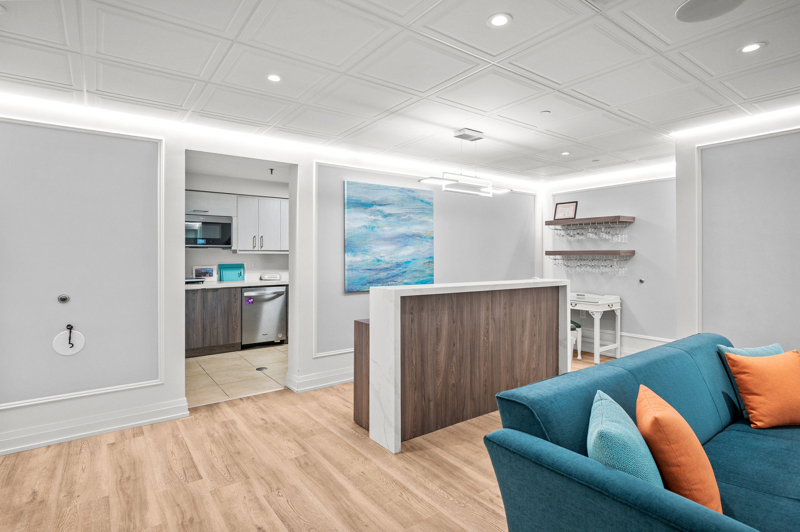 At the heart of the home is the beautiful well-appointed designer kitchen boasting an impressive, coffered ceiling with pot lights, solid maple cabinetry with pull-out drawers, pantry storage, quartz countertops and backsplash, stainless steel appliances, and a convenient centre island with breakfast bar. The open dining area flows effortlessly into the oversized living room, ideal for hosting or everyday life. The versatile den offers flexibility as a home office, TV room, or guest space.